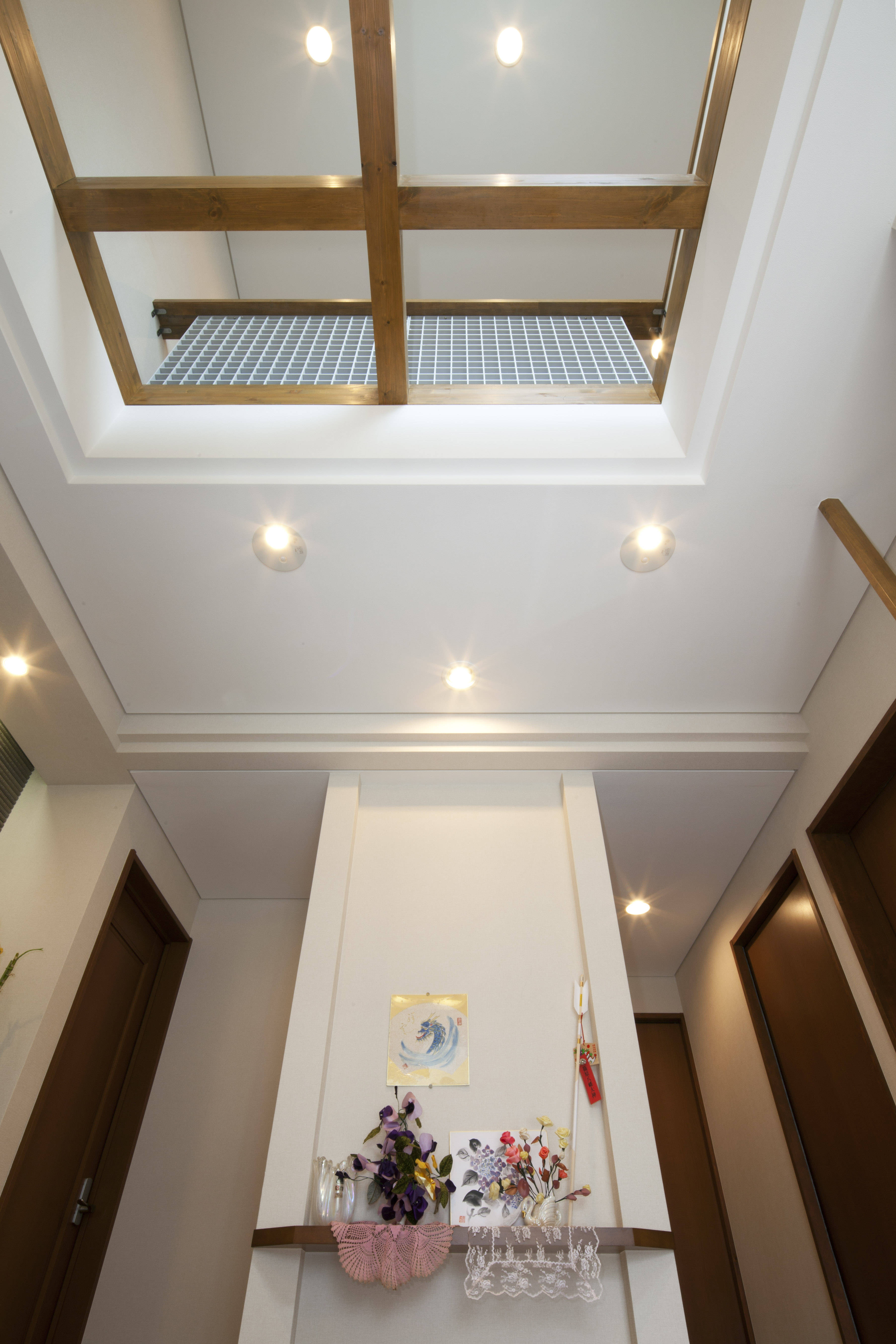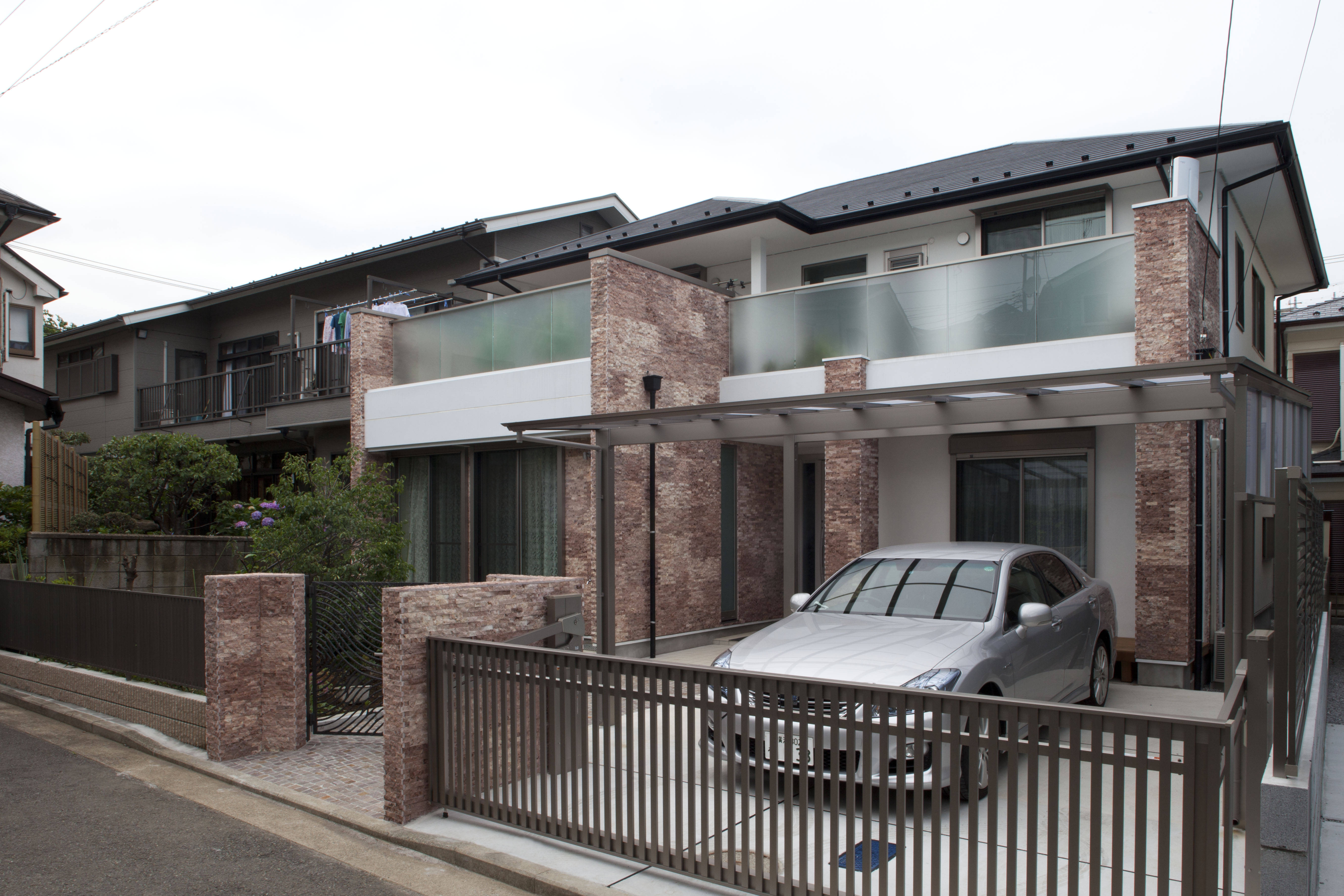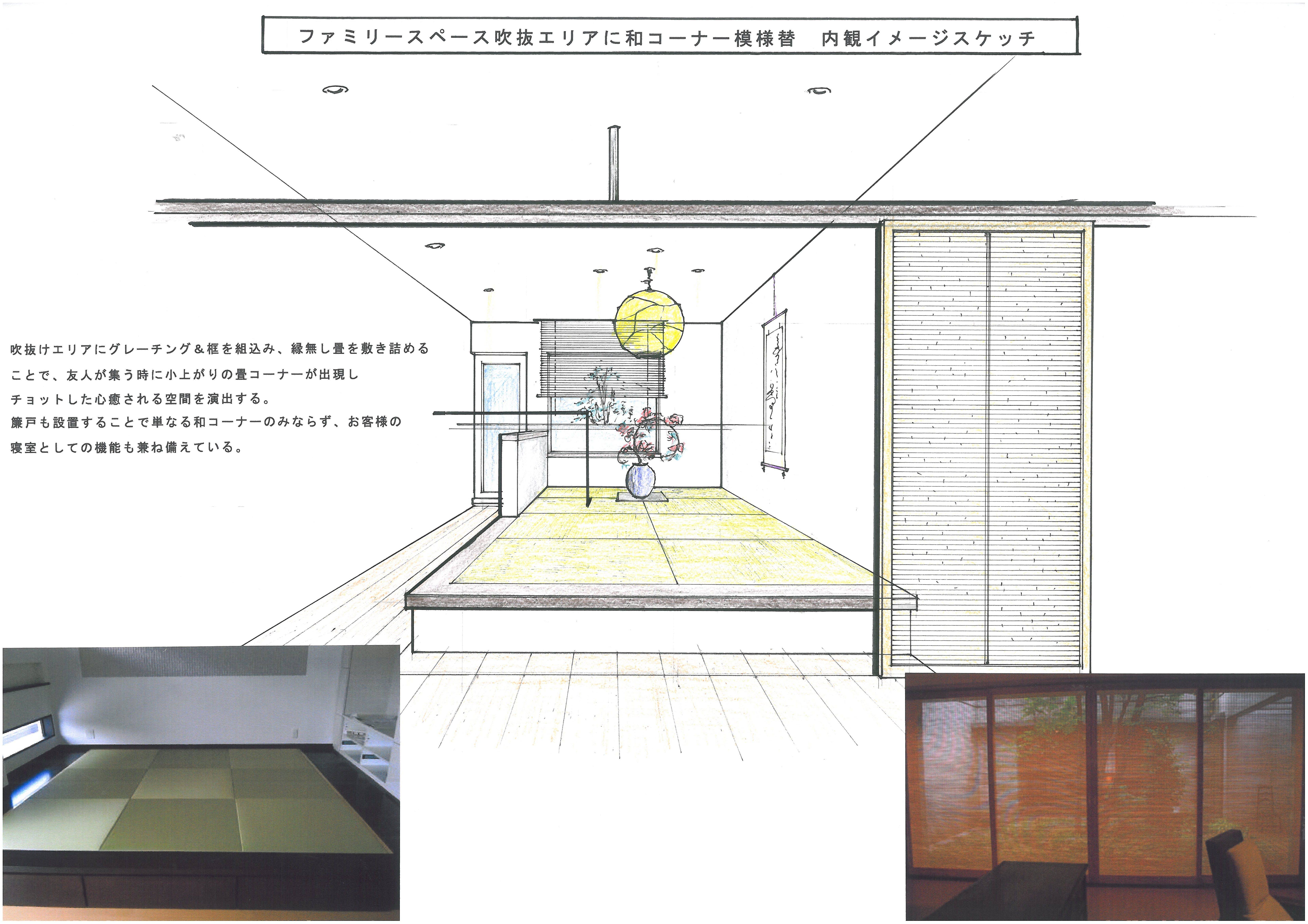 建築に対するご要望はシャープな中に温かみを感じる外観、内部特に玄関ホールはリッチな雰囲気をもった空間にして欲しいという事でした。そこでなるべく余計な要素を消す為にシャッターBOXなどを覆い隠すガルバリウム鋼板をベンダー加工した幕板をファサードに提案。又、バルコニー両サイドの壁に厚味を持たせ天然石を貼り、手摺にはテンパーガラス&アルミFBを設けることでスッキリ納めシャープで温か味の感じらる様に提案。玄関ホールはお母様お手製のインテリアオブジェを飾るスペースとして、それが映える様なギャラリースペースを提案。又、吹抜け上部のハイサイドライトを通し光が差し込み時の移ろいが感じられる様に演出しました。吹抜け上部は10帖程のファミリースペースとなってますが和の空間が欲しいとのご要望にグレーチング手摺を外しボイドの木梁に敷き込みパーツ類をセットすることで内観スケッチの様に遊びの空間、ゲストRとなるように提案させて頂きました。