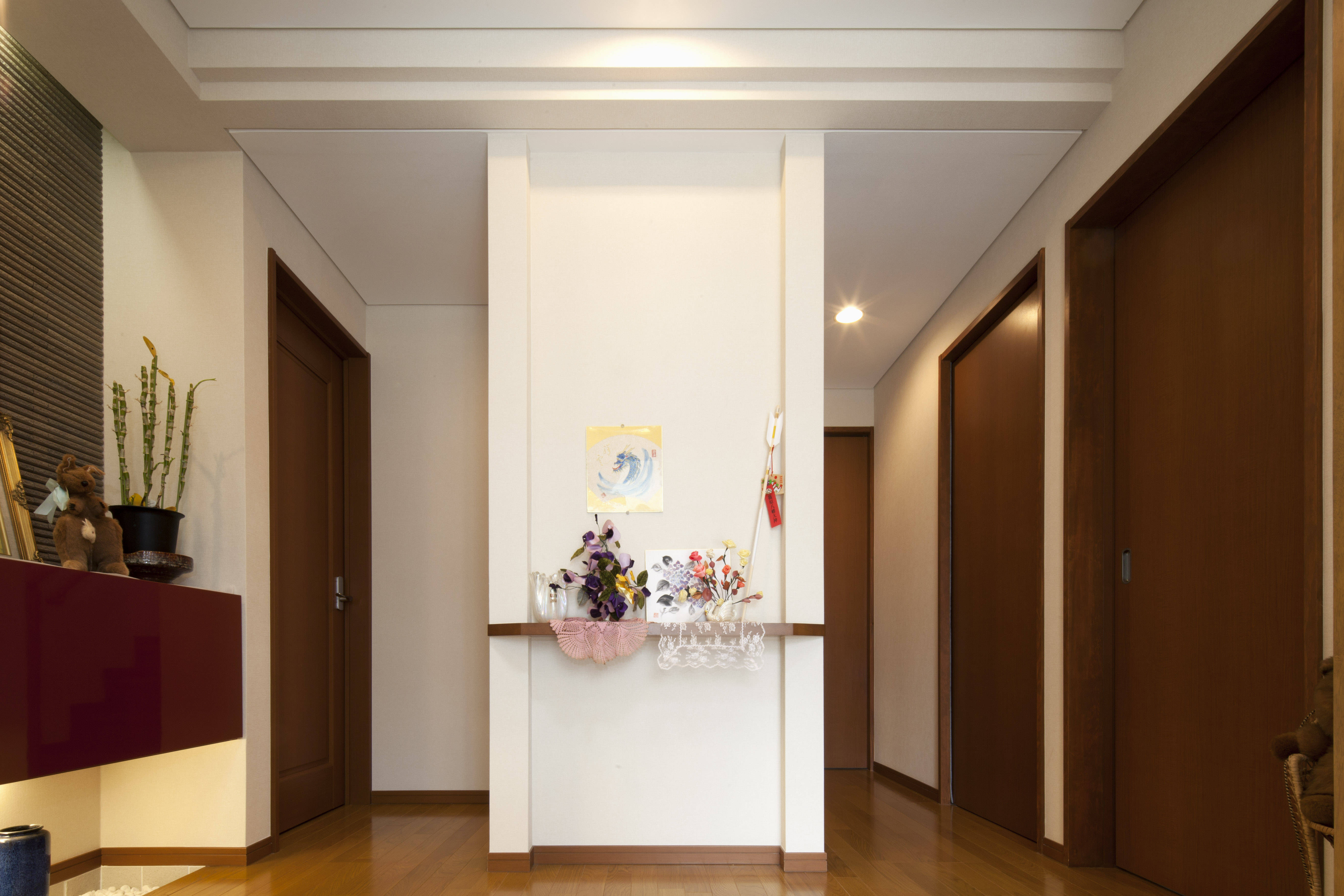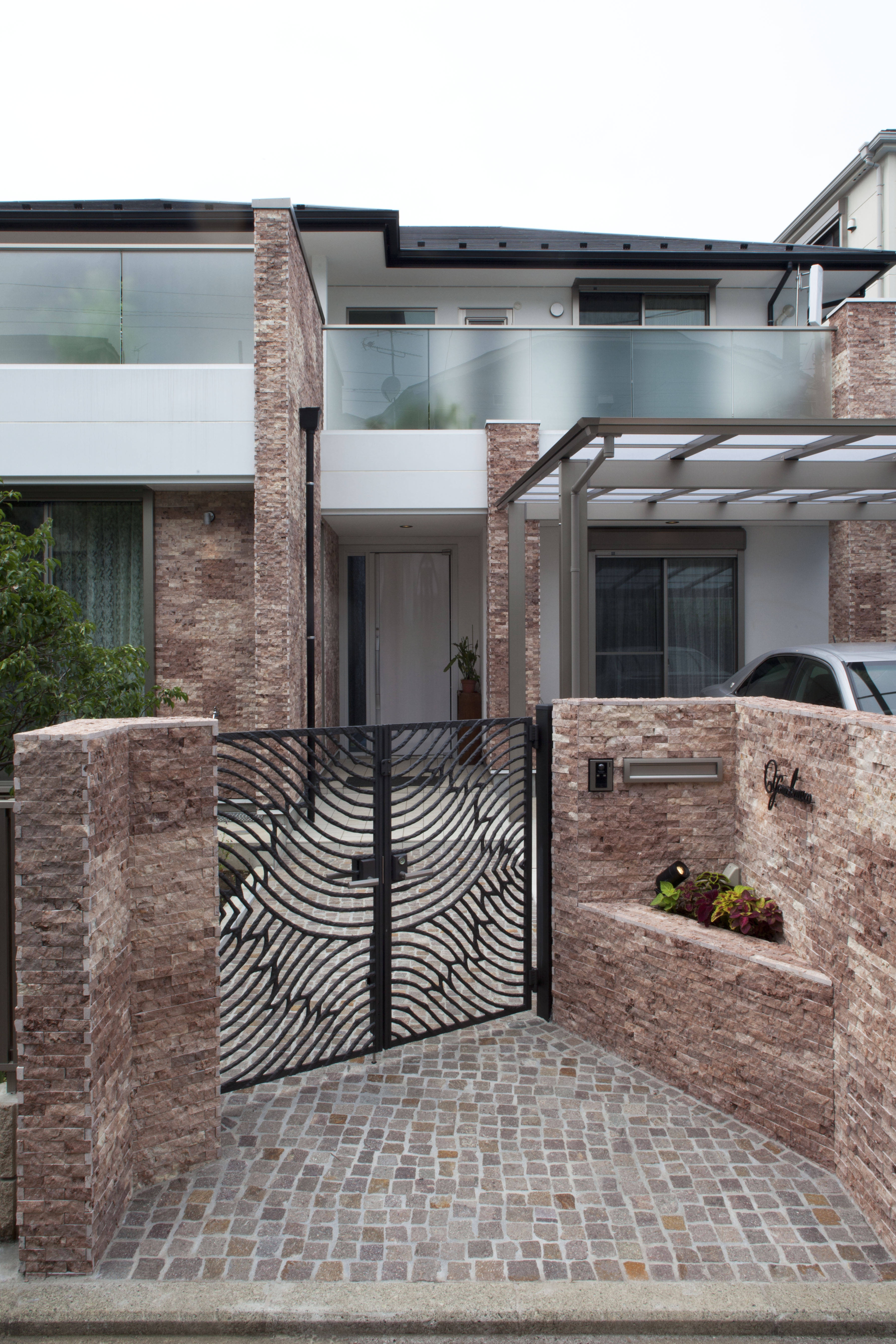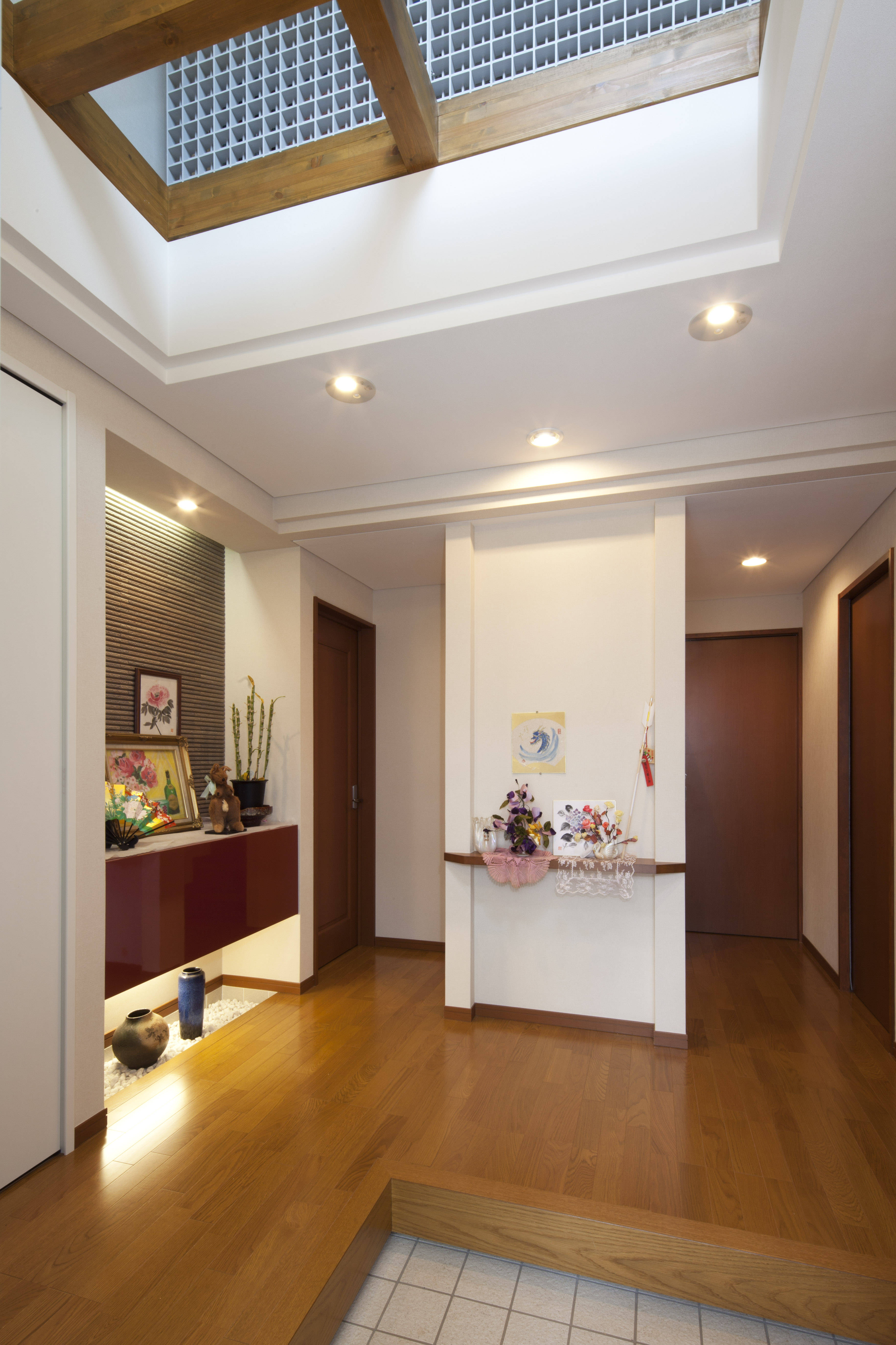 建築に対するご要望はシャープな中に温かみを感じる外観、内部特に玄関ホールはリッチな雰囲気をもった空間にして欲しいという事でした。そこでなるべく余計な要素を消す為にシャッターBOXなどを覆い隠すガルバリウム鋼板をベンダー加工した幕板をファサードに提案。又、バルコニー両サイドの壁に厚味を持たせ天然石を貼り、手摺にはテンパーガラス&アルミFBを設けることでスッキリ納めシャープで温か味の感じらる様に提案。玄関ホールはお母様お手製のインテリアオブジェを飾るスペースとして、それが映える様なギャラリースペースを提案。又、吹抜け上部のハイサイドライトを通し光が差し込み時の移ろいが感じられる様に演出しました。吹抜け上部は10帖程のファミリースペースとなってますが和の空間が欲しいとのご要望にグレーチング手摺を外しボイドの木梁に敷き込みパーツ類をセットすることで内観スケッチの様に遊びの空間、ゲストRとなるように提案させて頂きました。