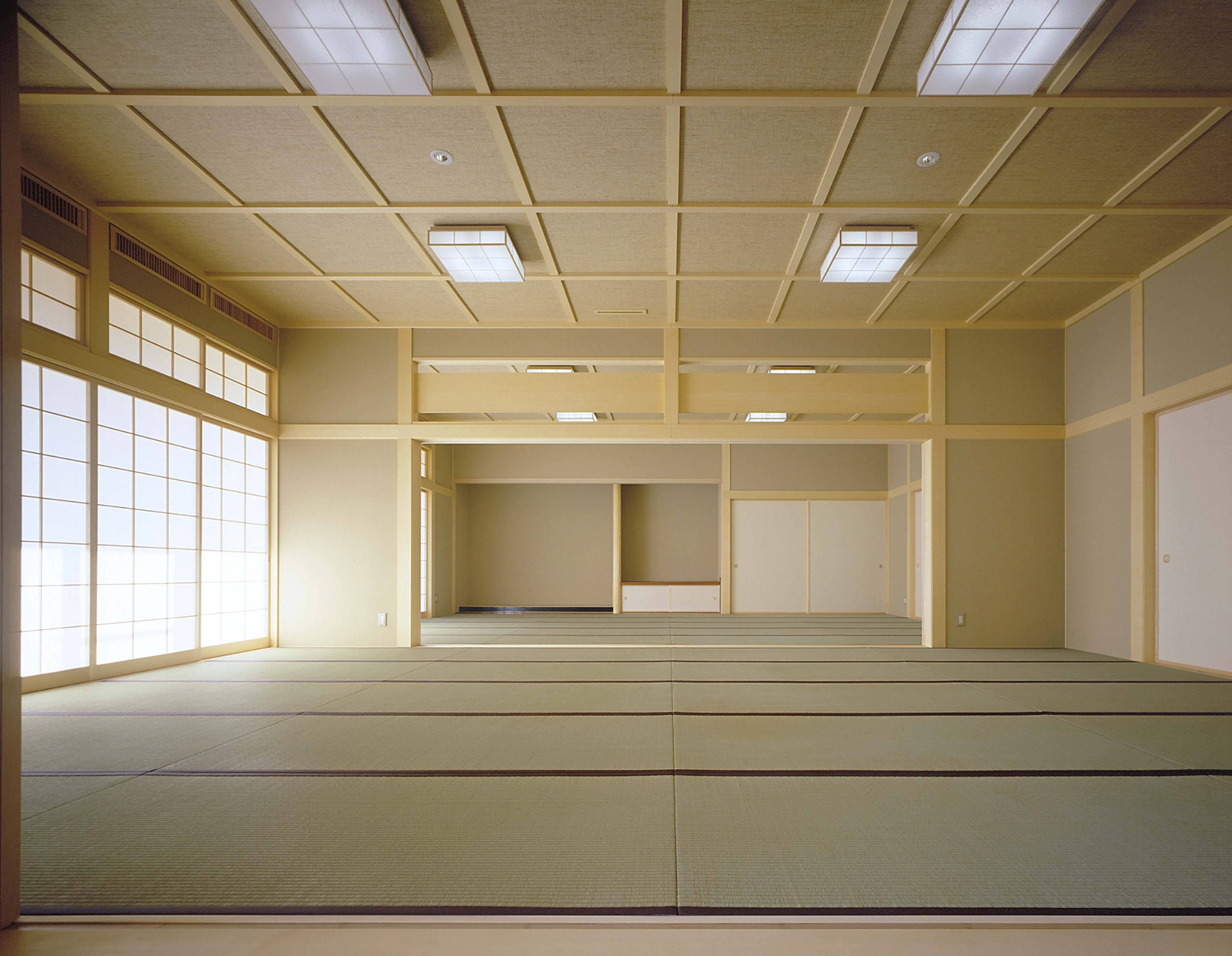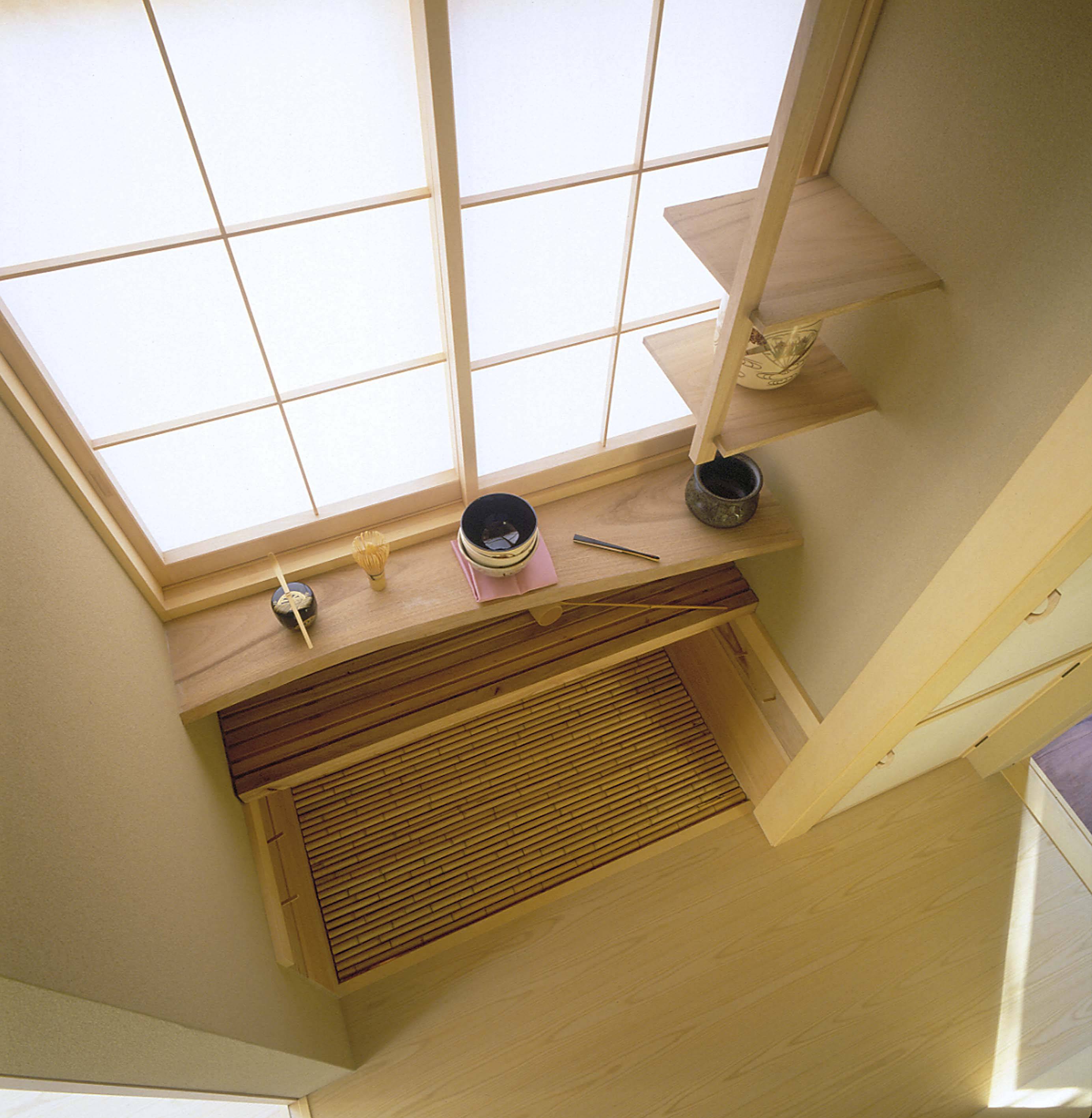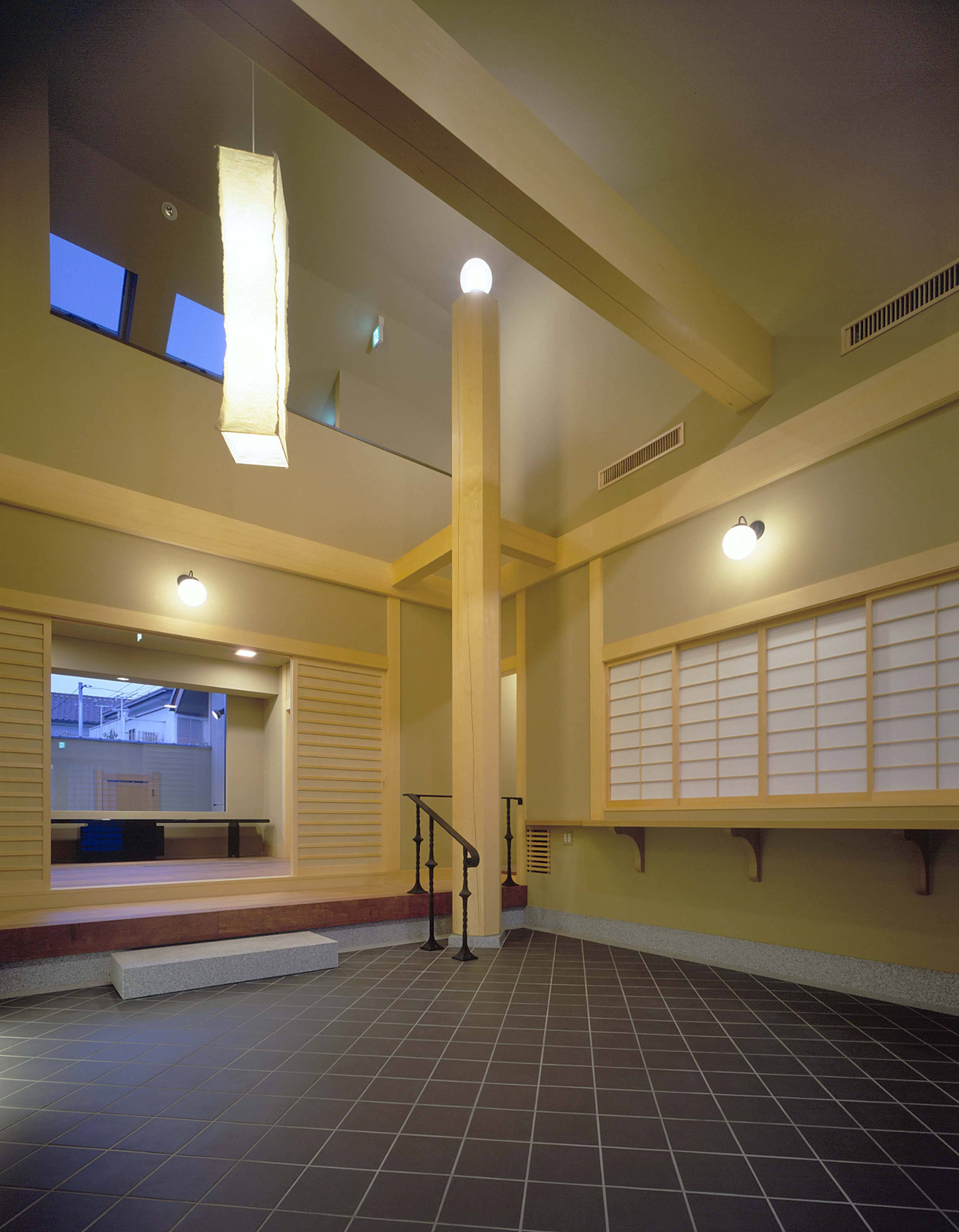 ご住職の構法など技術は新しいものを取り入れその中に本物古い物の良さを取り入れたいといういわば温故知新というコンセプトからこのプロジェクトは始まった。客殿竣工後に始まる本堂工事の為に使用する木材が奈良県天理の佐藤木材に眠っている。そのメインの檜芯去材をご住職より1本使って構わないとの事に。そこで玄関ホール正面脇にオブジェの様に檜芯去材を配するよう提案。玄関ホールの大空間を引締め精神を浄化すると共に寺院建築としてのポテンシャルを高めている。又、半世紀以上役宅としての庫裏も建替える事に。今までの住まいには何かと思い出があるわけで庫裏の床の間材を再生して欲しい旨ご要望が出ました。床柱・地板・棚板等使えそうなものを運び出しじっくりと吟味。この客殿にはサロンという檀家さんがくつろぐ場所があり、そこに床柱にガラスの棚を付けオブジェとして再生させました。他の材は水屋の腰板・簀の子・通し板・二重棚としてよみがえらせました。