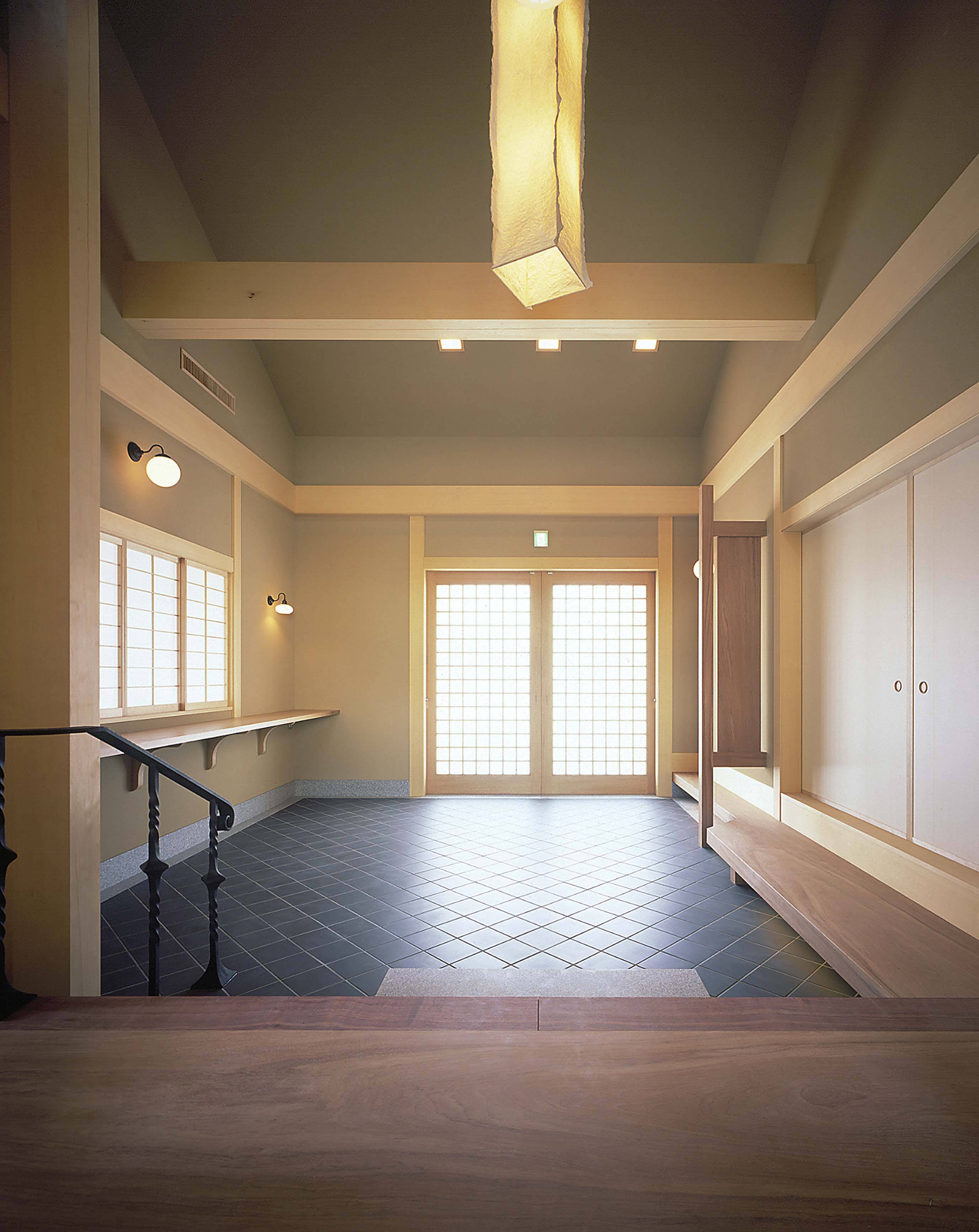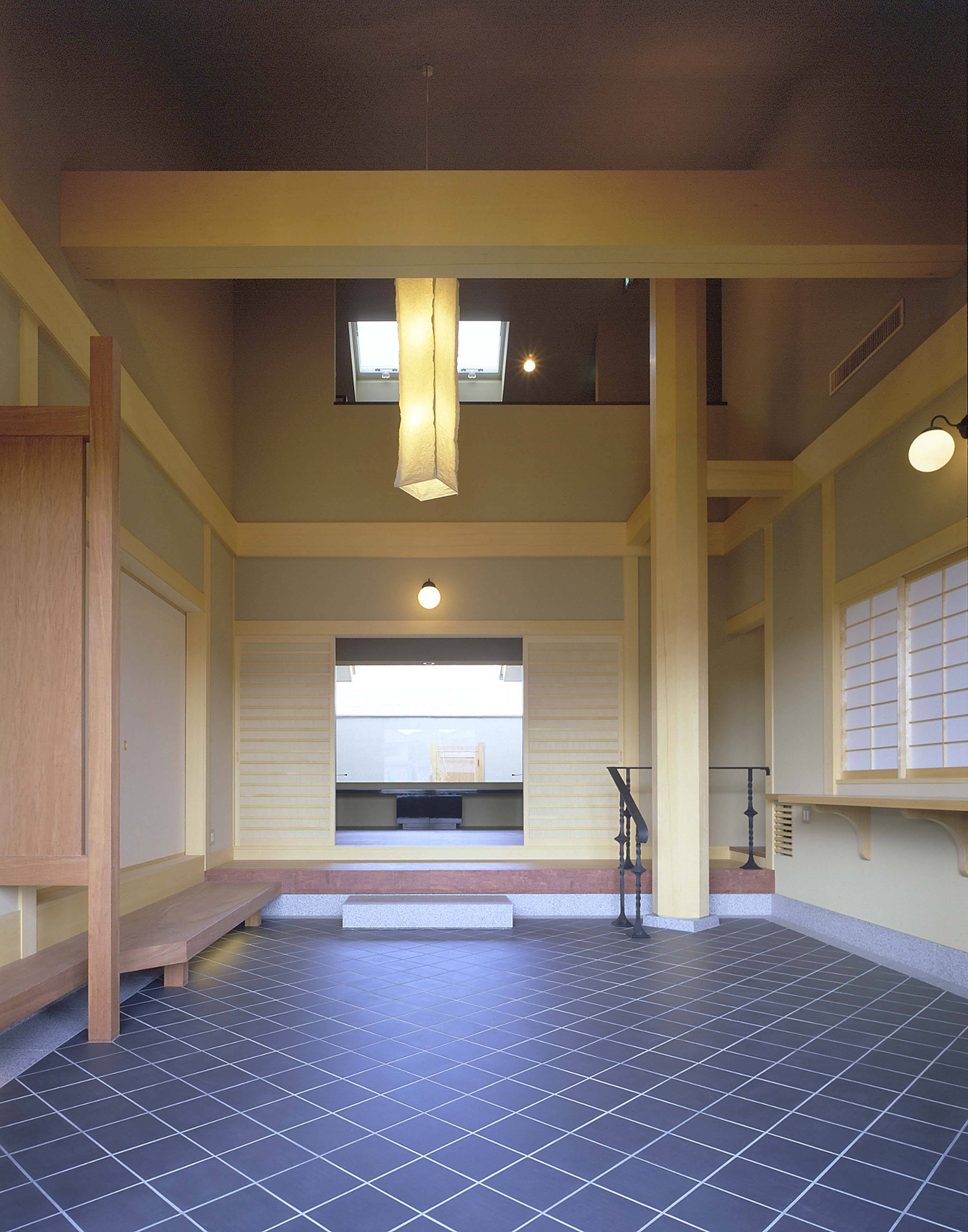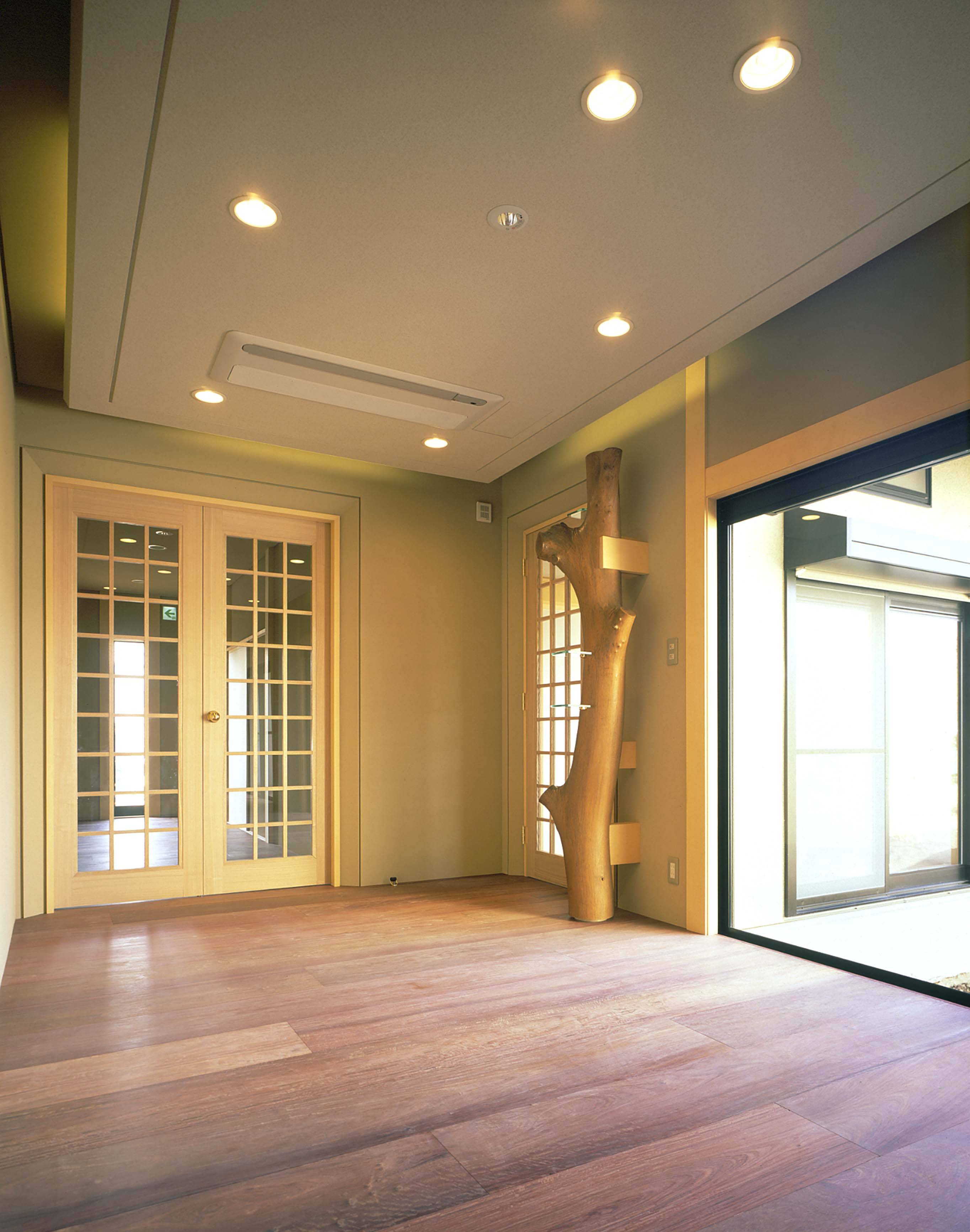 ご住職の構法など技術は新しいものを取り入れその中に本物古い物の良さを取り入れたいといういわば温故知新というコンセプトからこのプロジェクトは始まった。客殿竣工後に始まる本堂工事の為に使用する木材が奈良県天理の佐藤木材に眠っている。そのメインの檜芯去材をご住職より1本使って構わないとの事に。そこで玄関ホール正面脇にオブジェの様に檜芯去材を配するよう提案。玄関ホールの大空間を引締め精神を浄化すると共に寺院建築としてのポテンシャルを高めている。又、半世紀以上役宅としての庫裏も建替える事に。今までの住まいには何かと思い出があるわけで庫裏の床の間材を再生して欲しい旨ご要望が出ました。床柱・地板・棚板等使えそうなものを運び出しじっくりと吟味。この客殿にはサロンという檀家さんがくつろぐ場所があり、そこに床柱にガラスの棚を付けオブジェとして再生させました。他の材は水屋の腰板・簀の子・通し板・二重棚としてよみがえらせました。
