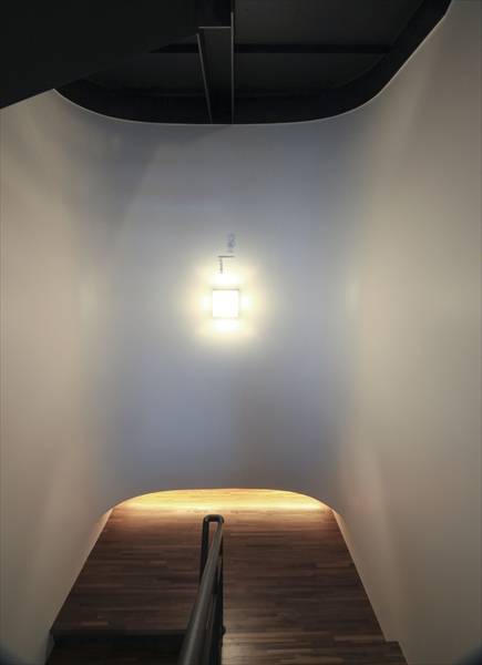 角地に向け曲線のファサードをもつ住宅。 曲面の壁は周辺に柔...