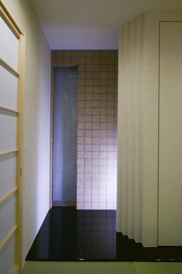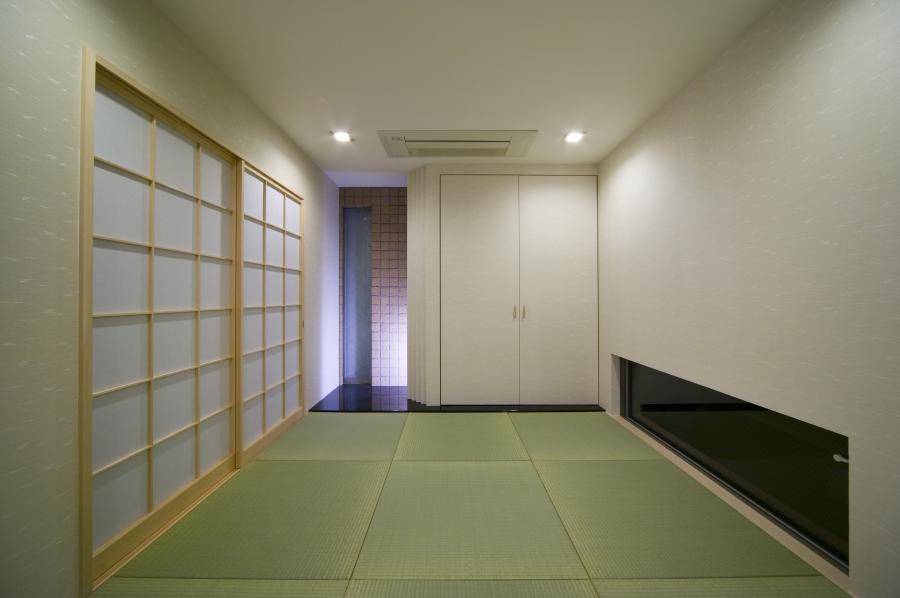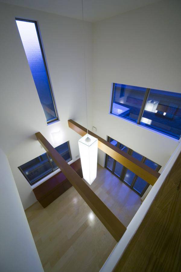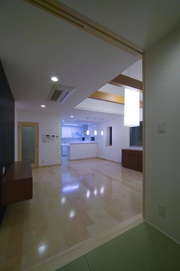 リビングの吹抜けにはハイサイドライトが配され、そこから差込む光は四季の移ろい一日の時の流れを感じさせます。そして家全体を自然の光で満たしてくれます。又、大きな吹抜けをコアに家のどこに居ても家族の気配が感じられる様ゾーニングに配慮しました。全体的にシンプルモダンに、とのご要望から和室も床の間の地板は黒鏡面仕上げ、一部壁を割肌タイル仕上げとし間接照明で割肌タイルが映える様デザインさせて頂きました。リビングTVボードの壁に凹凸のある黒艶消しの板を貼り空間全体を引締める様に提案しました。