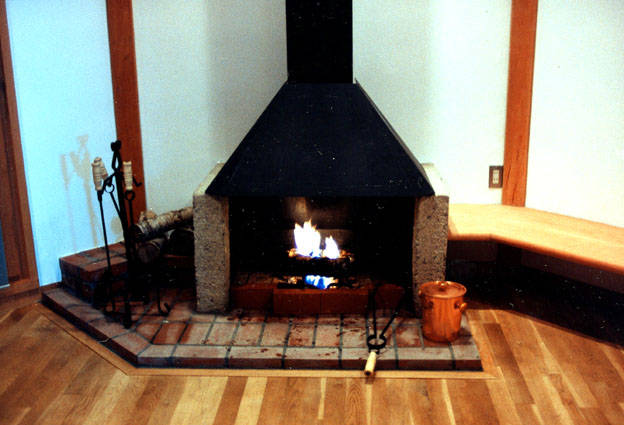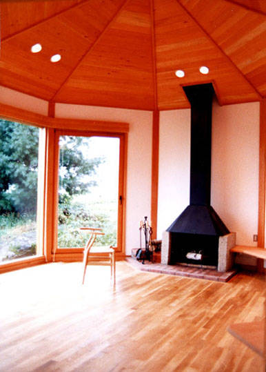 八角形をした暖炉の部屋は壁側に作り付けのベンチを設置し、他は何も置かず多目的に自由に使える空間とした。