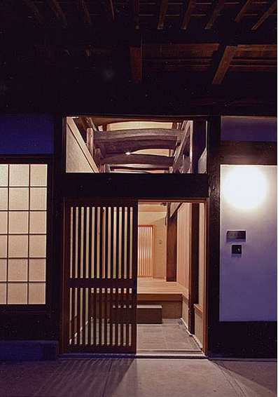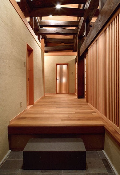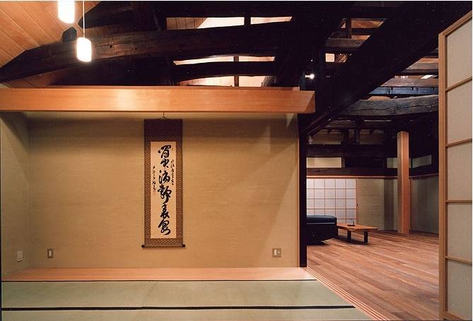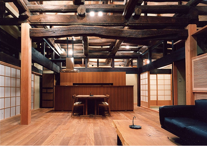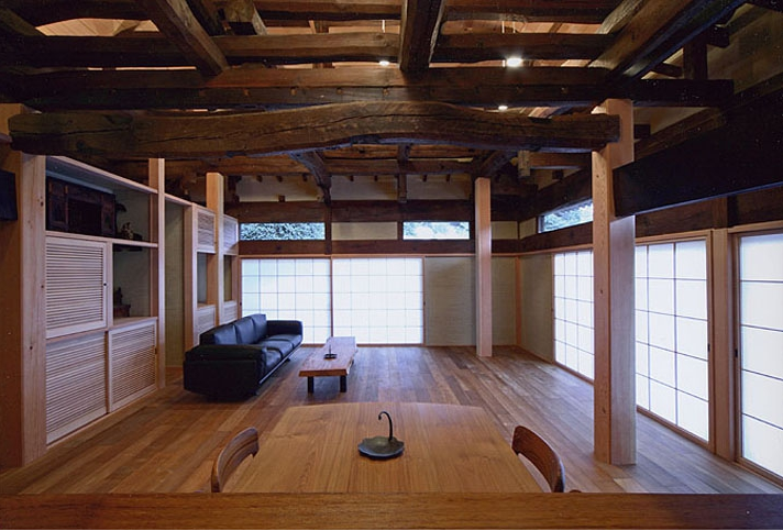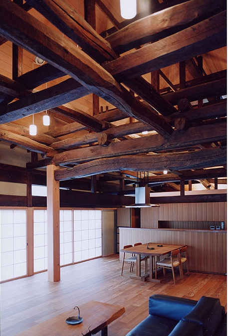 この築100年の民家にさらに住み続けたいという建主の希望により、今回の民家再生工事が始まりました。エネルギーあふれる若いご夫婦と2人の男のお子さんの為、内部は現代生活に合わせて新しい機能と設備を持ち、一方でこの昔からの力強い小屋組を生かした新旧共存の新しい機能空間となっています。