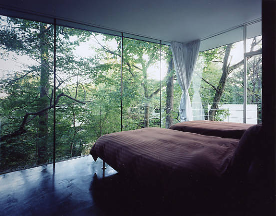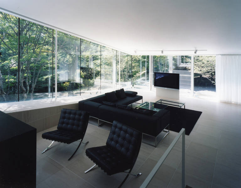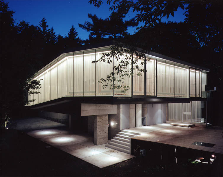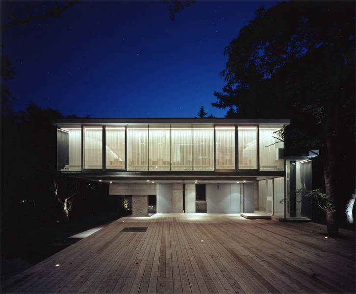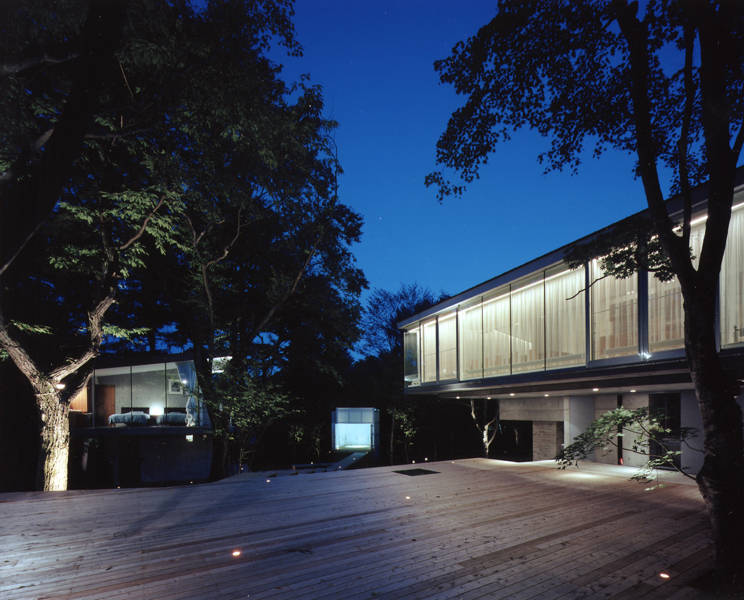 緩やかな起伏のなかで母屋、ゲストハウス、露天風呂棟の3棟をデッキを中心に繋ぎ、母屋の内部は緩やかな螺線状のスロープによって各機能を繋いだ。