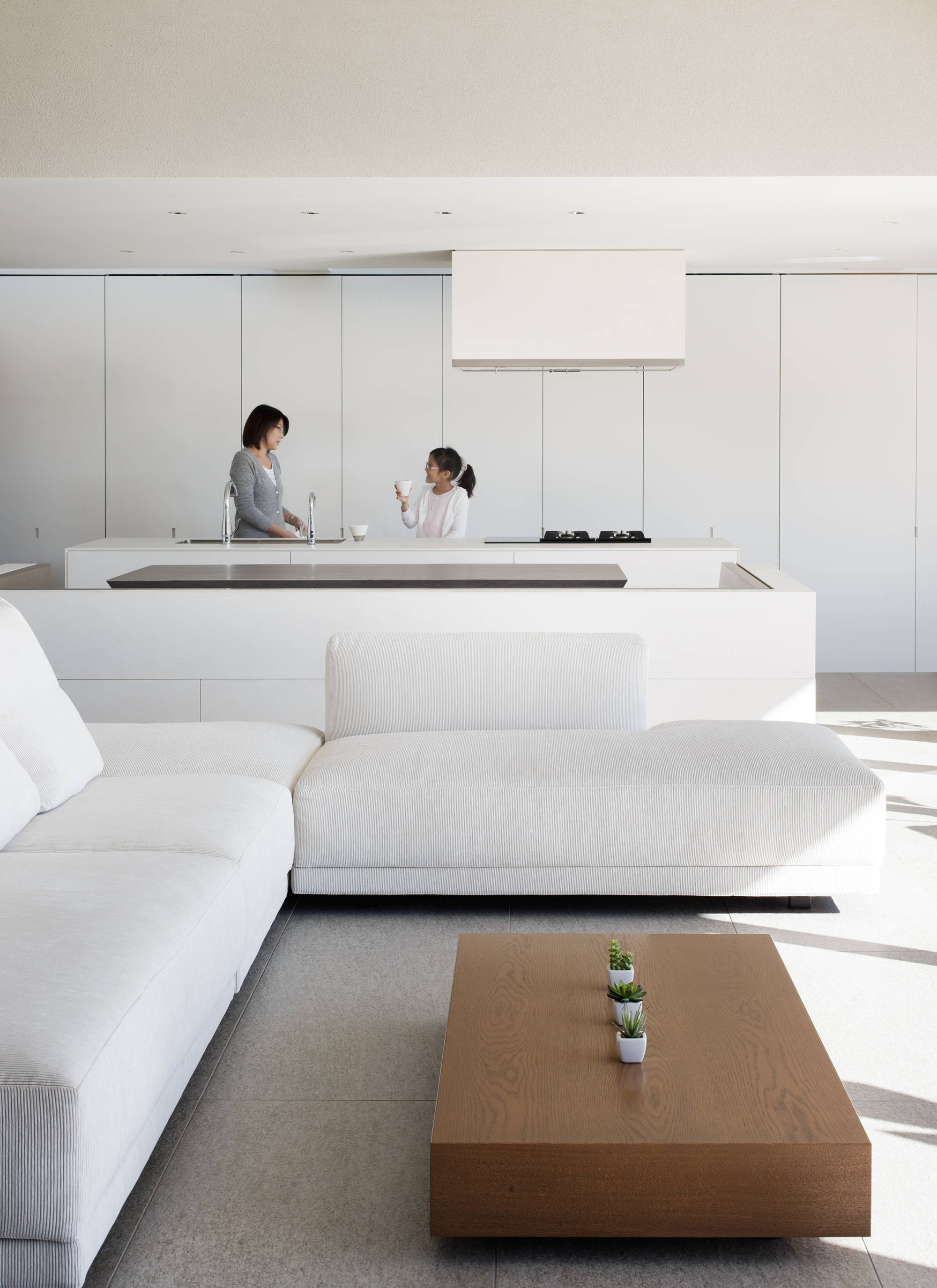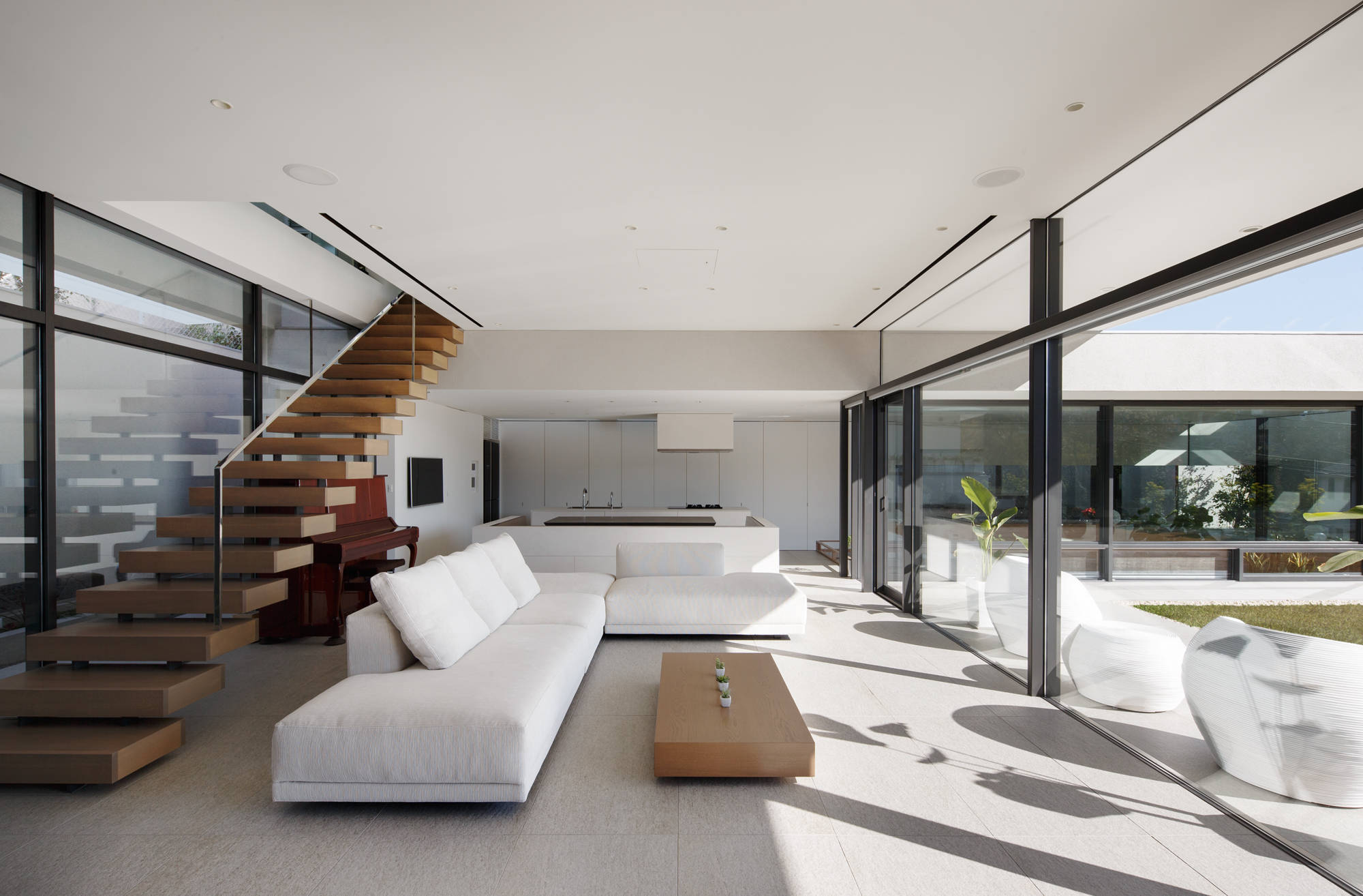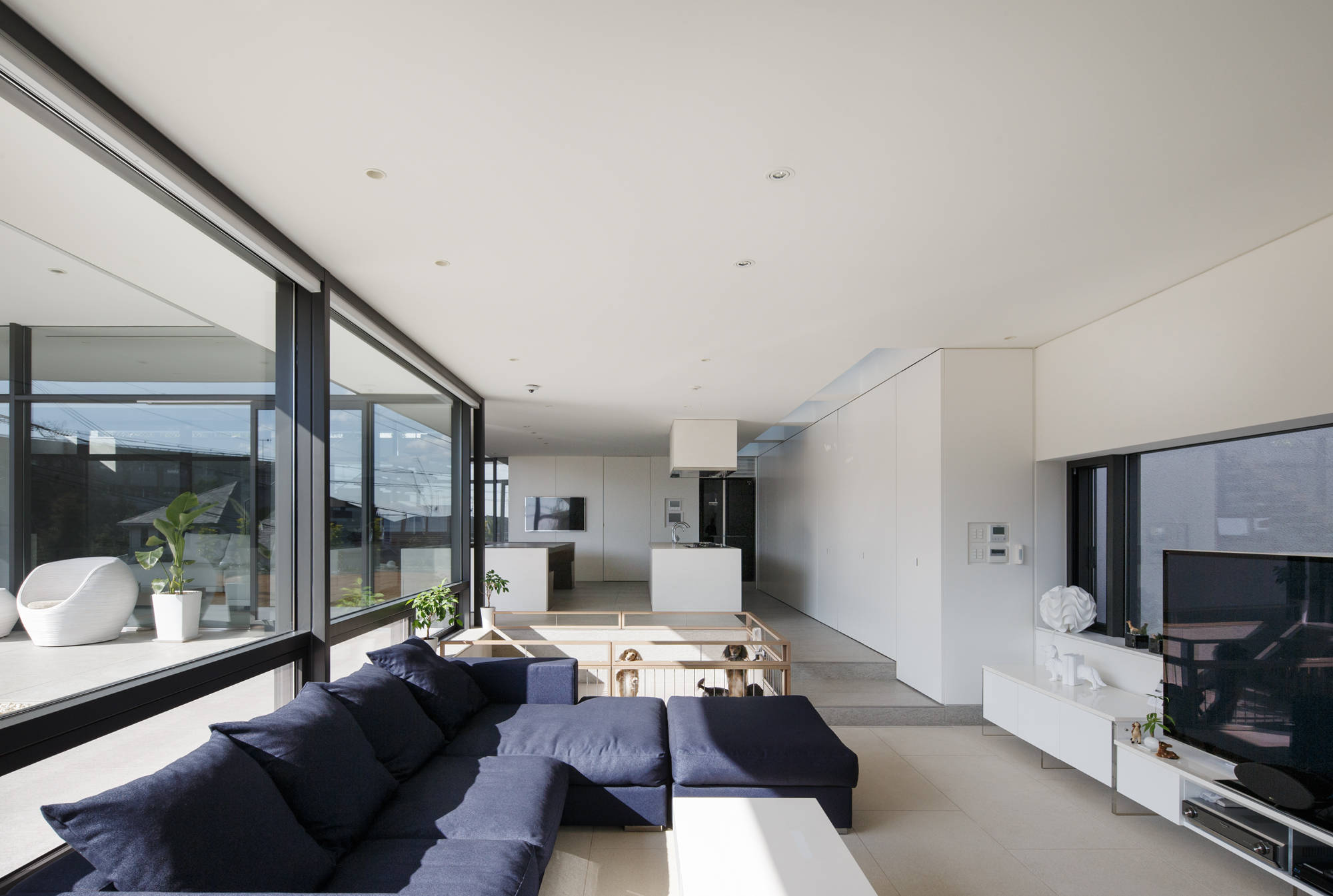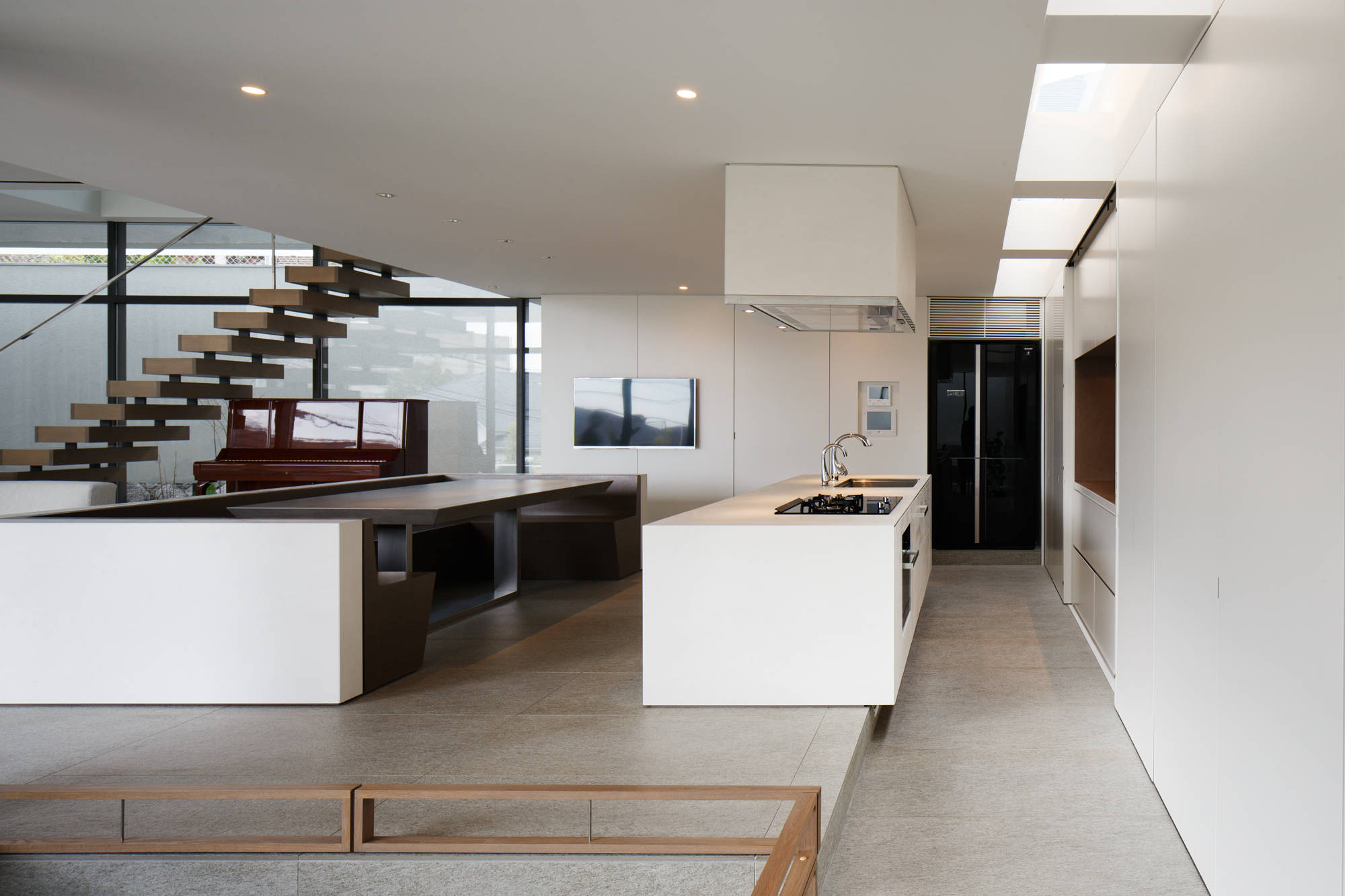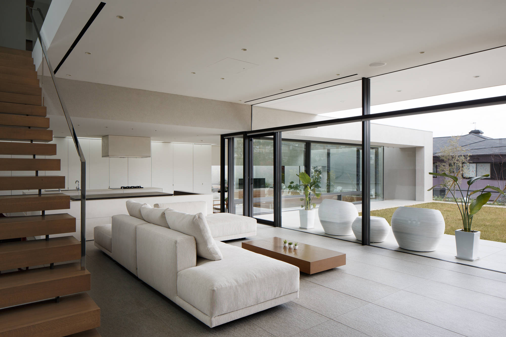 斜面地に計画したRC+S造の住宅。恵まれた眺望を活かすこと、庭と一体となった開放的な空間をつくることが望まれた。そこで高低差を利用して、道路から一段高い基壇を設け、その上にフラットに広がる芝庭と主要な生活空間を配置した。庭を取り囲むように2つのヴォリュームを組み合わせ、そこに生まれたL字型平面にフォーマルリビング、ダイニング、キッチン、ファミリーリビングを設けている。これらはひとつながりの空間であるが、フロアレベルに細やかな高低差を設けることで、パブリックからプライベートへ、少しずつ空間の親密さが変わるように配慮した。家族のためのプライベートルームは、2階に浮かべたヴォリュームの中におさめてあり、眼下に広がる眺望を楽しむことができる。