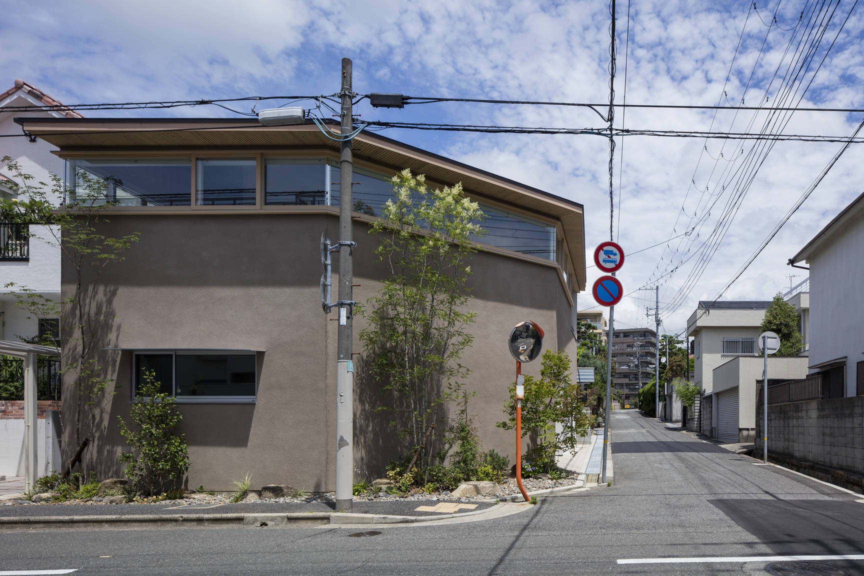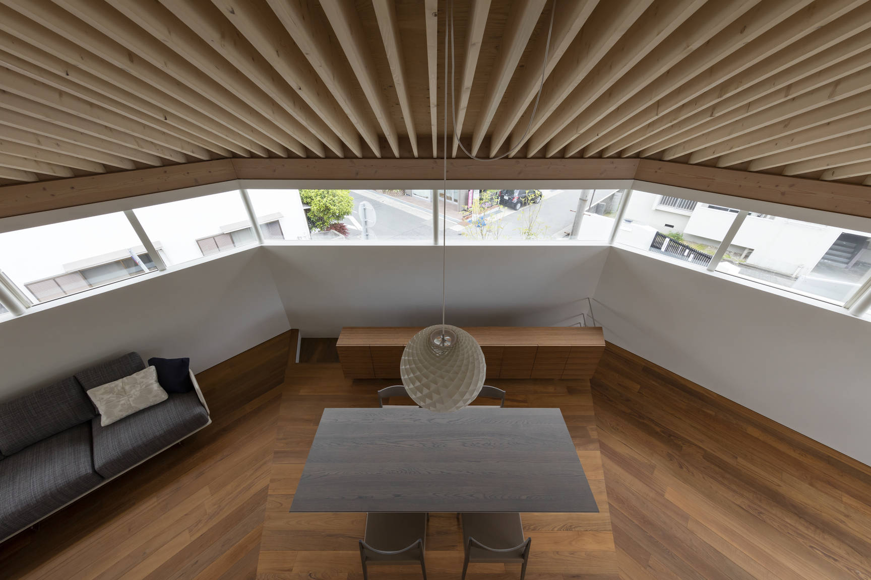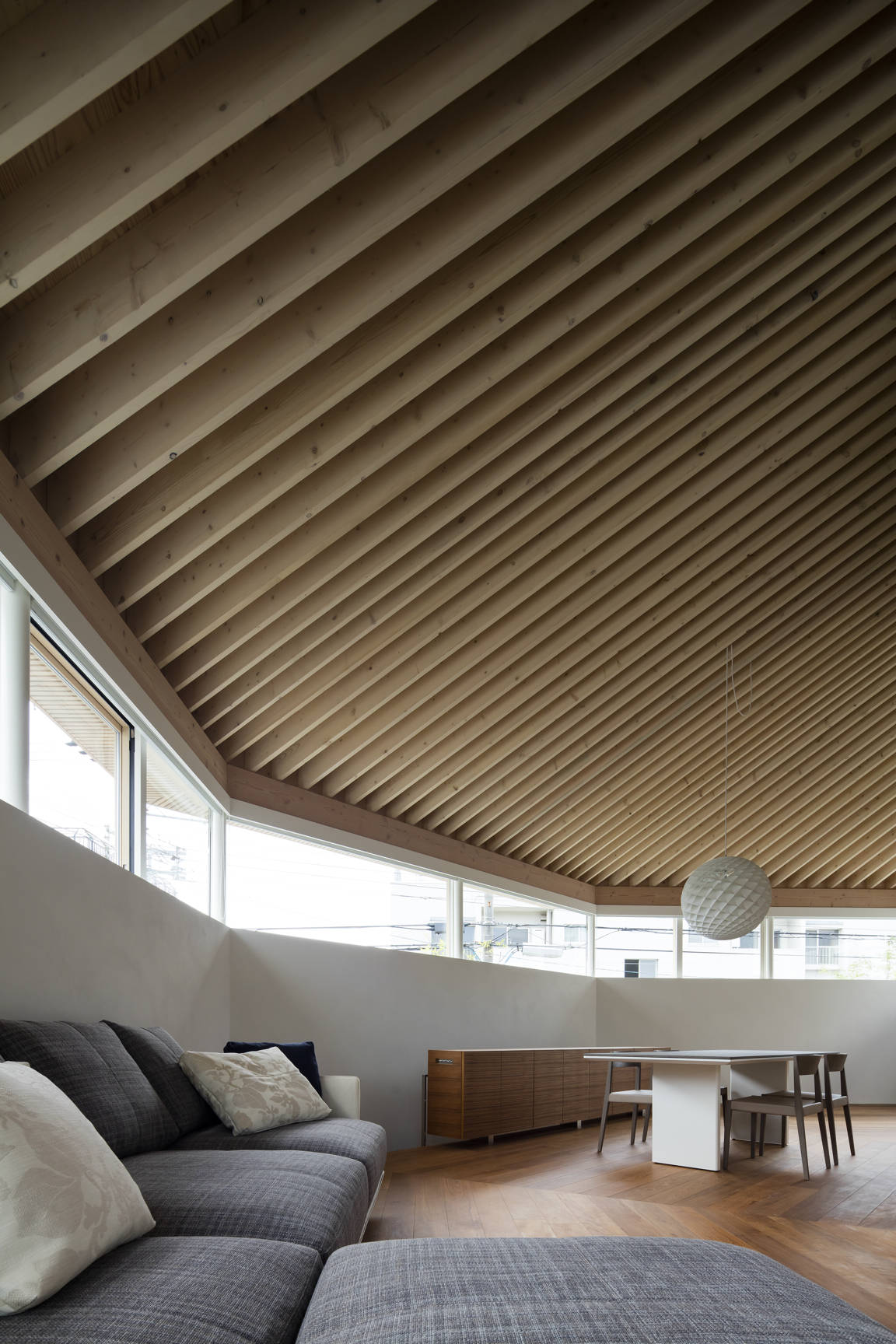 兵庫県芦屋市に建つ木造2階建ての住宅。敷地は東南に接道する角地で、比較的ゆったりとした街区である。しかし目の前の道路は交通量が多く、社員寮や店舗、住 宅の建ち並ぶ風景はやや煩雑な印象があった。建主からは開放性が高く広がりのある空間を求められた。一方で、周辺環境・プライバシーを考慮すれば一定のコントロー ルが必要である。そこで、主空間を置いた2階を高い「腰壁」で囲い、その上を水平連続窓とする構成にした。腰壁は1.6Mに設定した。立った時あるいは椅子やソファ に座った時、外の風景は見上げる関係となる。これにより煩雑な風景があまり目に入ってこない。もちろん外からは内部の様子が見えずプライバシーが保たれている。 水平連続窓の上には桁が走り放射状に連なる化粧垂木を受ける。高い「腰壁」と化粧垂木が、家族の居場所をおおらかに包む空間となった。市街地における すまいの 内外のつなぎ方を、人体寸法から組み立てた提案である。