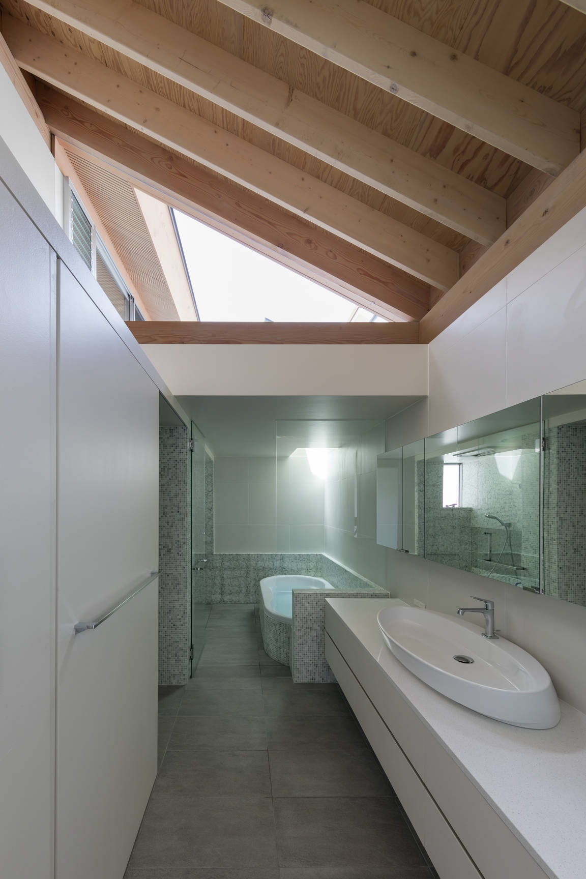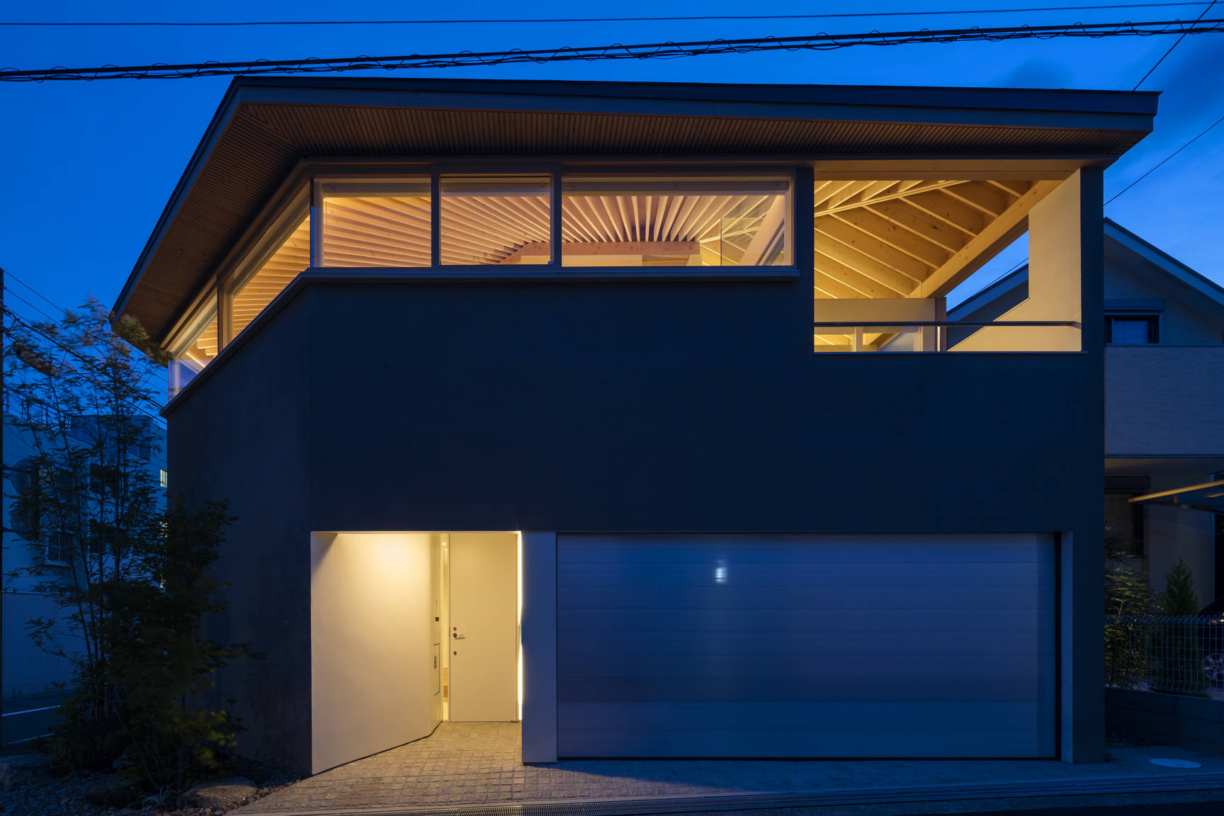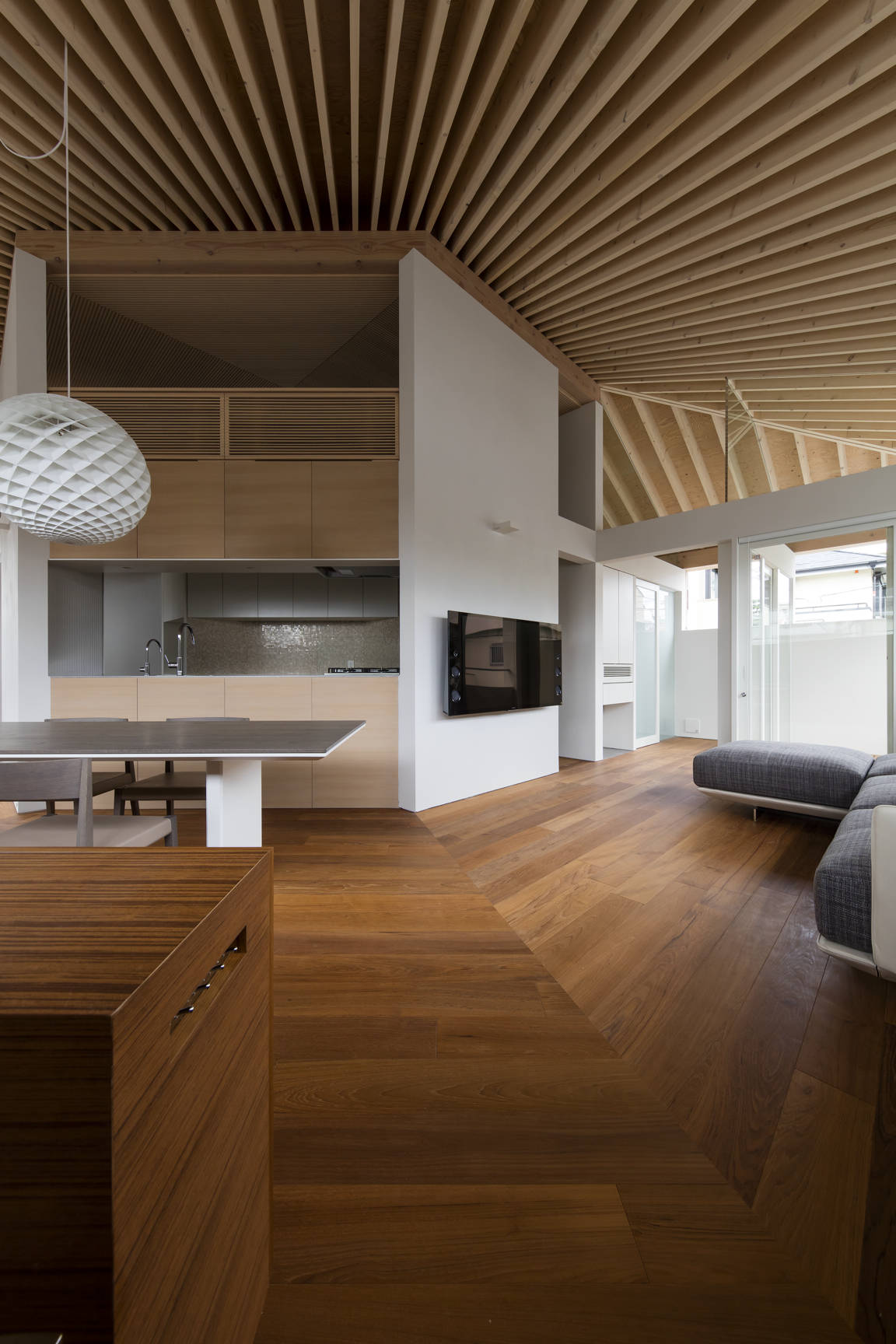 兵庫県芦屋市に建つ木造2階建ての住宅。敷地は東南に接道する角地で、比較的ゆったりとした街区である。しかし目の前の道路は交通量が多く、社員寮や店舗、住 宅の建ち並ぶ風景はやや煩雑な印象があった。建主からは開放性が高く広がりのある空間を求められた。一方で、周辺環境・プライバシーを考慮すれば一定のコントロー ルが必要である。そこで、主空間を置いた2階を高い「腰壁」で囲い、その上を水平連続窓とする構成にした。腰壁は1.6Mに設定した。立った時あるいは椅子やソファ に座った時、外の風景は見上げる関係となる。これにより煩雑な風景があまり目に入ってこない。もちろん外からは内部の様子が見えずプライバシーが保たれている。 水平連続窓の上には桁が走り放射状に連なる化粧垂木を受ける。高い「腰壁」と化粧垂木が、家族の居場所をおおらかに包む空間となった。市街地における すまいの 内外のつなぎ方を、人体寸法から組み立てた提案である。