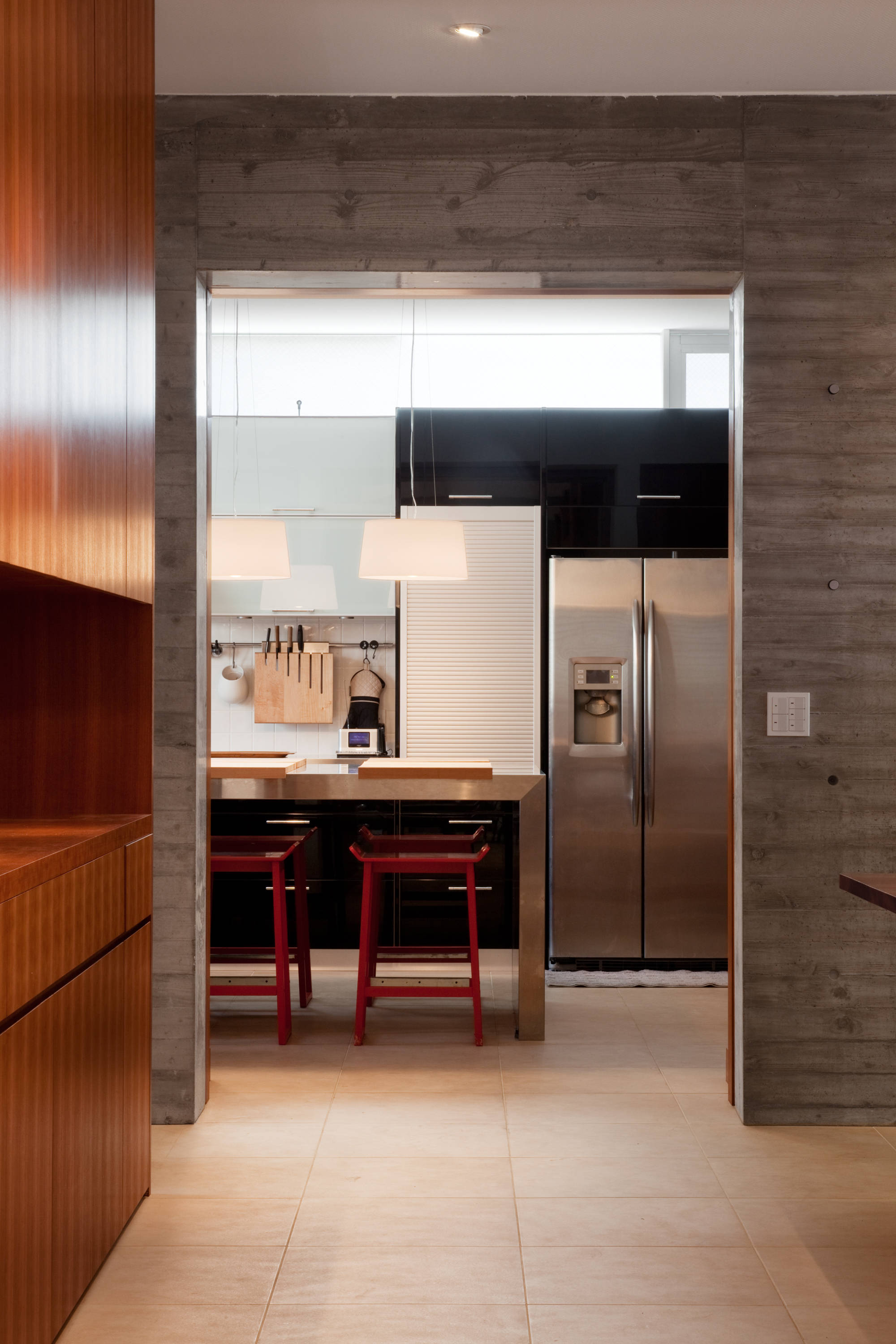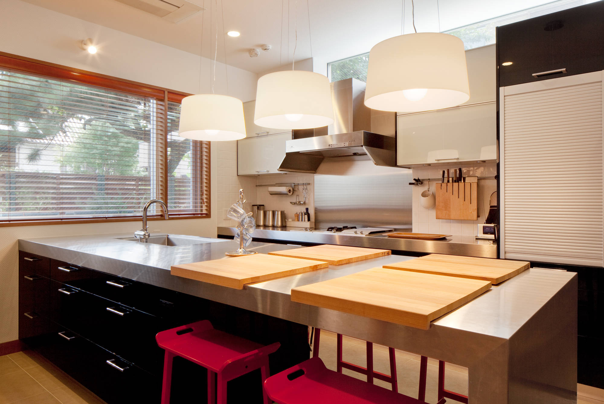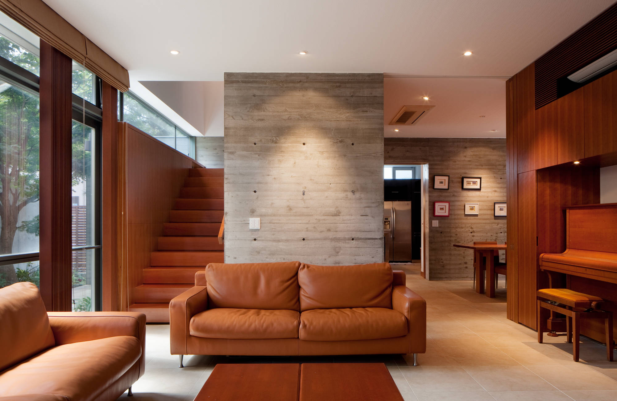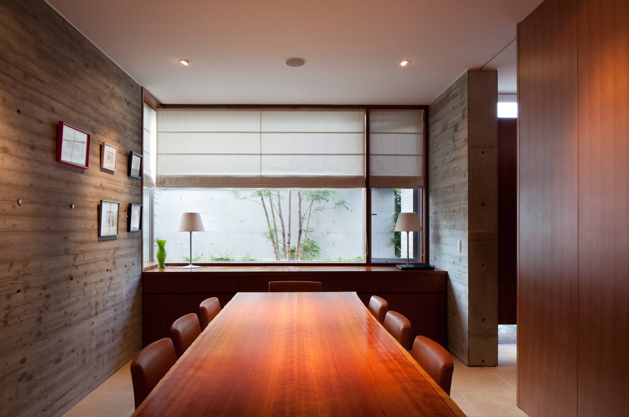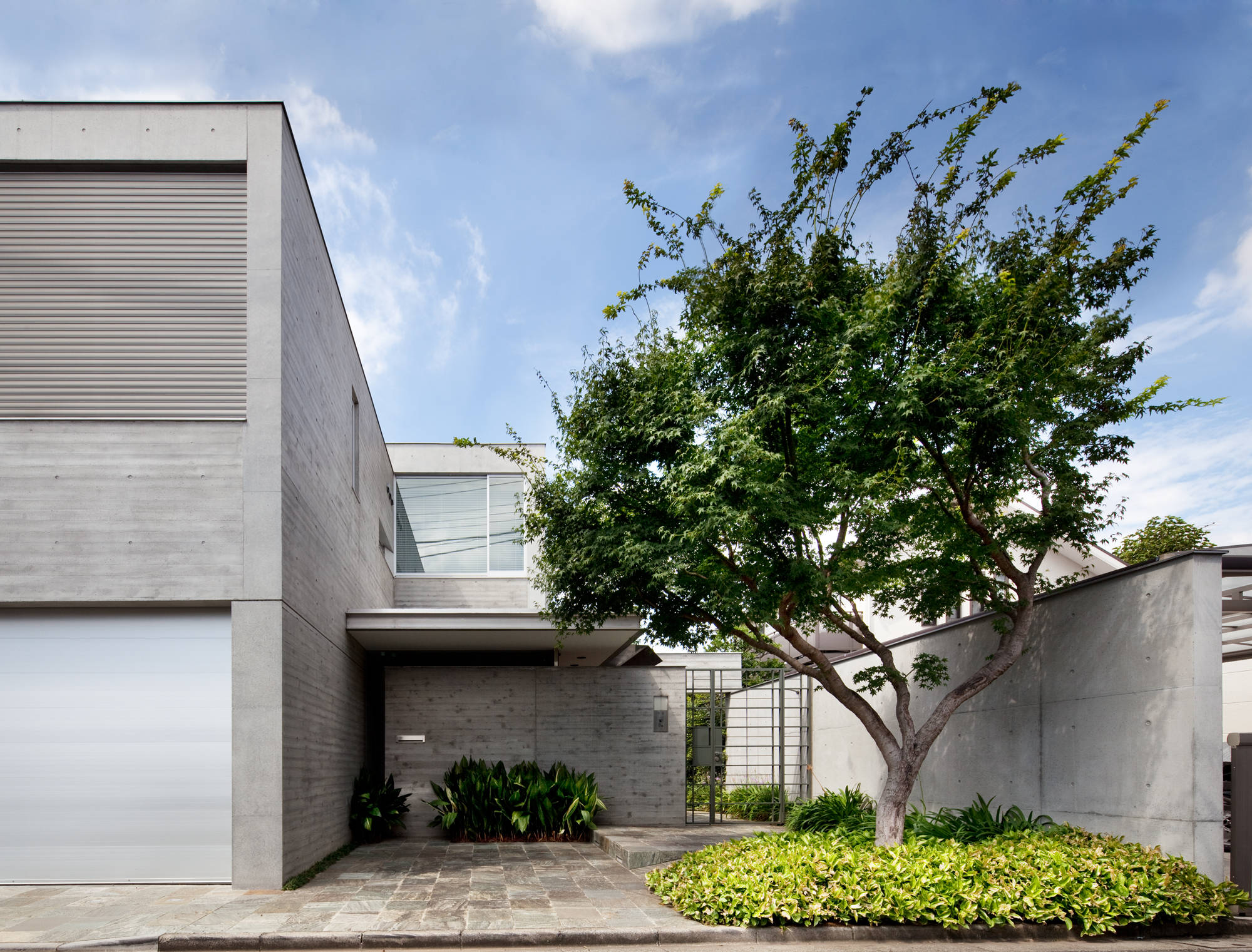 東京都、閑静な住宅地に計画したRC造2階建ての住宅。プライバシーの確保と開放性が求められた。そこで縦長のヴォリュームを敷地中央におき、南北両面に庭をとることで、 生活空間を緑豊かな緩衝空間で取り囲む配置とした。中央のヴォリュームはプログラムにあわせて4つのブロックに分節し、それらを少しだけずらしながら繋いでいる。これにより外部に表れるヴォリュームは程よく分節され、庭に変化がうまれる。また内部には視線や風の抜け道が生まれるとともに、空間に適度なたまりができた。エントランス・リビング・ダイニング・キッチン、各部屋からはそれぞれの空間の特性に合わせた庭を楽しむことができる。重厚感ある本実のRC壁・豊かな緑に囲われ、外との繋がりをもちながらも落ち着きのある住宅となった。