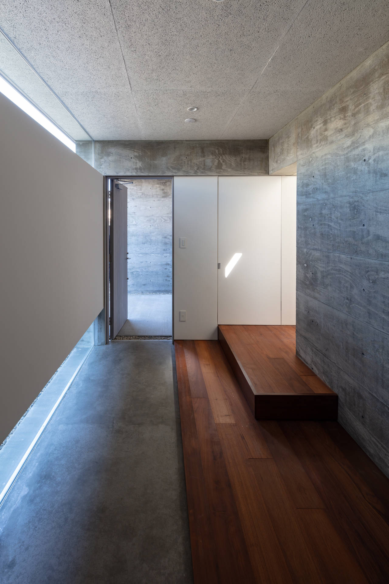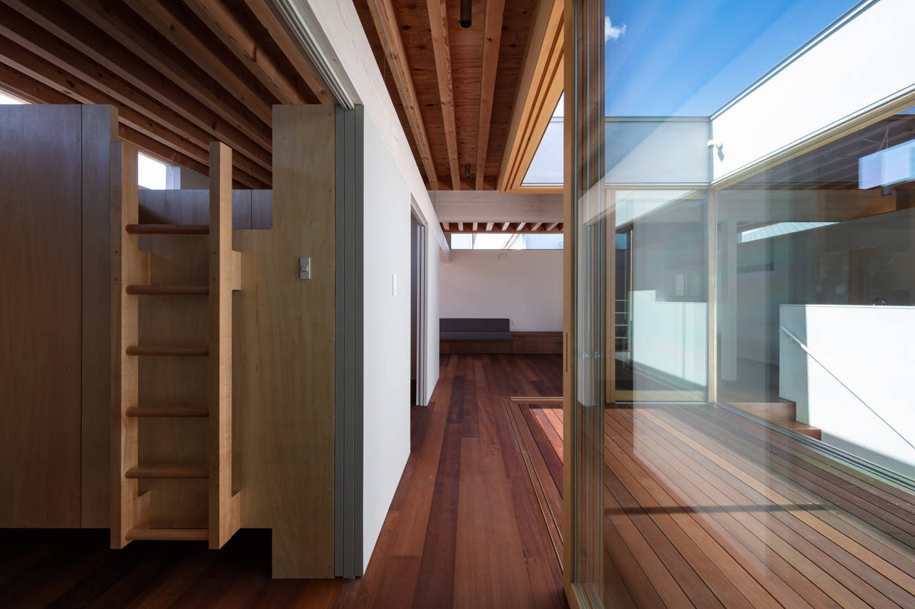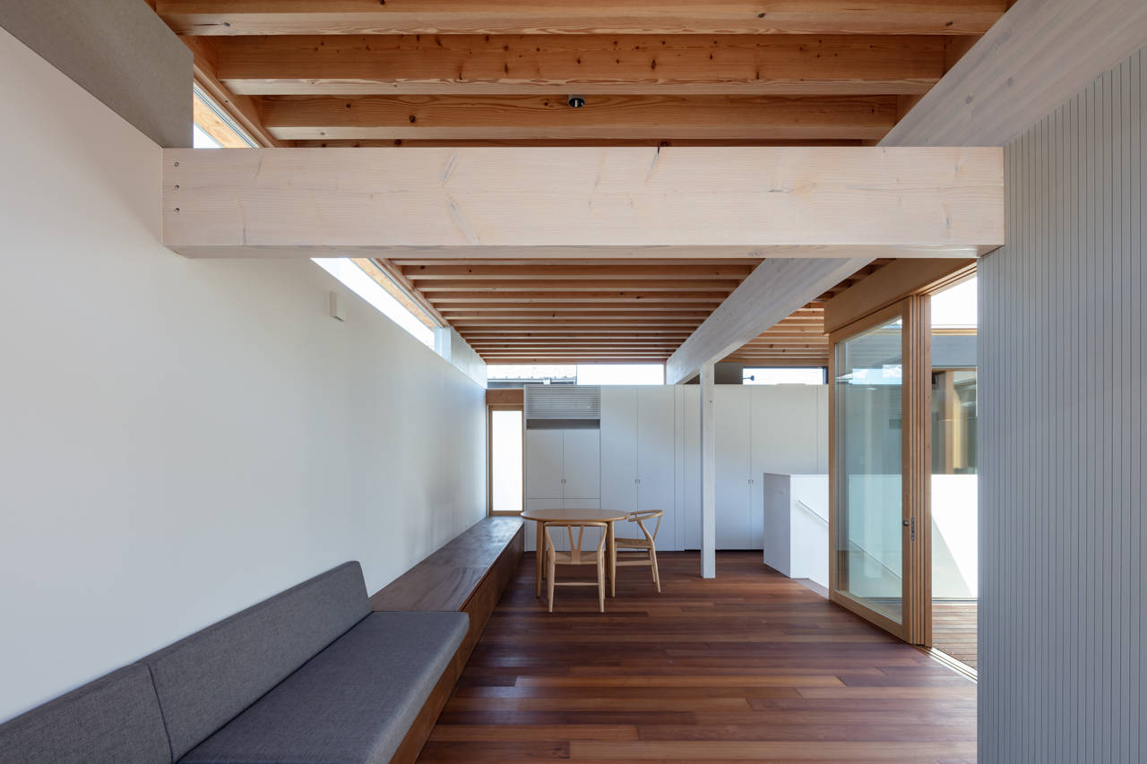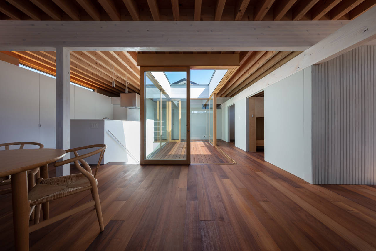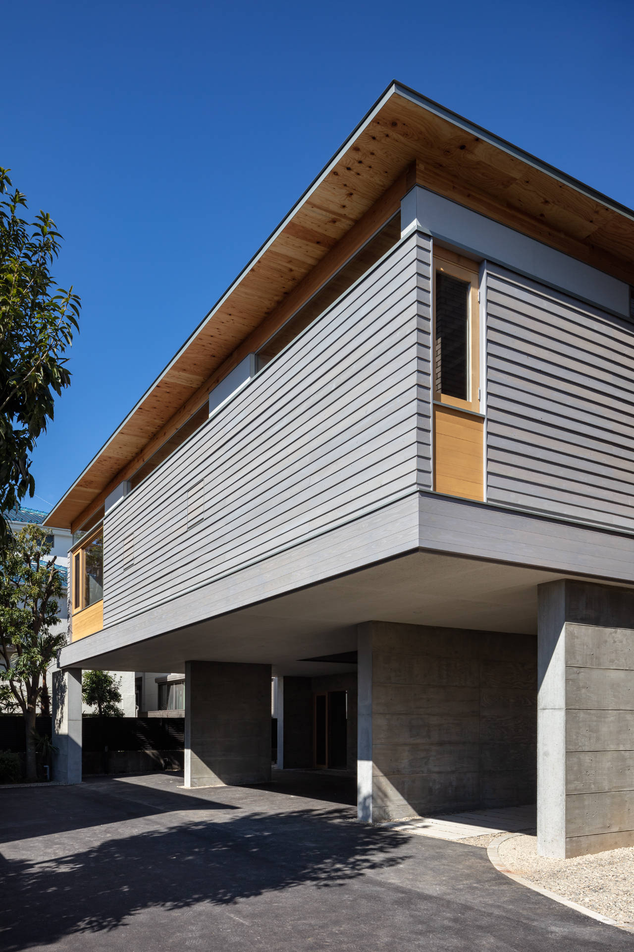 埼玉県さいたま市。地上階をRC造のピロティとし、その上に木造の平屋を乗せた住宅である。地上部分は車のためのスペース、持ち上げられた明るく風通しの良い場所が人のための生活空間となっている。