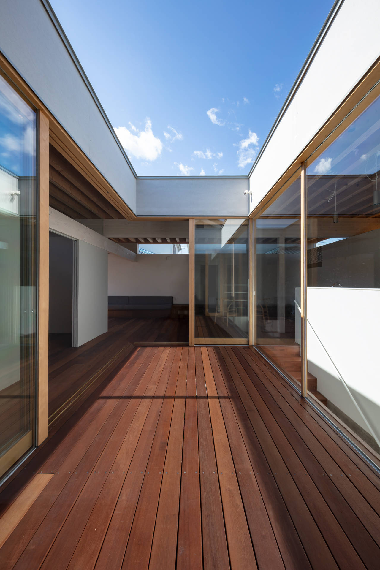 木造部分は中庭型のロの字プラン。周辺を住宅に取り囲まれているため、四方からはハイサイド窓からの光と風を取り入れ、中(上空)に向けて大きく開くプランとした。