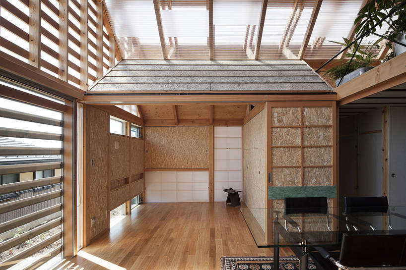 樹木の下、タープの下、バンガローの下。アウトドアライフでは、「外」という一言ではあまりある、様々な光や空気の状態を満喫できます。私達は、そんな豊かな住まいを目指し、所沢市の住宅街にある開放的な環境を望む崖地に、徐々に室内化の深度を増してゆく層を持つ家をつくりました。平面的・立体的に重なる層は、景色のような遠さを感じさせ、平面的な奥行感とは異なる深みをこの家に与えています。