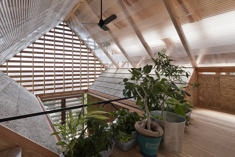 夏季の環境対策として、最外殻となる土間の層には、残暑までを考慮した日射抑制ルーバーを設置し、また、排熱については強制換気により5回/h換気(自然換気を含めれば10回/h換気以上)とすることで絶えず空気が入れ換わる木陰のような環境を目指しました。冬季は、この層が空気の断熱層となることを期待し、断熱性の高い木毛板(熱伝導率0.069w/mk)を防火壁と兼ねて使用しました。また、上部に溜まった熱は、軸流ファンによって床下経由で食事室に送られ、補助的な暖房として利用しています。