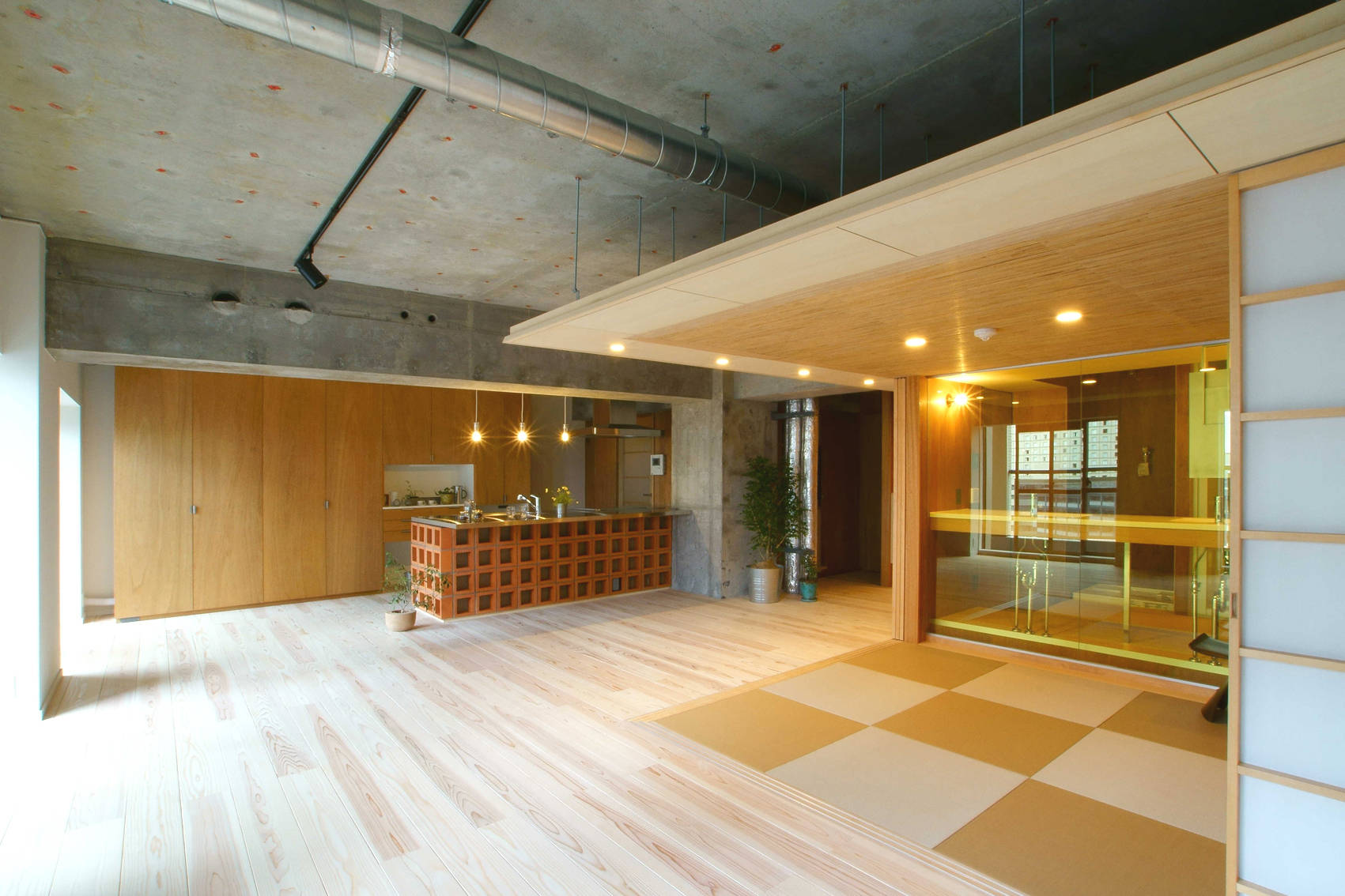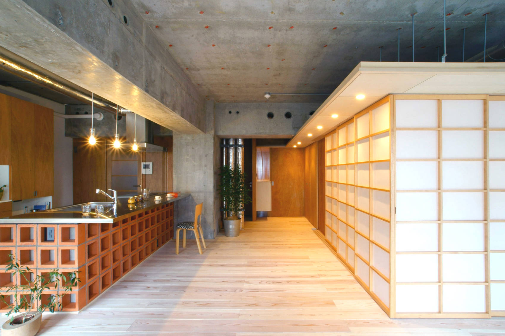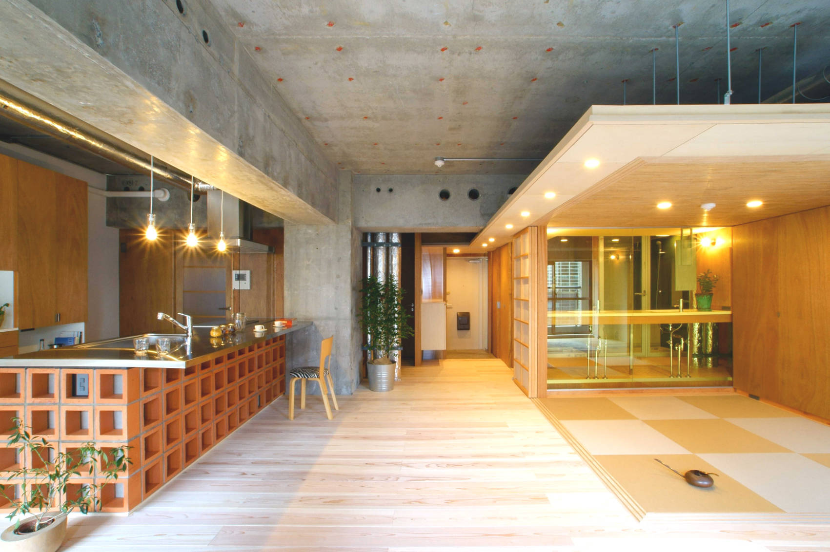 スケルトン(コンクリート)の豊かな表情を活かしつつ、沖縄花ブロックやイエローガラス、30ミリの無垢フローリングなど素材感や色彩豊かな仕上げを採用しました。