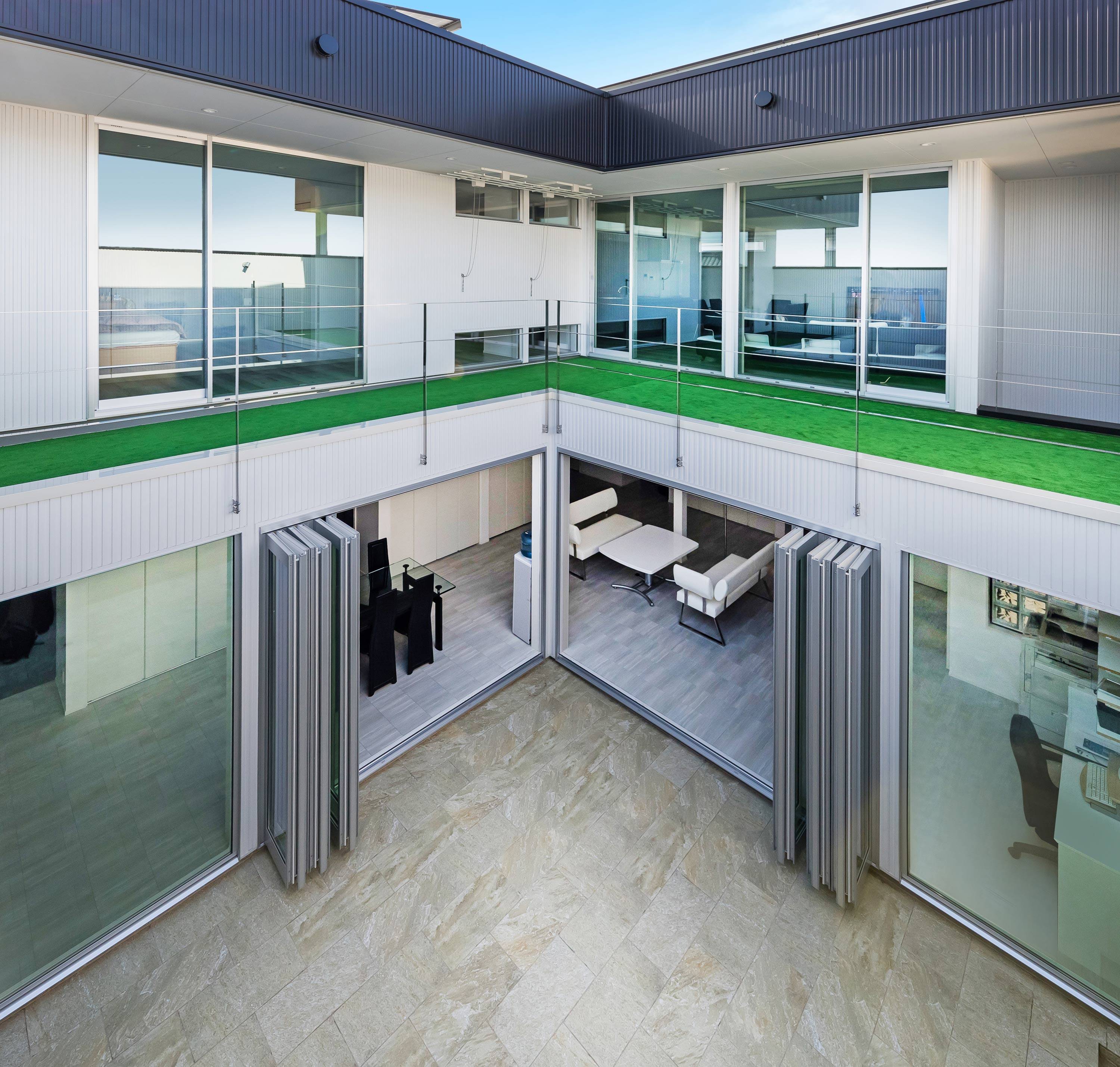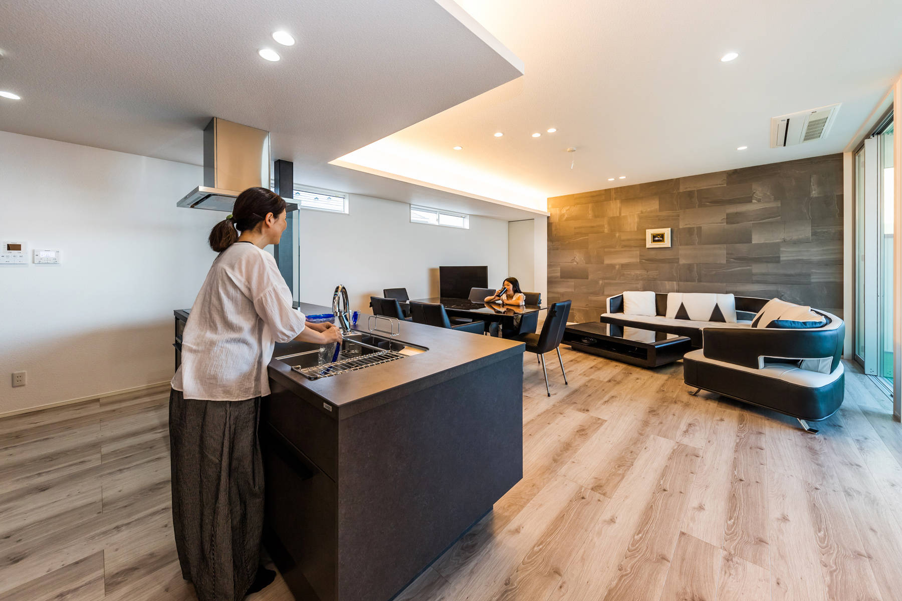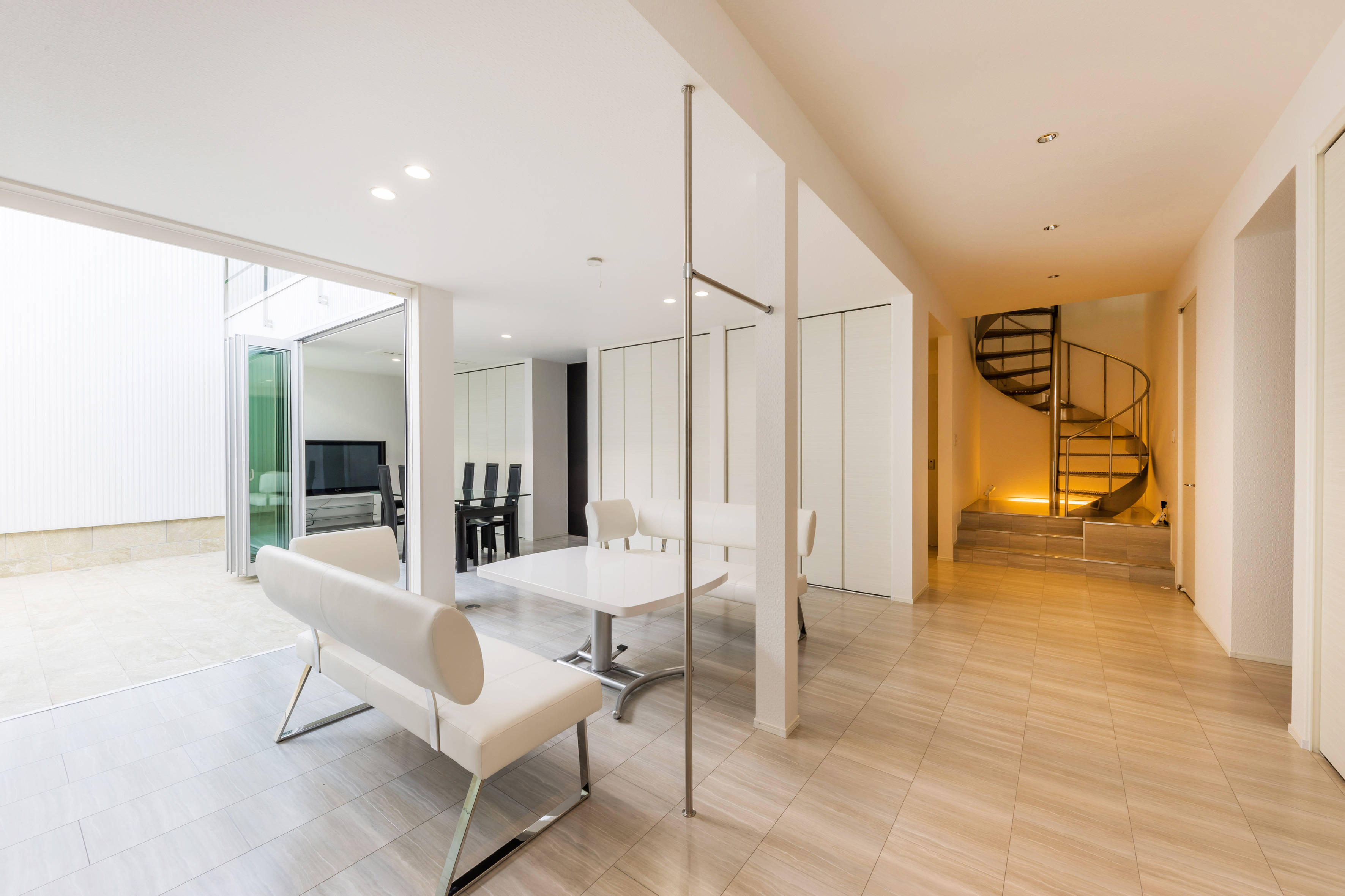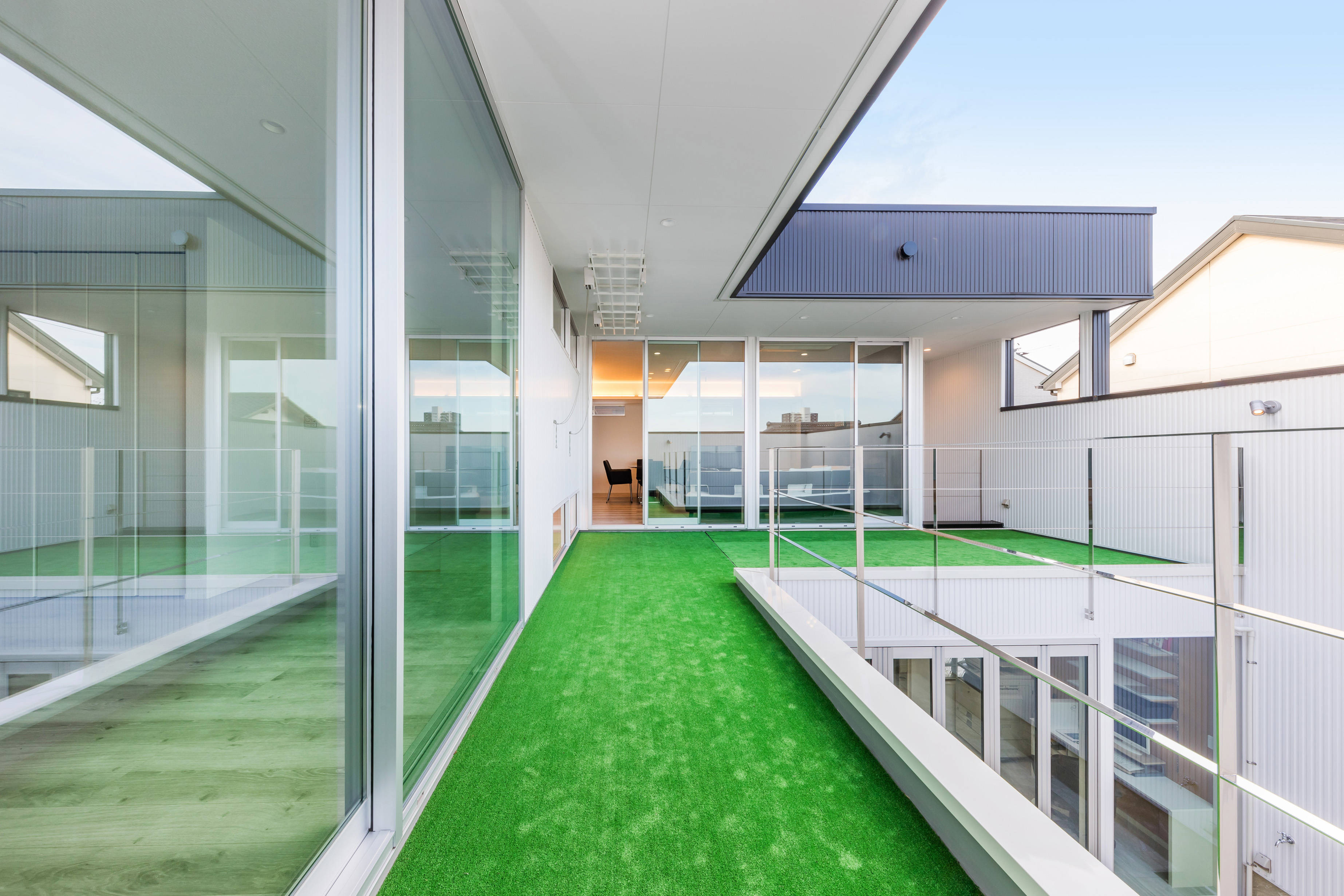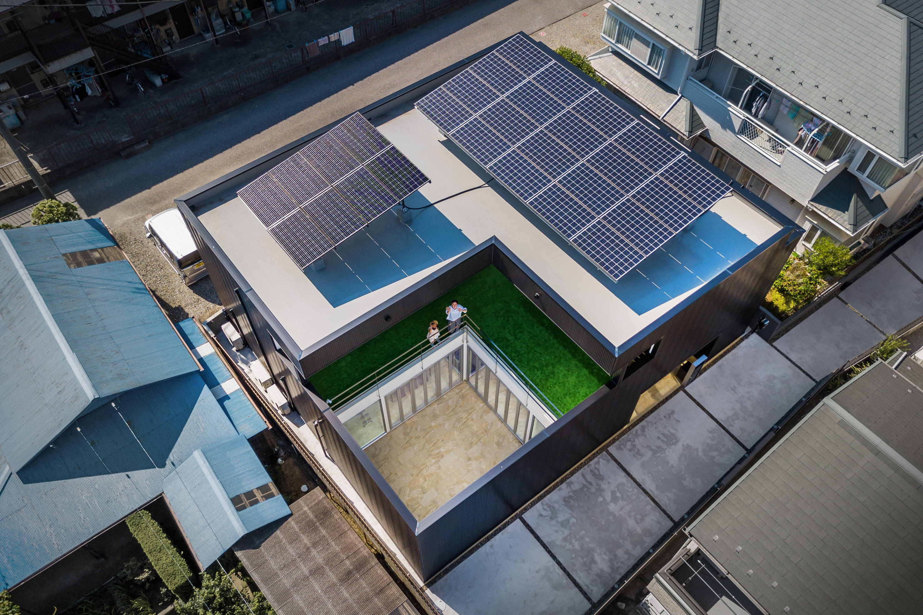 住宅ニーズが多様化する今、住まいの根源的ニーズである『持続する強さ』に着目し、本計画は、「災害」や「防犯」に強いこと、その強さを維持するため「ランニングコストの抑制」と「バリアフリー化」の達成を目標にしました。 具体的には、①耐震等級3、②堅牢な外壁、③太陽光発電とオール電化、④エレベーターの設置というシンプルな要素で実現し、こうして生まれた住まいを『ストロングハウス』と名付けました。 この家の特徴である、空に向かって段状に広がる「中庭」とそれを囲む円環状の構成は、採用した4つの要素から導き出し、設備だけに頼りがちな現代の住宅とはちがった、身体的な豊かさを享受できる住まいを目指しました。
