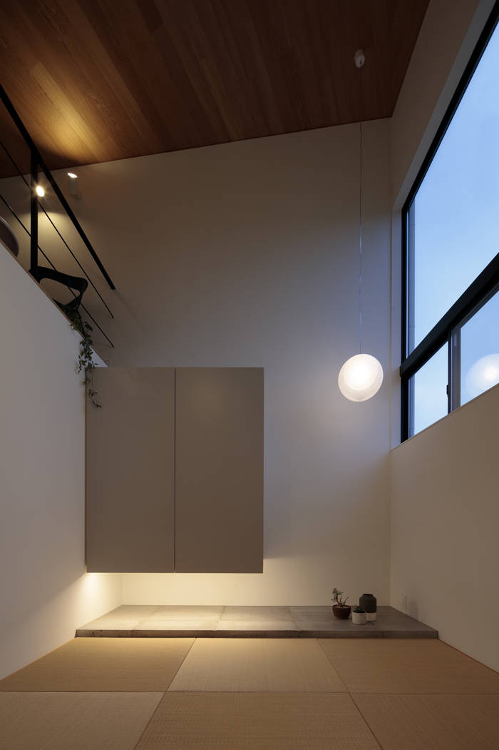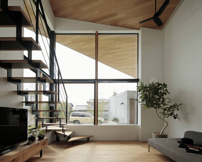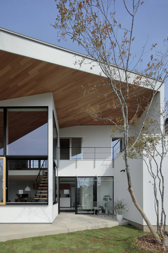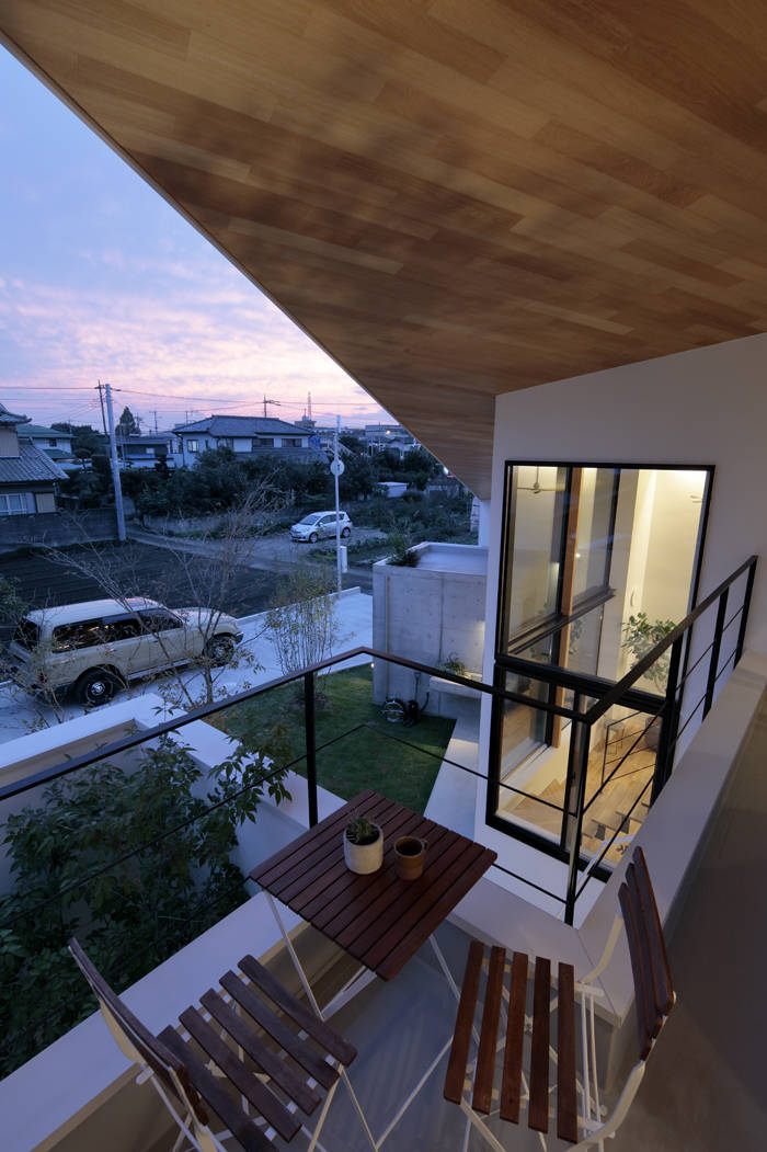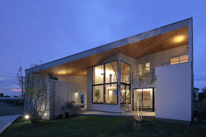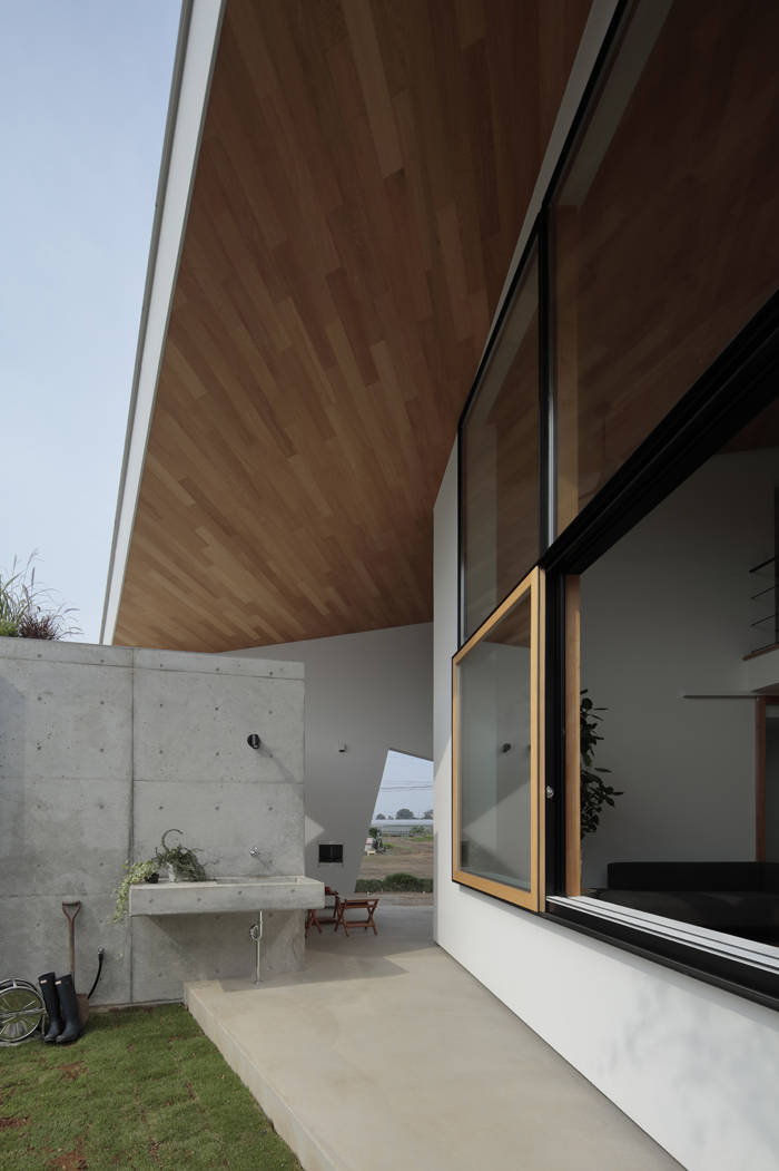 敷地は太田市の西の端に位置し、田畑が広がる中に点在する集落内にある。 東側に隣家がある以外は畑に囲まれるなかで、プライバシーの確保と外部への広がりと繋がりが求められた。 施主は客を招いてのバーベキュー等が好きで、家の中と外との動線や繫がりの利便性や開放性が重要であるが、西側の道路や少し離れた家々からの視線等への考慮を必要とした。 南西に向かって低くなる長く深い軒を、外部と内部を一緒に包むように出し、吹き抜けのあるリビング空間が突出し、第二のエントランスである土間が引き込まれている。軒下が深くなった土間は、プールやバーベキューができるテラスとなっている。 軒下にはコンクリートの箱が置かれ、外部収納を兼ねるとともに、リビングやテラスなどの寛ぎ空間を視線から守っており、周囲を気にせずに活動的な日常を送ってもらえればと思う。