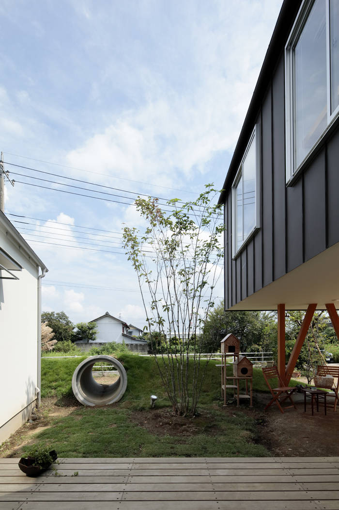土手は中庭と外庭を分け、もともとの大きな敷地から自分達の領域を切り取り、囲われた場所と拡がる場所を作り出す。