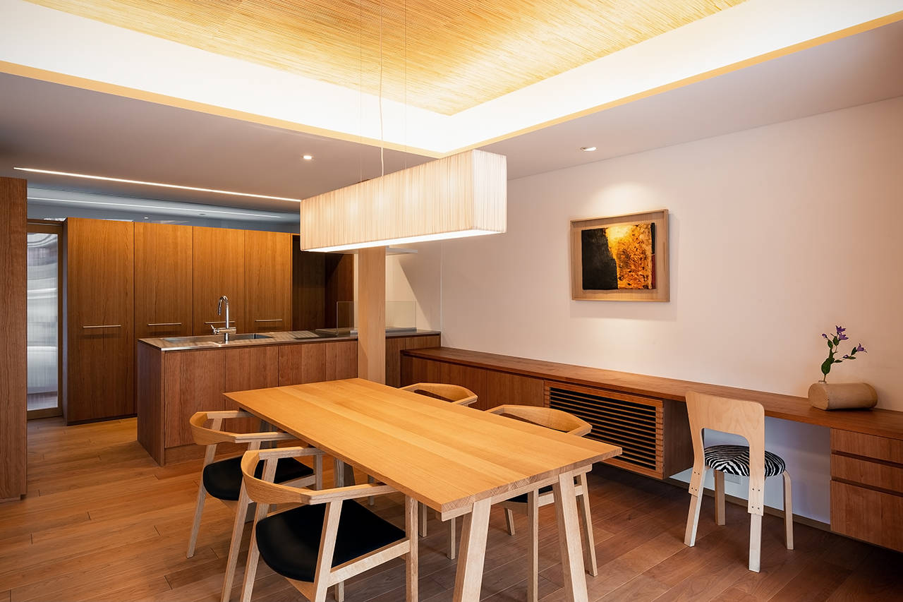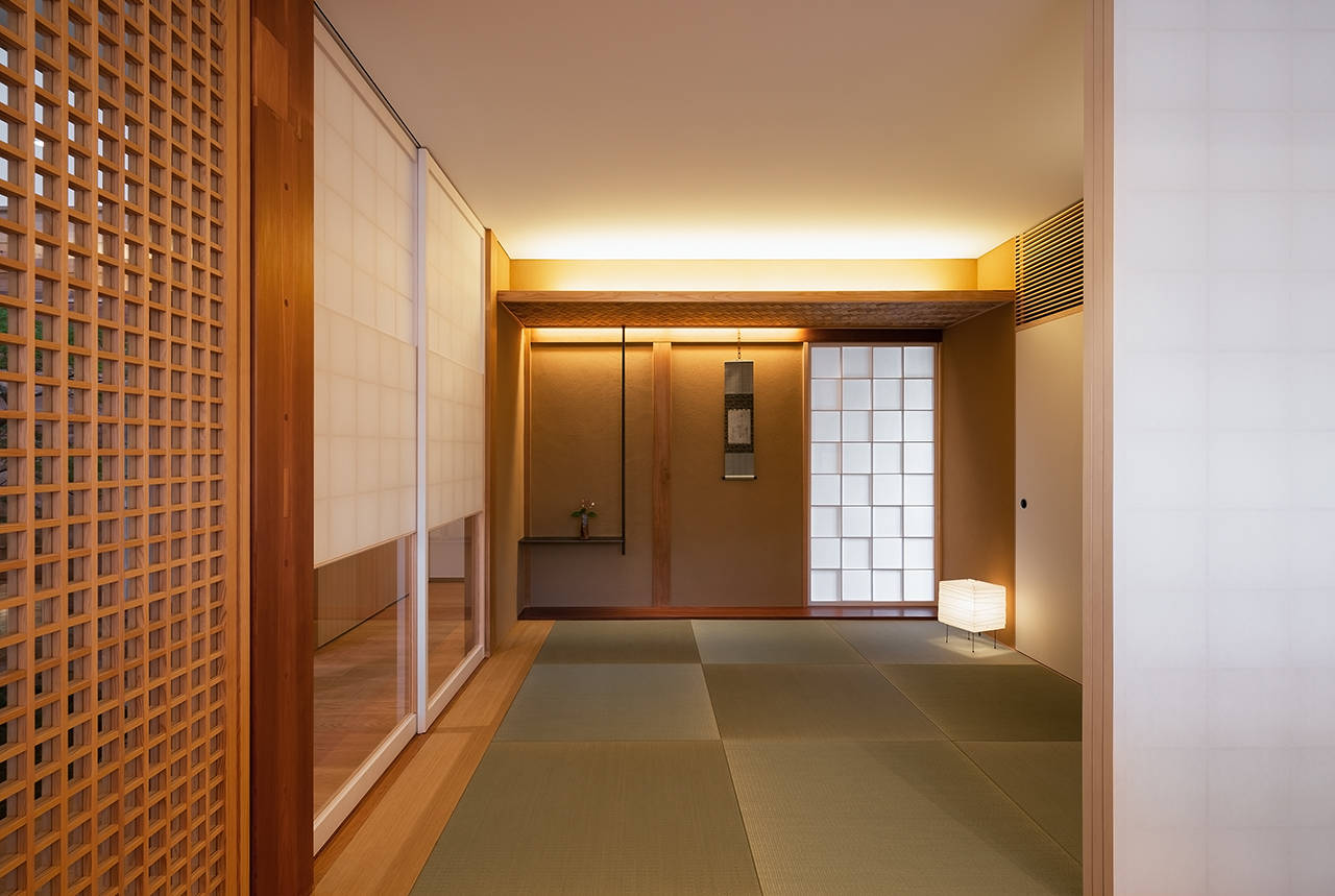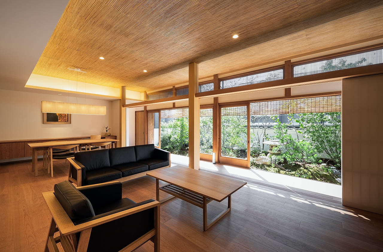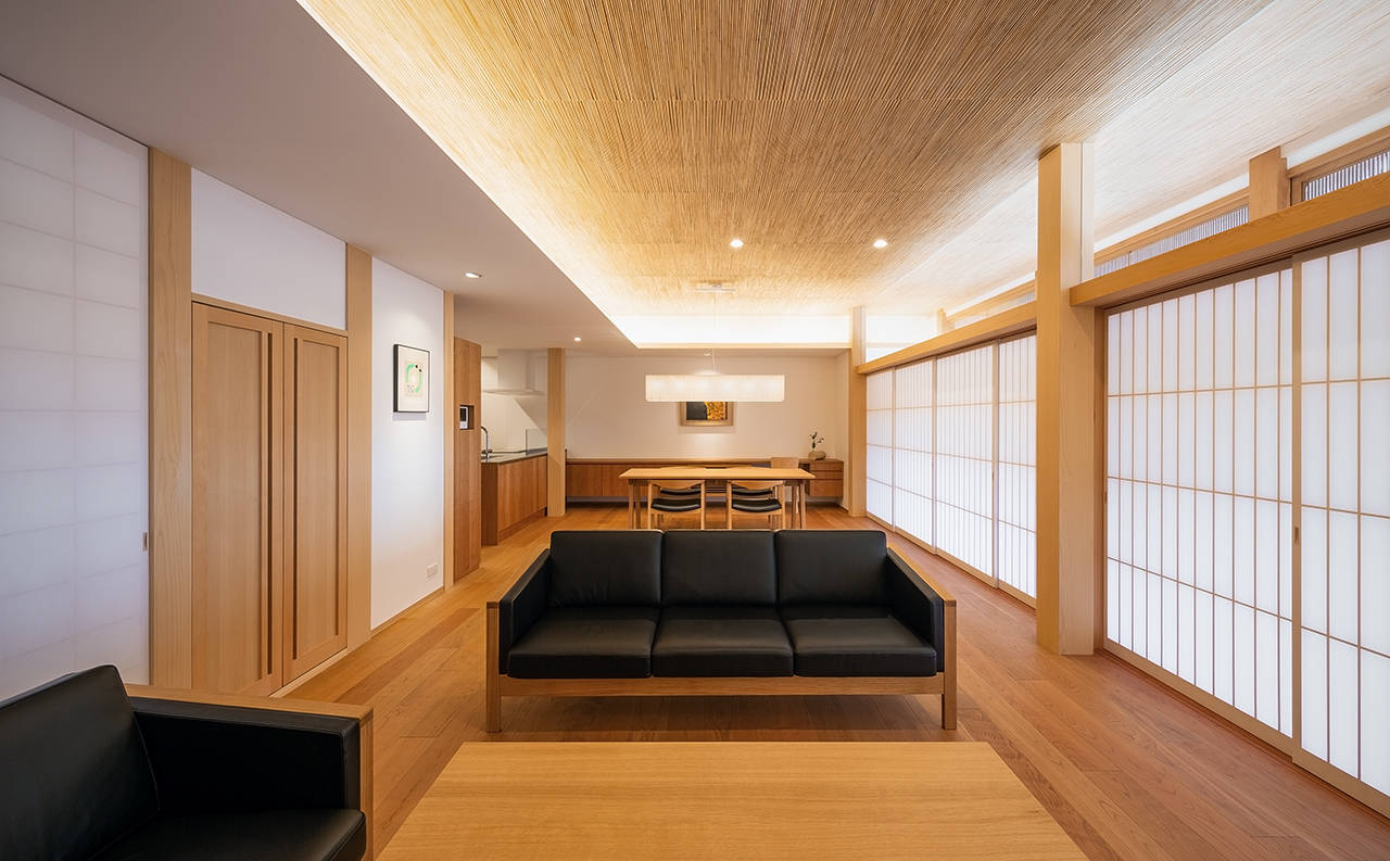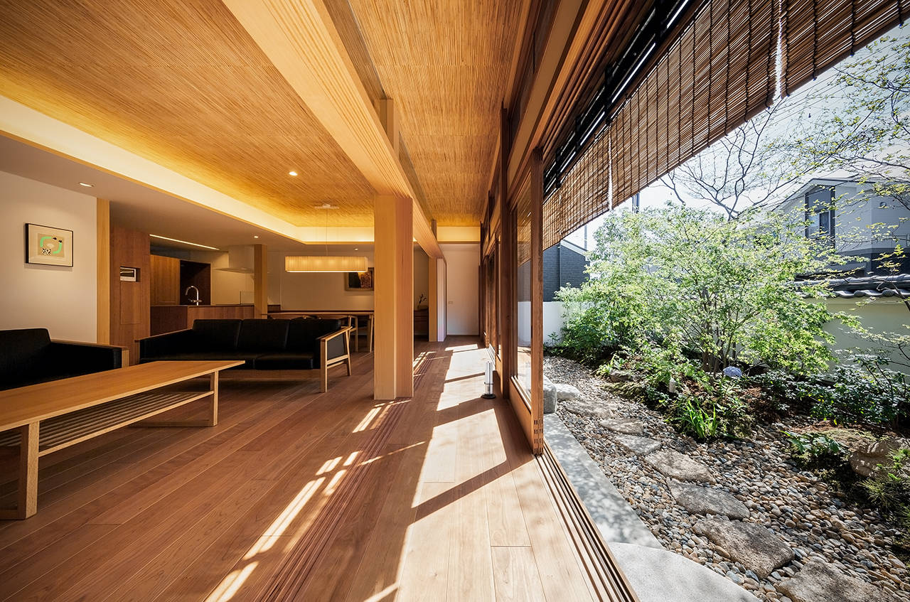 この住宅は、岸和田市の東部に建っている。母親と娘の親子が、築30年程経った入母屋平屋建の和風住宅を購入した。その住宅を、光や風や緑など、自然を身近に感じられる和の雰囲気を持った、現代生活の気持ち良く暮らせる終の住処としてリノベーションである。購入された住宅は、南側道路沿いの主庭に木が1本も無く、防草シートが敷かれ、灯篭が一基ポツンと置かれていた。予算上、外観は改修せず、外部環境に配慮しながら、主庭を再現して、内部を機能的に全面改修を考えた。天井を高くしたLDKの一室空間と、障子で仕切られた和室が、縁側を介して、主庭と一体となる。内部の漆喰や、葦簀の自然素材と相まった空間の中で、親子が豊かな時間を過ごし、季節の移ろいを感じながら暮らせる住まいを計画した。