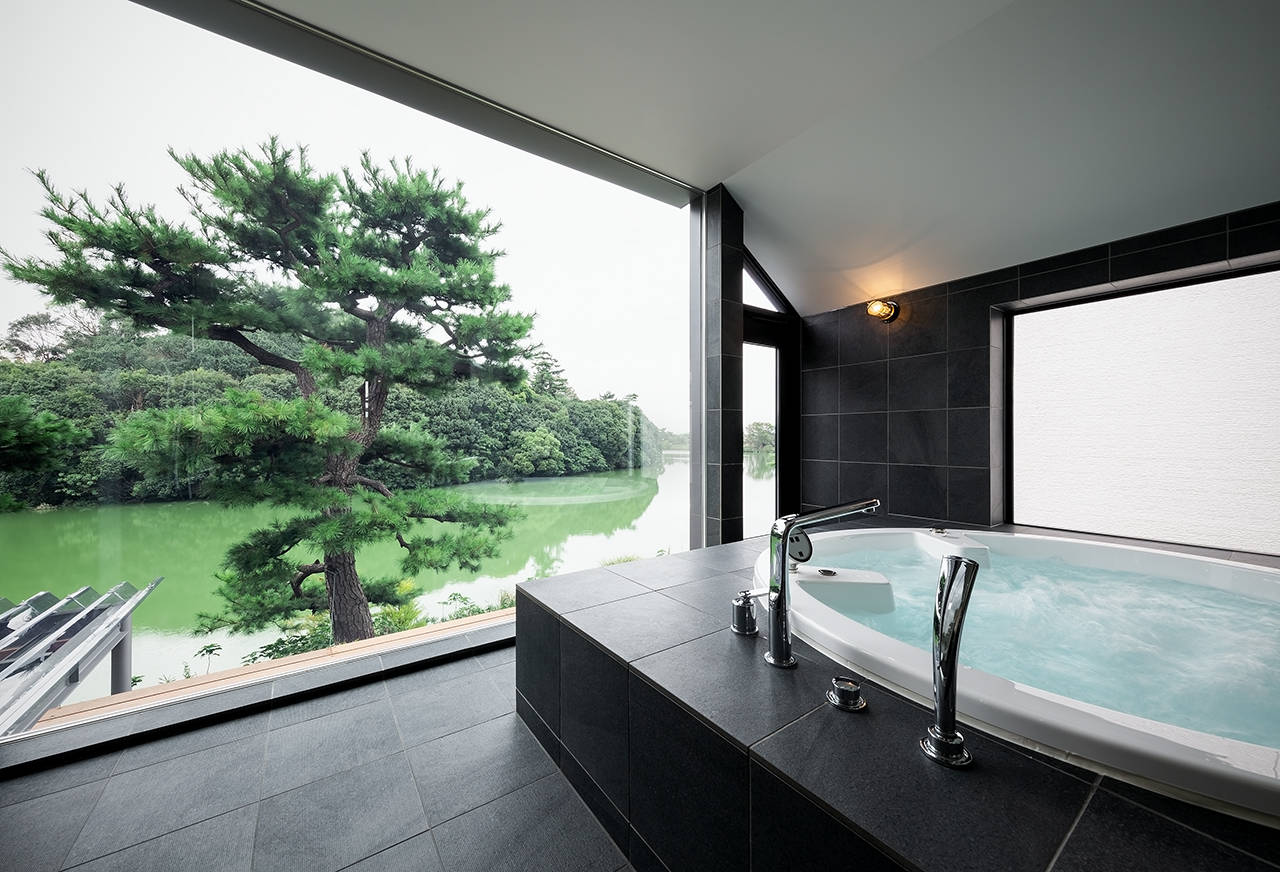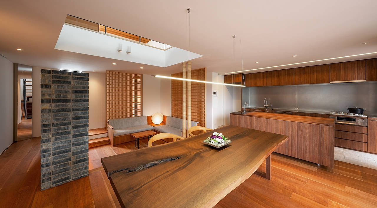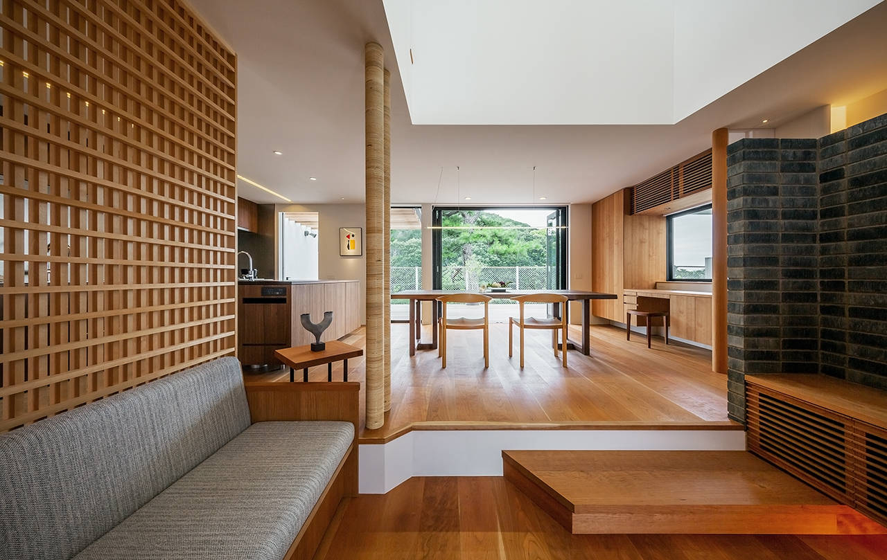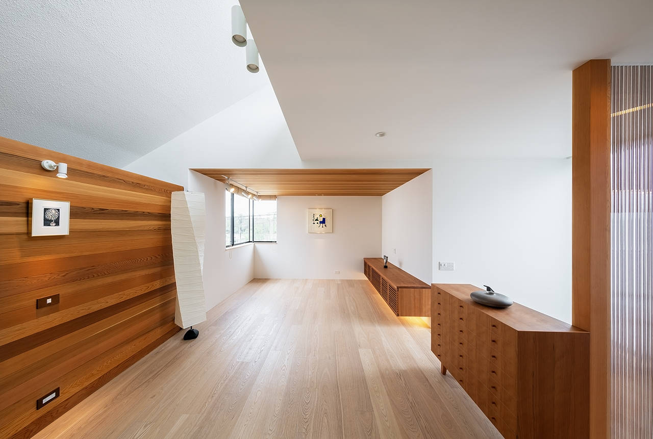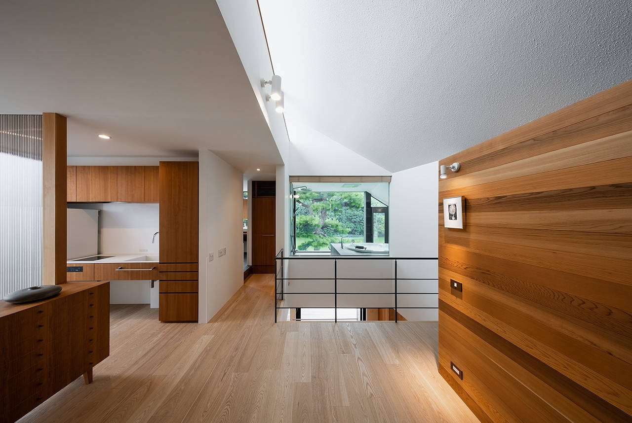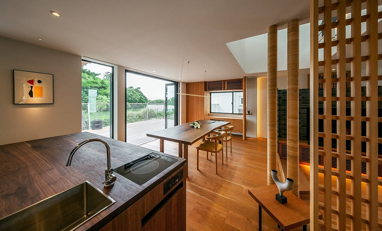 建物は、堺市の「百舌鳥・古市古墳群」世界文化遺産国内推薦に含まれている履中天皇陵に面している。東側の購入された住宅と今住んでいる住宅をブリッジで繋ぎ、プライベート棟と、パブリック棟に分け、御陵の緑と水や風など、季節の移ろいを感じながら暮らせる家族4人のリノベーションである。住みながら工事が出来るように、1期・2期に分けて進めた。完成した1期工事のパブリック棟は、1・2階共南側を全面開口部にして、御陵の景色を取り込んだ。1階は、広いデッキテラスを介してリビング・ダイニング・キッチンの一室空間と水面が繋がる。又、2階の洗面・浴室からの眺めや、夕日を楽しむことができる。引き続き2期工事が始まっている。