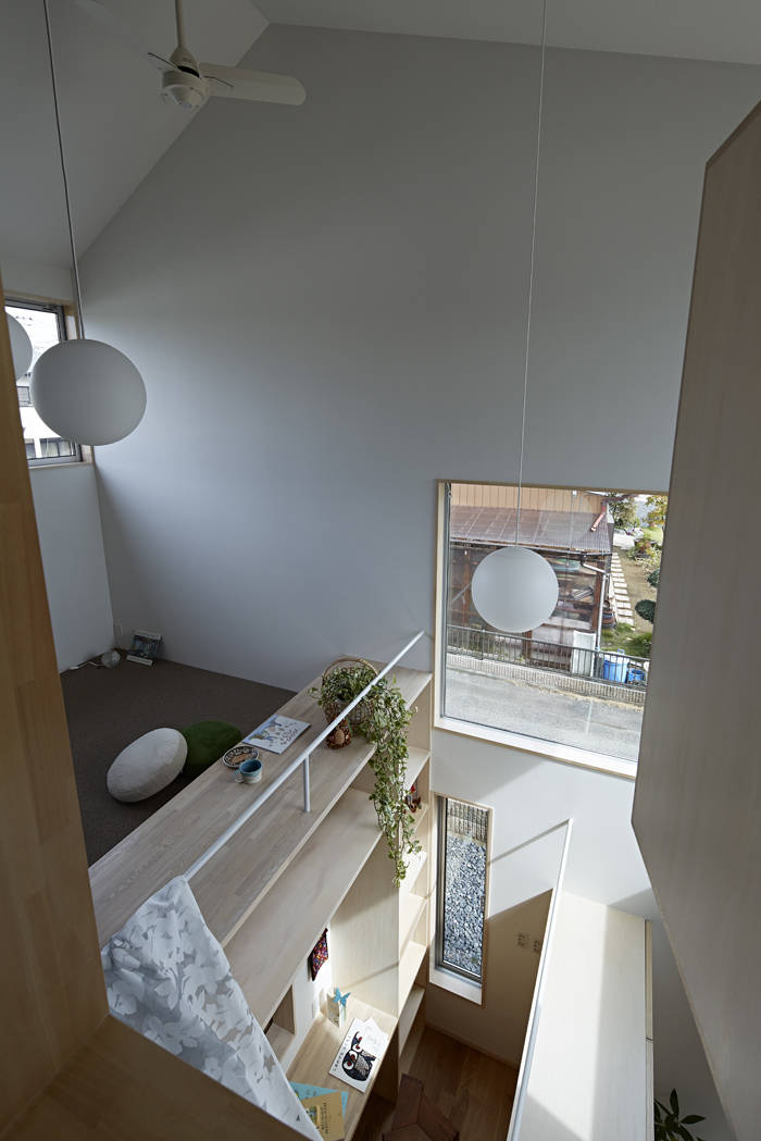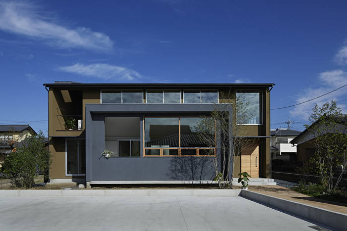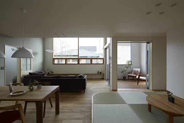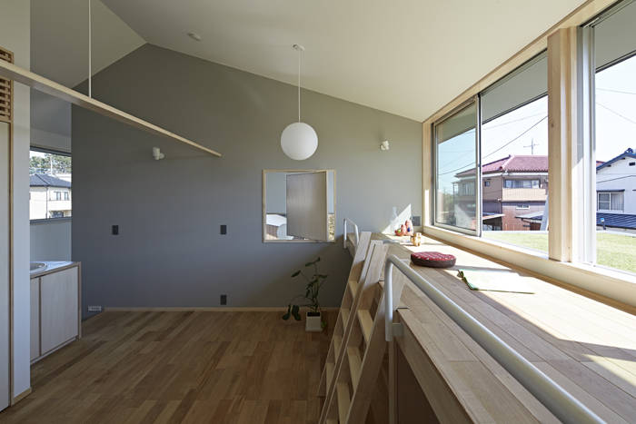 | 敷地は太田市中心の北東に位置し、古くからある集落と新しく分譲された家々が混ざり合うような地域でアクセス道路も細く、この辺りとしては建物が密集している。ただ、南側は平屋建てで、西側隣家のお庭もとても広く、空が開けている。 ”お日様がたくさん入る温かい家がいいのだけれど、外からの視線も気になる。”という施主の話しと大きな空を取り入れる事を両立させるため、南側の開口は大きいのだけれども高く設え外部からの視線を腰壁で遮り、せり上がった天井は邪魔することなく光を部屋の奥へと導いている。ずれあがったボリュームの上は子供室のベットと芝屋根。 吹き抜けや水廻りを東西に配し、建物の中央部に家族で長く過ごすリビングやダイニングを置き、温熱環境を整えた家族を包み込むようなやさしいいえとなるよう計画した。 |