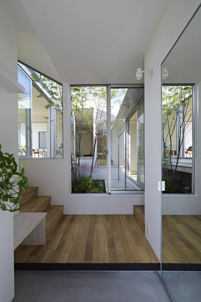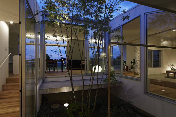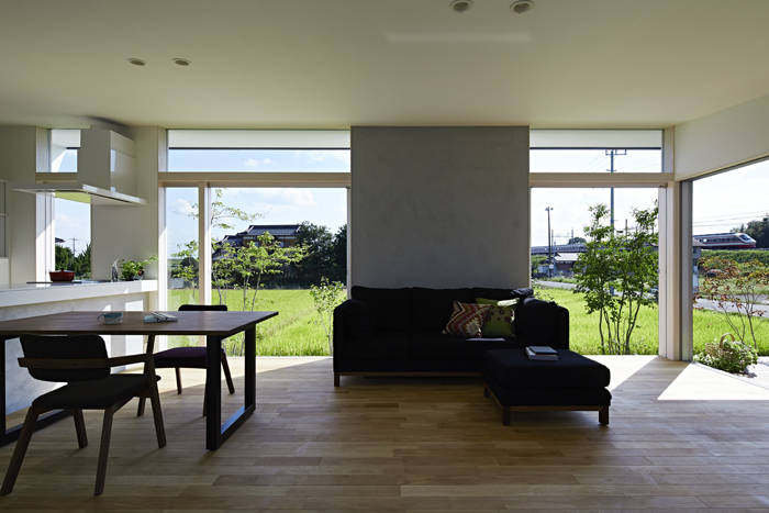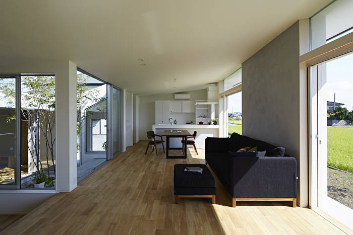 | 東側にお隣はいるのだけれども、田んぼの中にポツリと置かれたような土地である。 仲良しご夫婦2人の為の家で、南側に広がる田んぼに向かって大きな開口を取り、中庭も持つ家である。 中庭を挟みつつ南側に行くにつれ床のレベルが上がっていく。南側開口は外部に対してより大きく広がり、四季折々の田んぼの変化を楽しむことができ、高さにより遠くの景色まで望み、取り込むと同時に、生活面が周囲より高くなった事により防犯やプライバシーを確保している。 内部空間においては、床レベルがずれていくことにより空間同士が、部屋同士が相対するのではなく、ゆるやかにつながっていくような感覚を出している。 そこに暮らす2人がお互いの存在を相対するのではなく、やさしく感じられるような空間にしたいと思った。 |