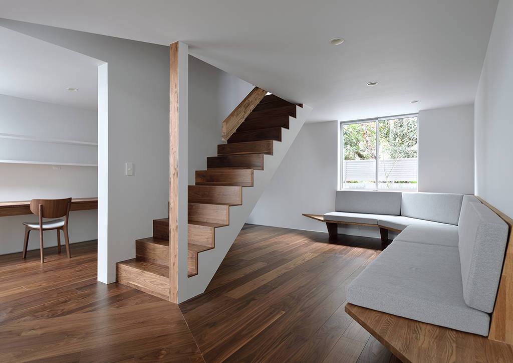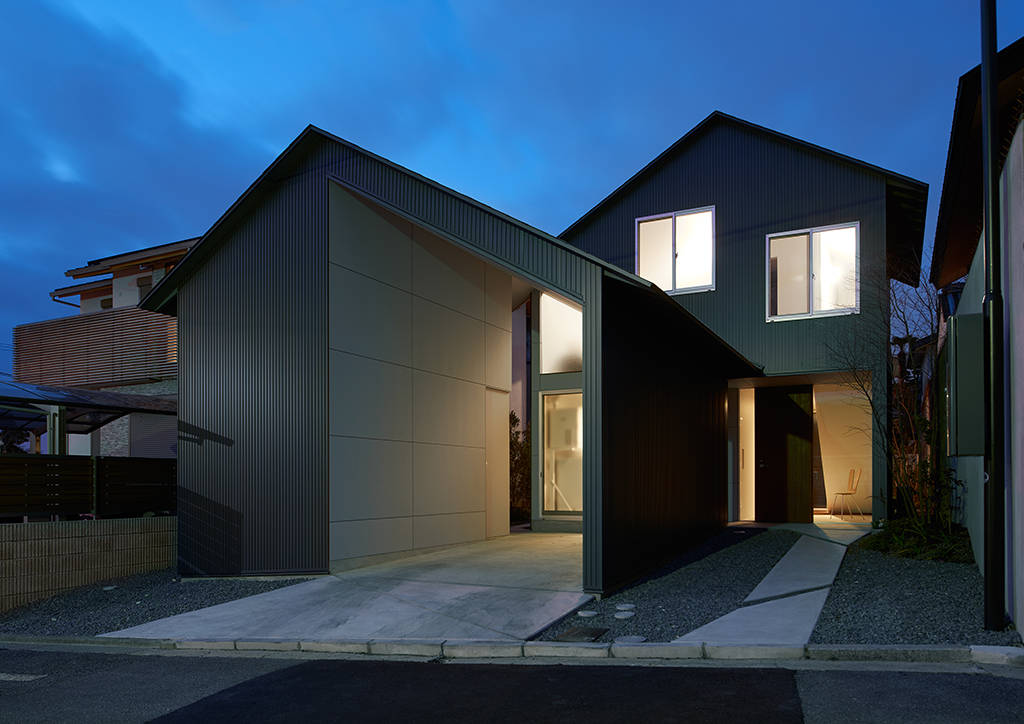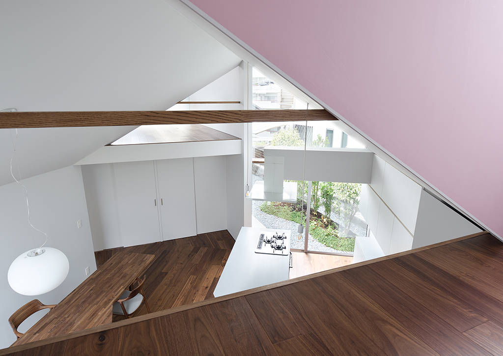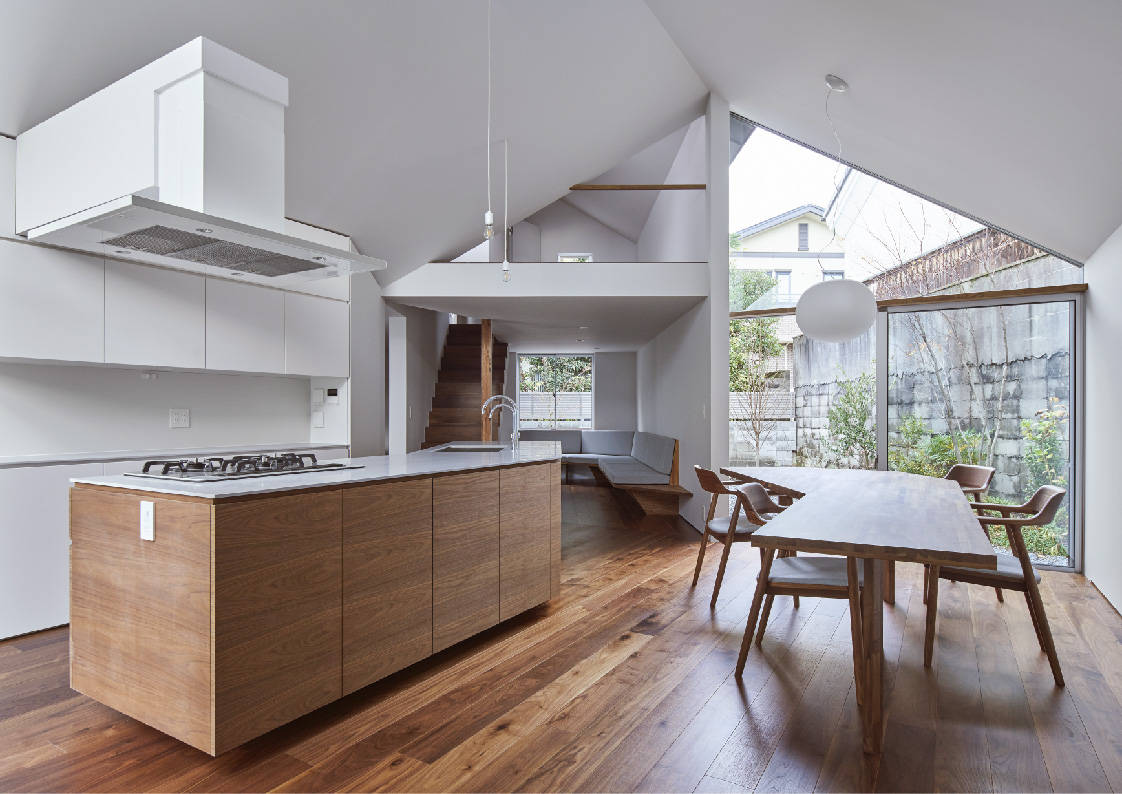 景観規制に対応した切妻屋根を出発点として、まず敷地に沿った長い建物を、4つにカットして南北面から採光・通風できる空地がうまれるよう東西にずらす。4つの棟は道路側から駐車場棟、水まわり+寝室棟、ダイニングキッチン棟、そして書斎リビング+子ども室棟となっており、1.5層と2層の棟を繰り返すことで高さ方向にも空地がうまれる。住宅の要となるのが1.5層のダイニングキッチン棟で、大きなアイランドカウンターを中心に1階のリビングや書斎、玄関・水まわりは水平に、2階の寝室と子ども室とは切妻から屋根づたいにつながりあっている。