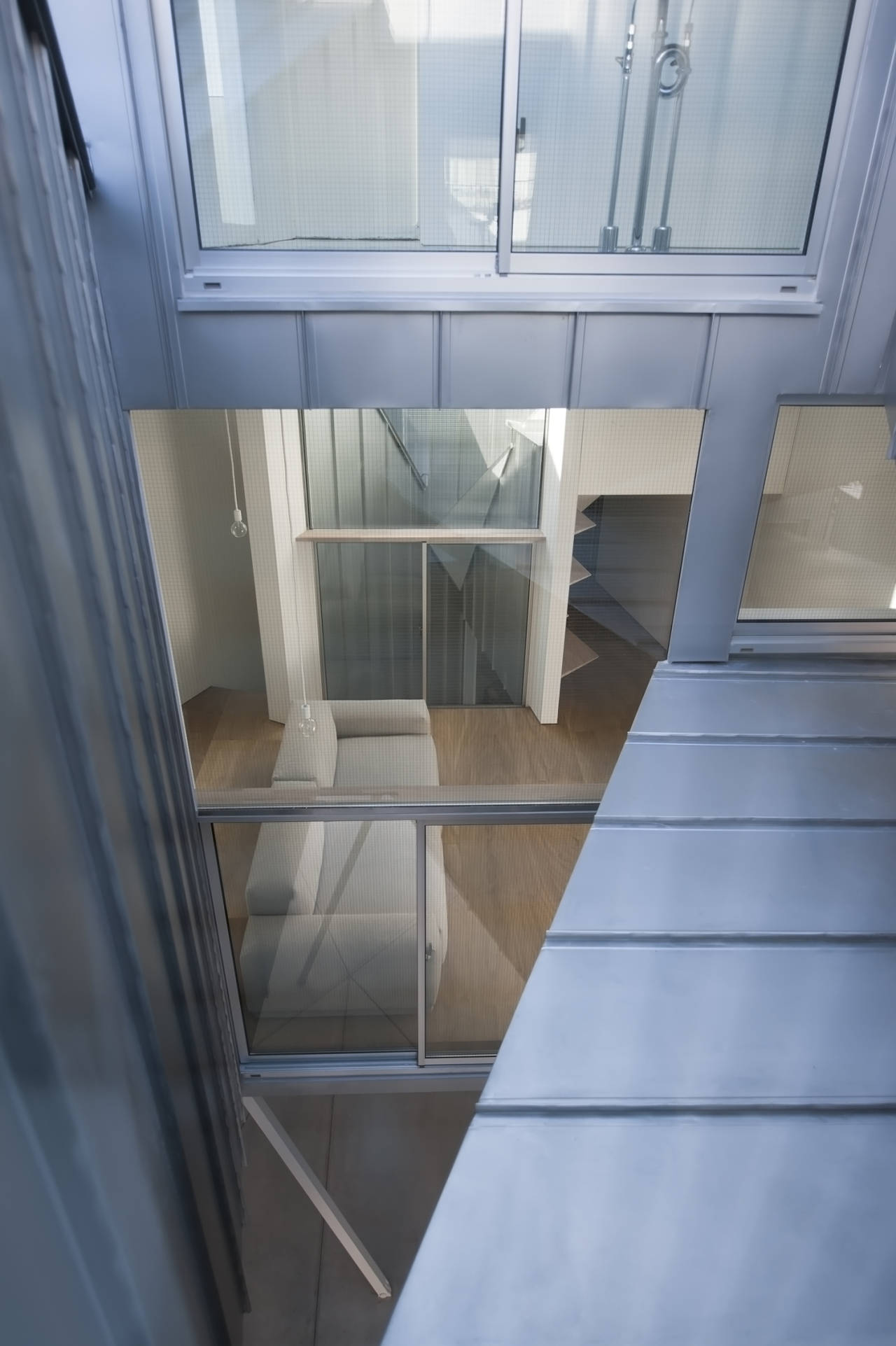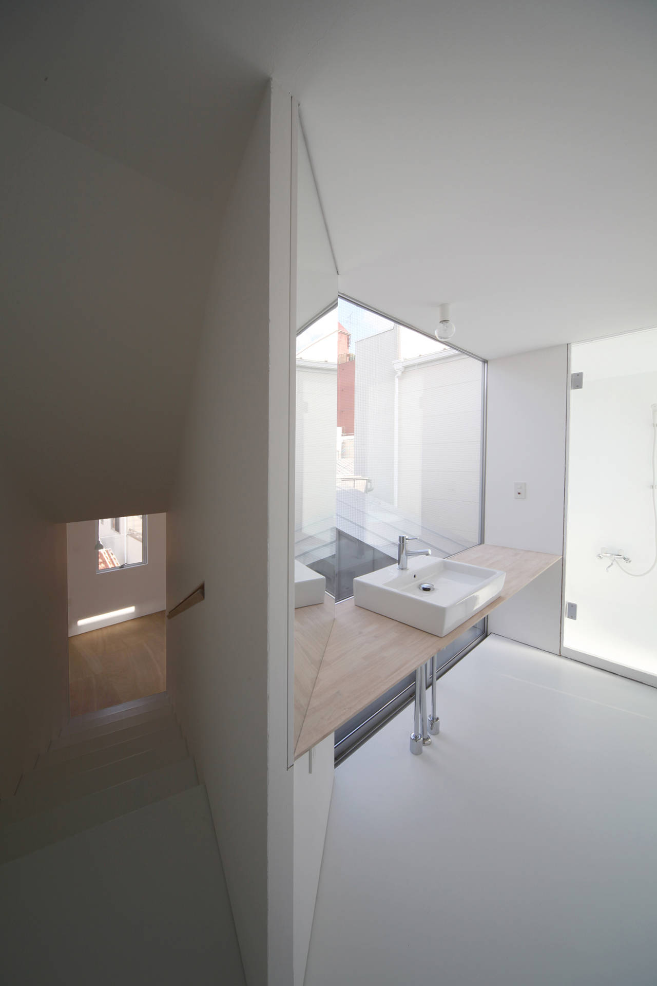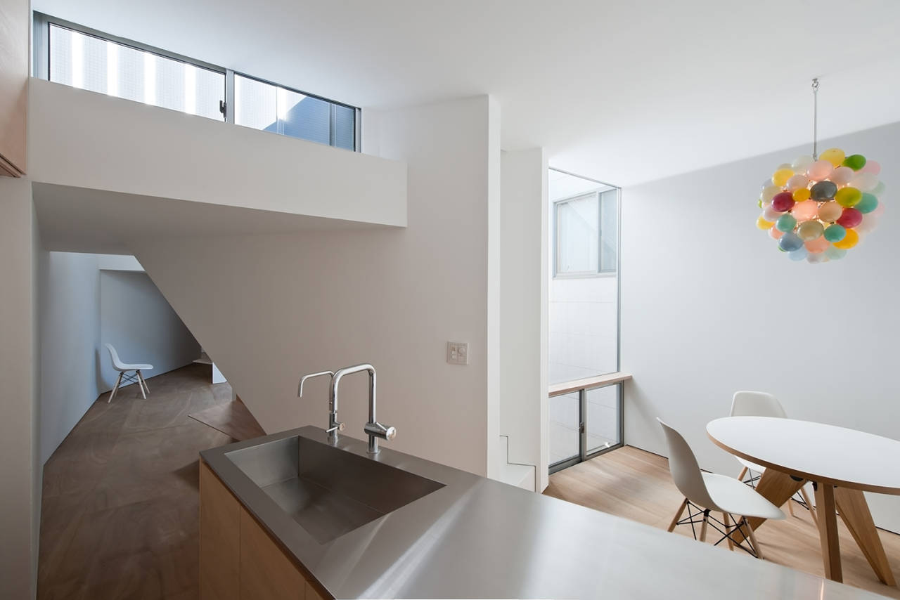 大阪都心の住宅。採光のため、ふたつの中庭をもつ3つの棟からなり、部屋と部屋はそれぞれ中庭を横断するチューブ状の廊下あるいは階段室でつながる。通過頻度の高い部屋にはたくさんのチューブがつながり、住宅内には幾重にもループを描く動線が実現する。部屋と部屋の関係は一義的には決まらず、動き方によって、関係も空間の様相も変化する。また空に穴をうがつチューブは、内部空間同士をわけながらつなぐだけでなく、建てこんだ周辺の環境をさえぎりながら、かいまみせる。