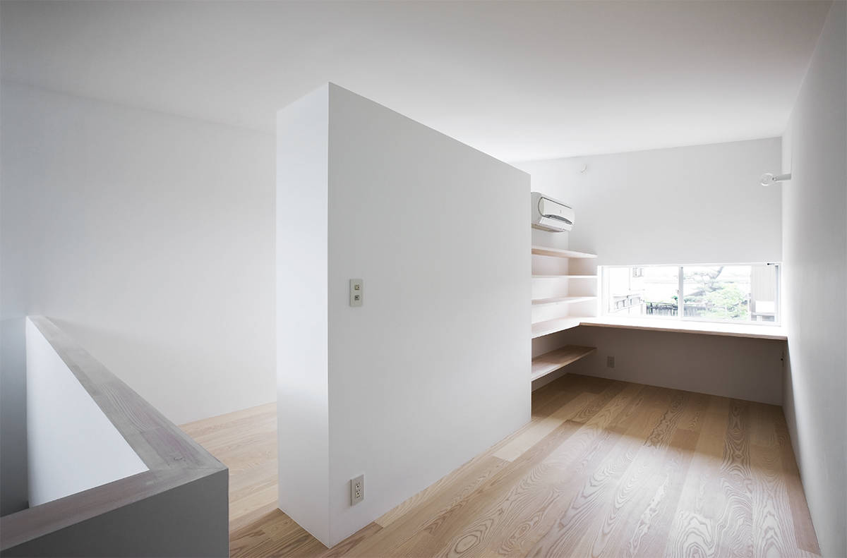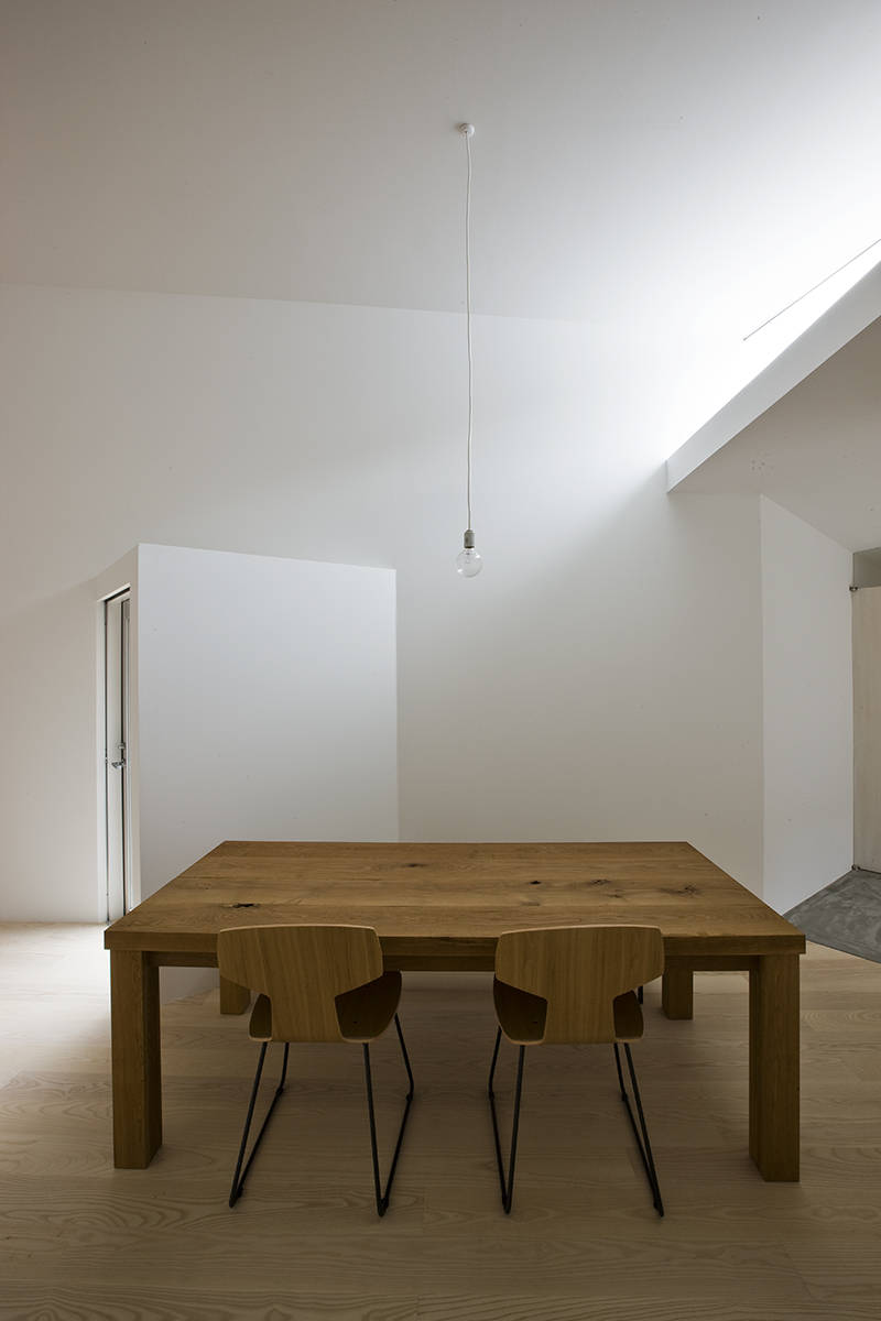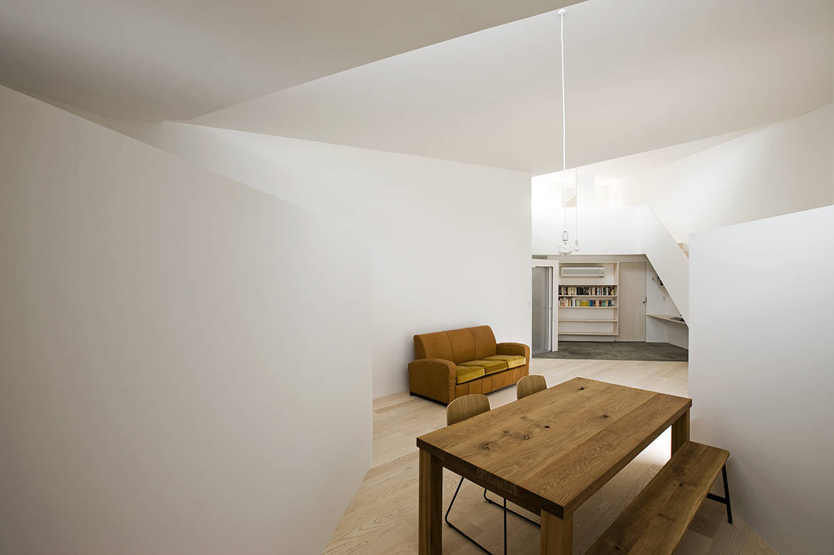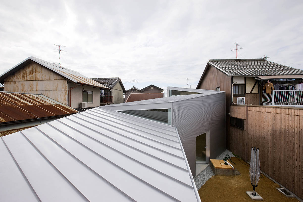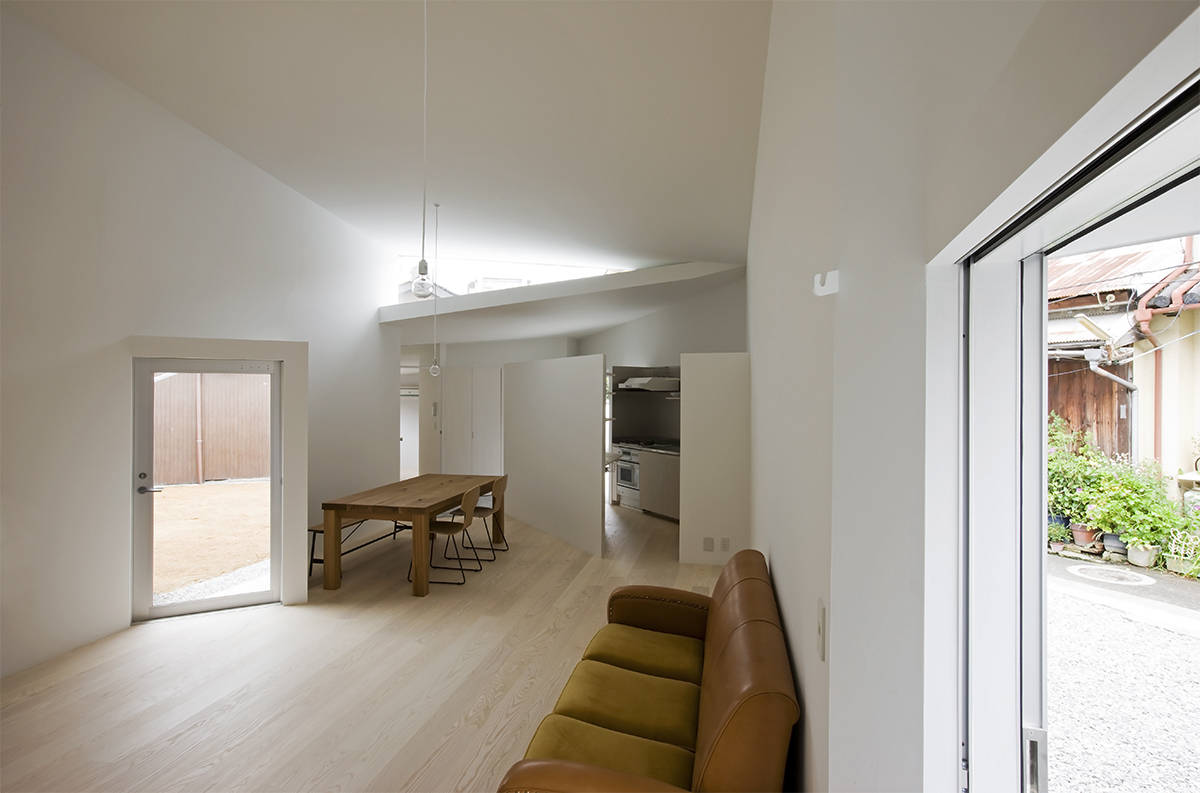 木造家屋が密集する古くからの商業地域にたつ住宅。敷地にそって細長い長方形を2ヶ所おりまげて庭を形づくると同時に、おりまげた部分の屋根の段差を利用してハイサイドライトをもうけた。1層から2層へと次第に天井の高くなる、光と風の大きなヴォリュームの中に、2ヵ所の土間、高さ2mにそろえ、45度にくいこむ3ヶ所の出入口・キッチンブース・家具が点在し、人の居場所によってさまざまな光や風のゆらぎがおこる。