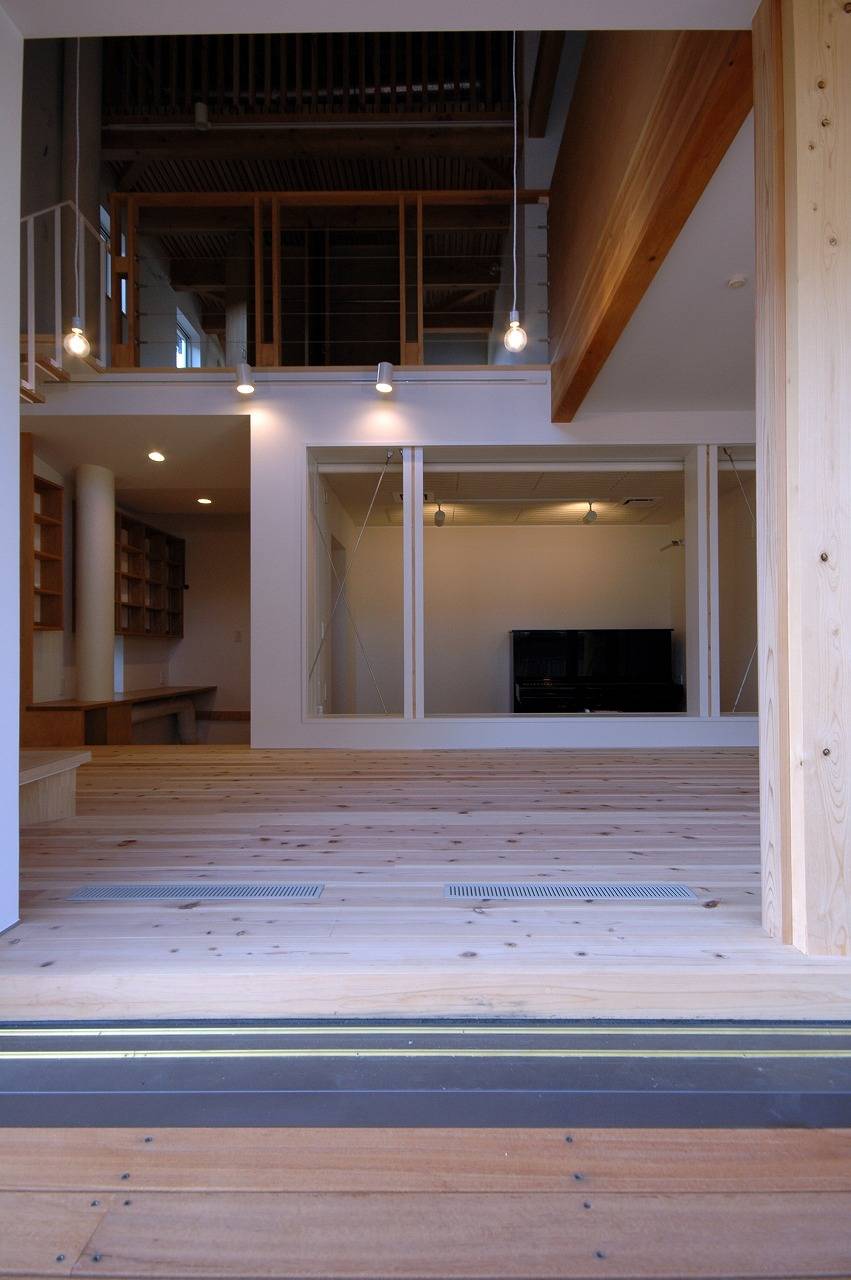 ほぼ正方形の家の真ん中に音楽室があります。閑静な住宅街で楽器を演奏する音楽室を設ける場合、音が外にもれないことは重要です。家の真ん中に音楽室を配置できる敷地は最適で、家の中にいれば少し音がもれても外部には音がもれません。