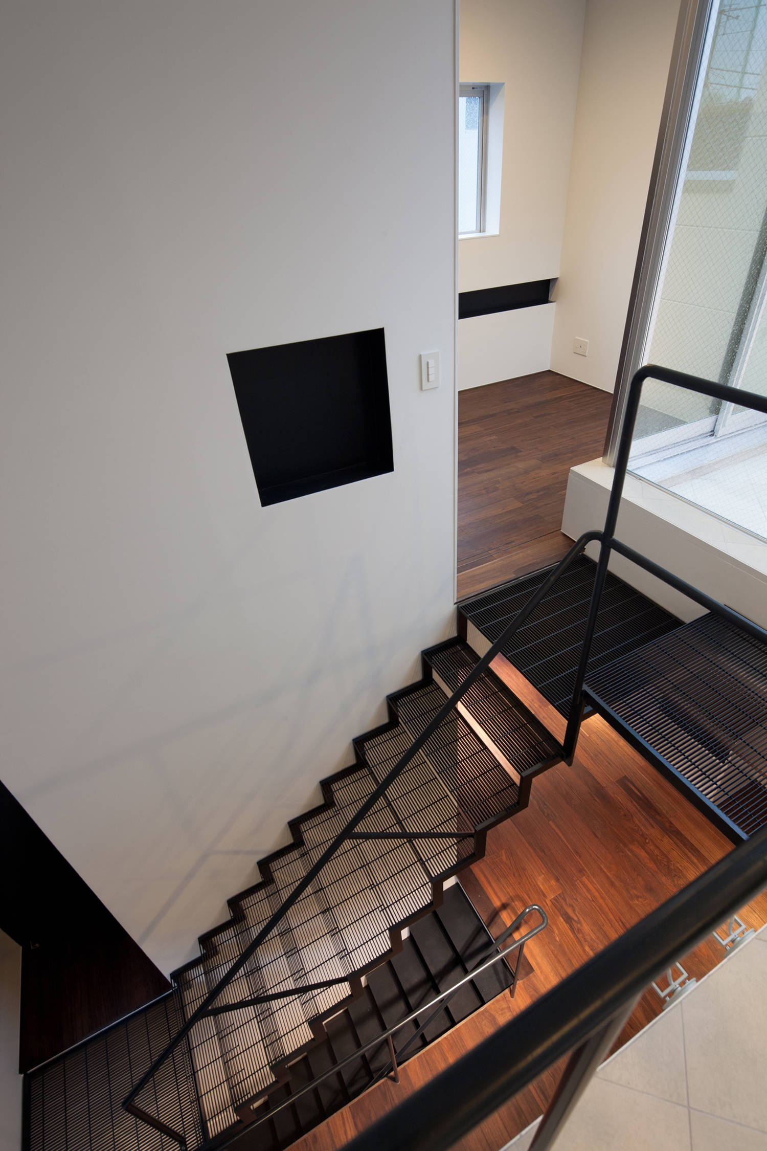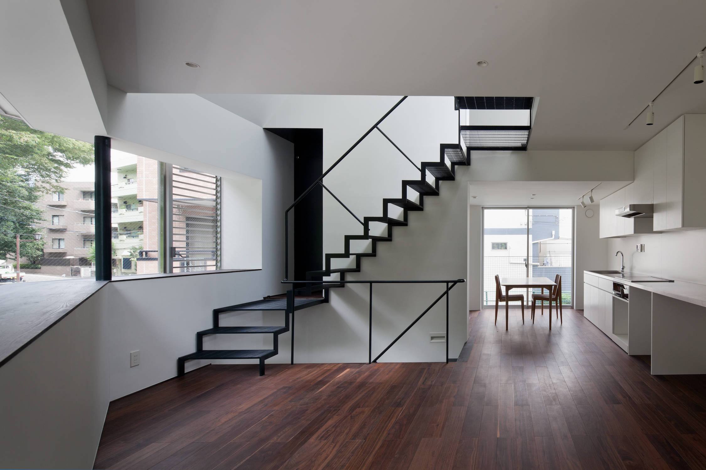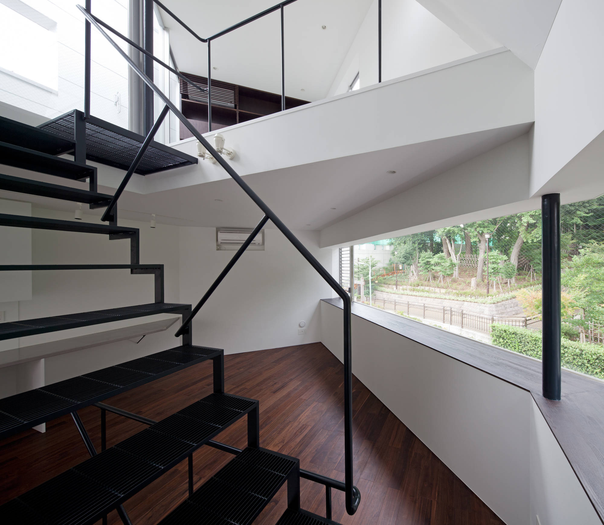 51平米の五角形の変形敷地の中に、駐車場や中庭の外部空間を設けました。この外部空間と公園に対して、色々な形の窓を開け、様々な方向に視界が広がる開放的な住宅を作りました。