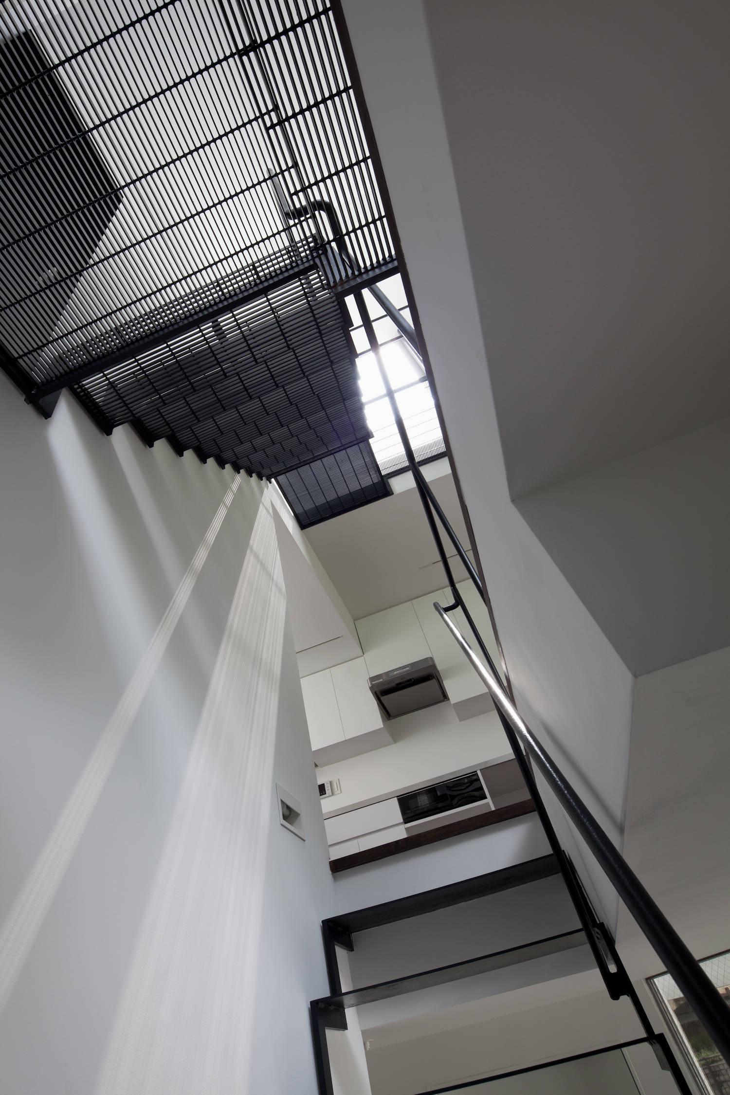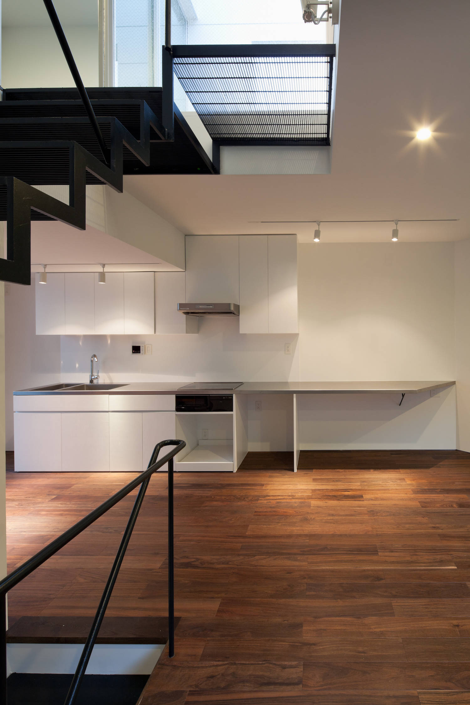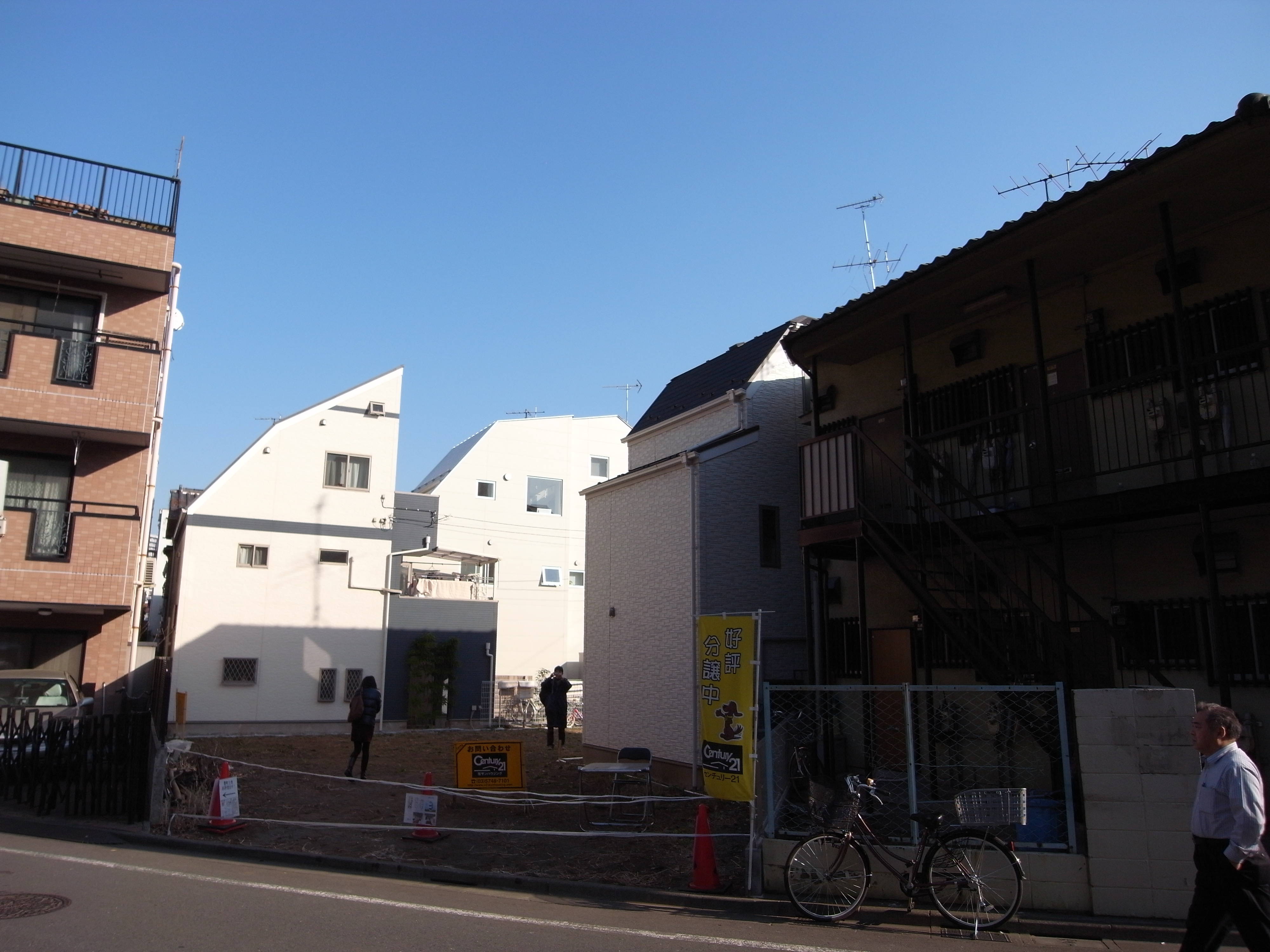 51平米の五角形の変形敷地の中に、駐車場や中庭の外部空間を設けました。この外部空間と公園に対して、色々な形の窓を開け、様々な方向に視界が広がる開放的な住宅を作りました。
