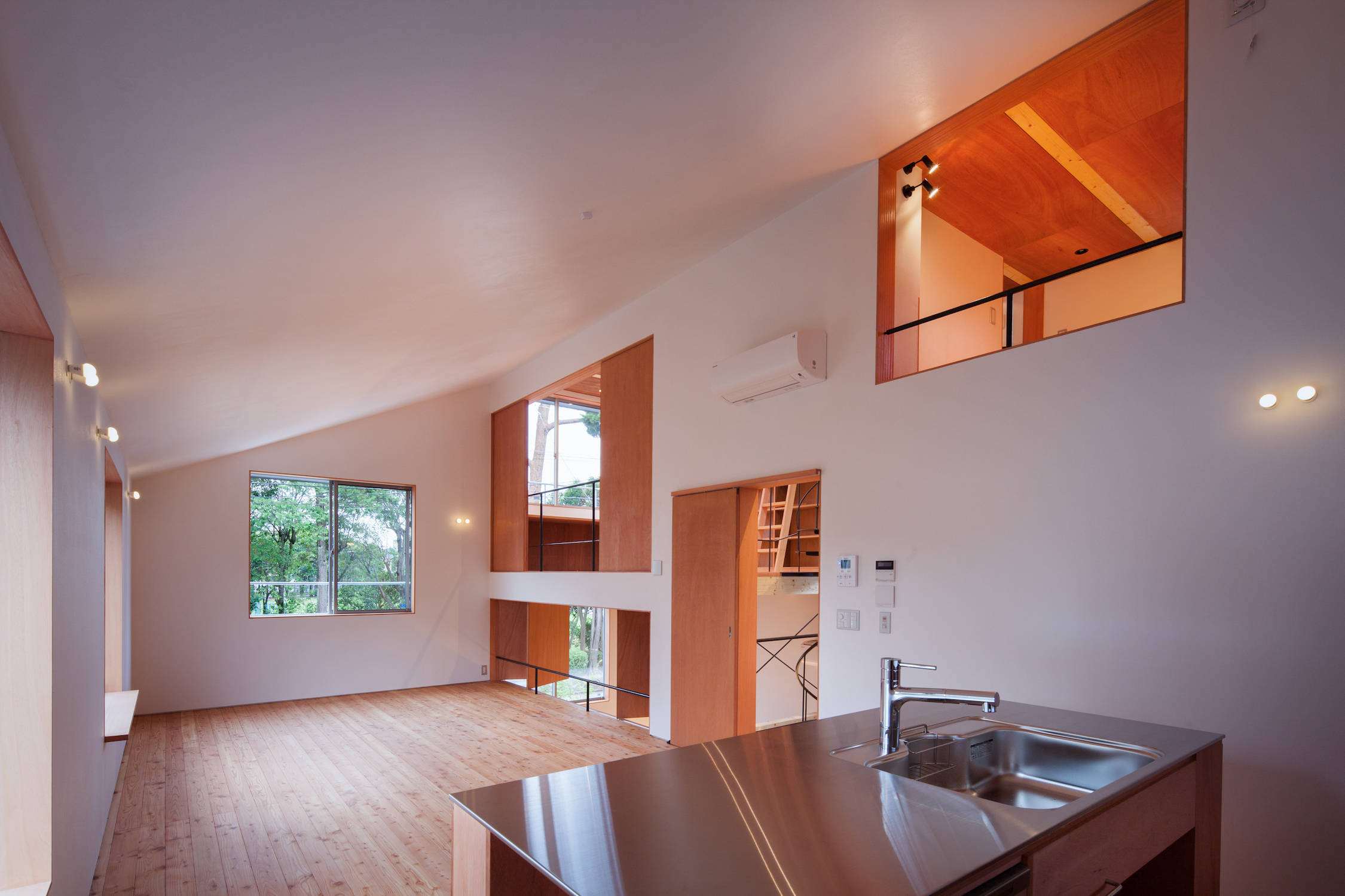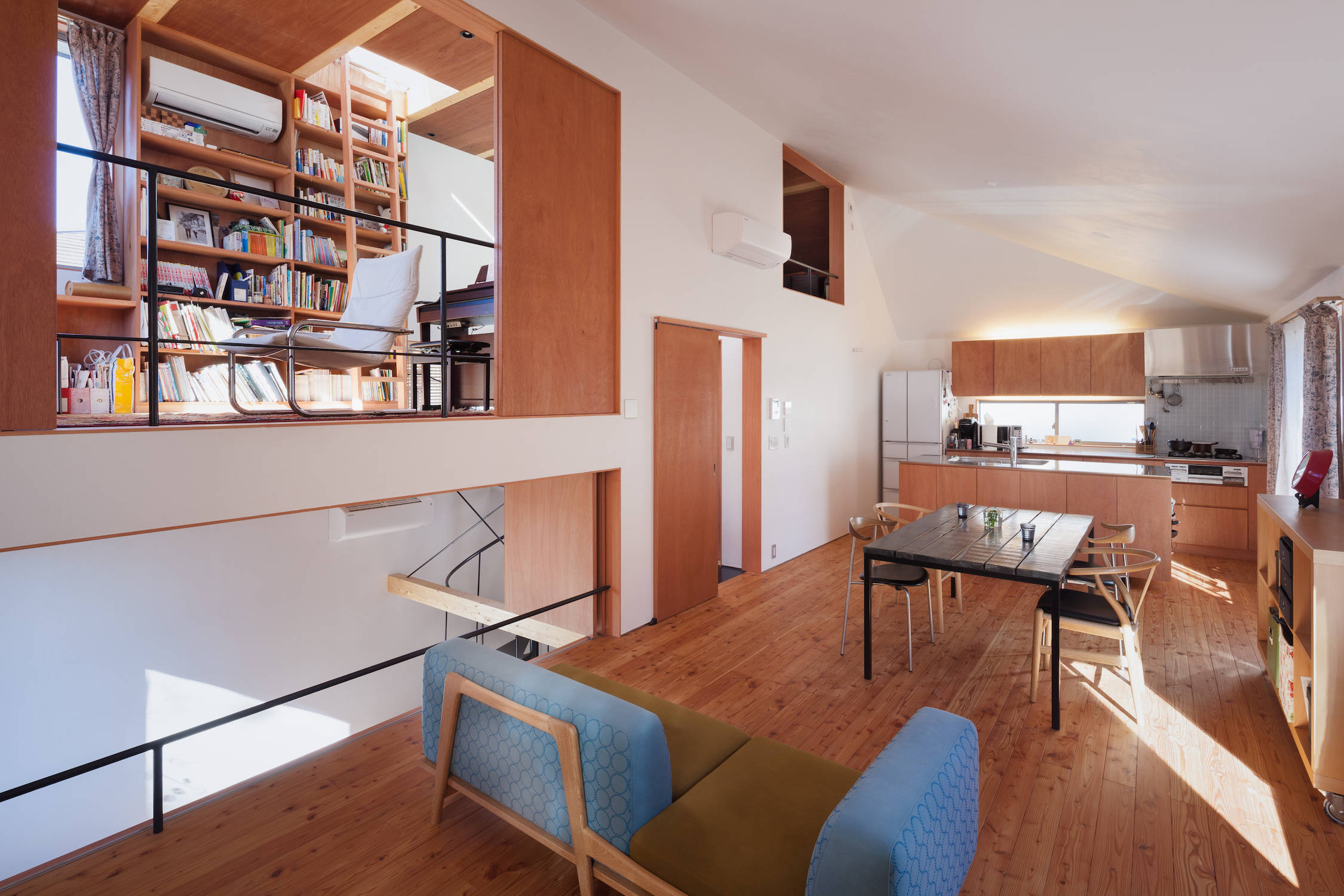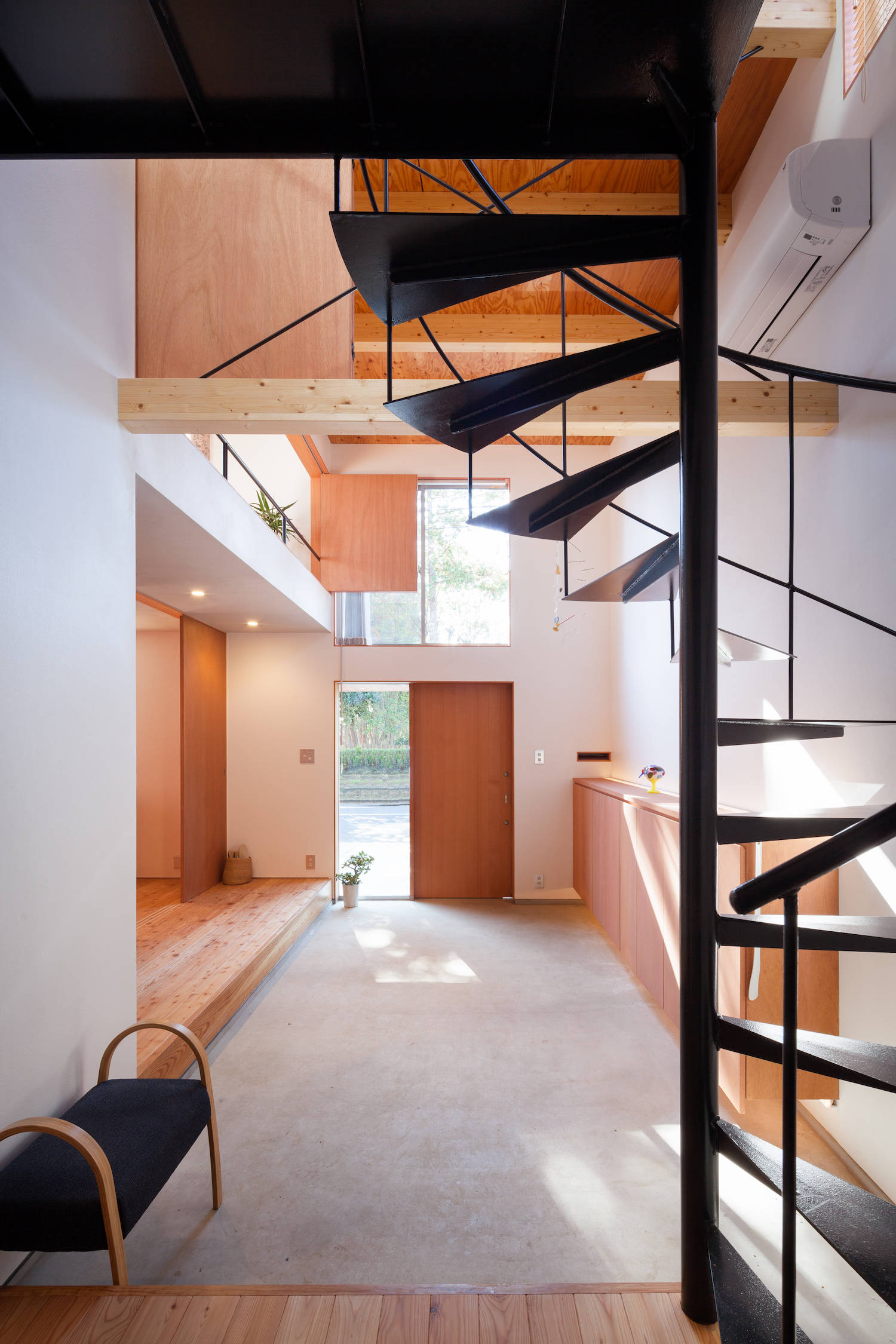 12畳天井高4.1mの大きな土間が玄関となった住宅です。片流れ屋根の下には、家族が集まる様々なスペースがあり、スキップフロアーで繋がります。