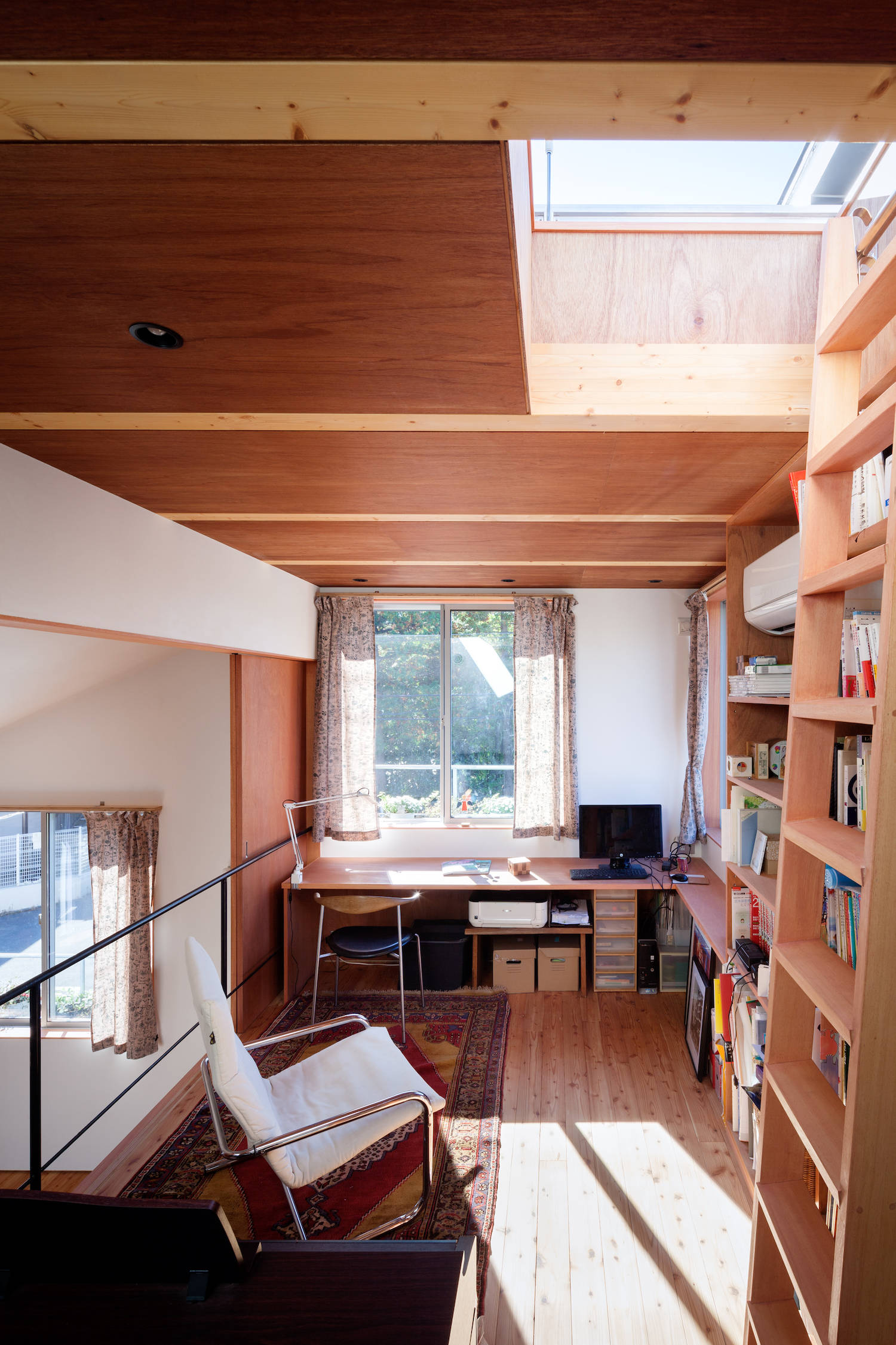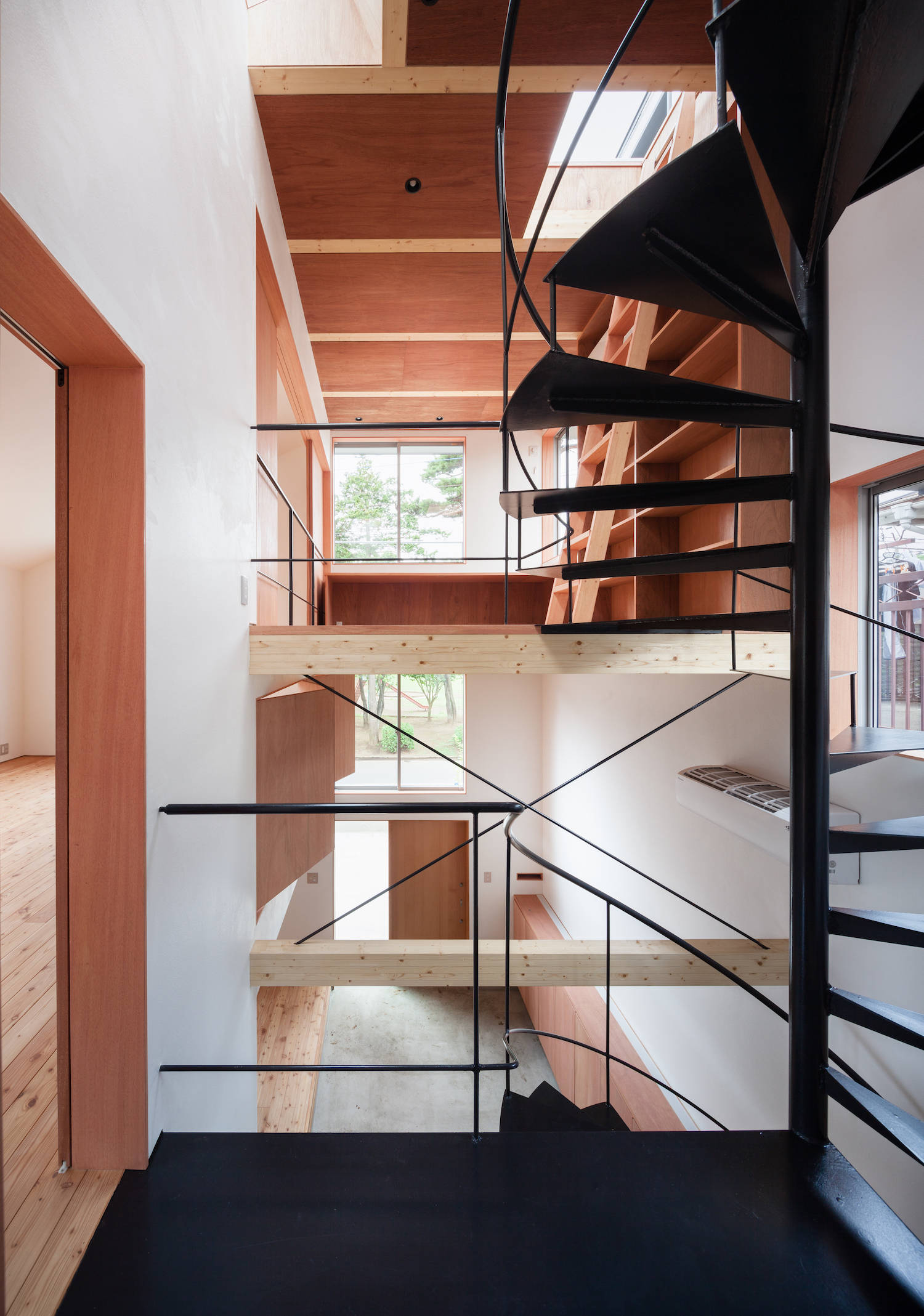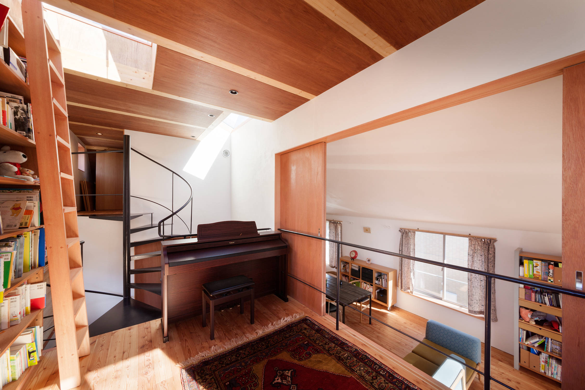 12畳天井高4.1mの大きな土間が玄関となった住宅です。片流れ屋根の下には、家族が集まる様々なスペースがあり、スキップフロアーで繋がります。