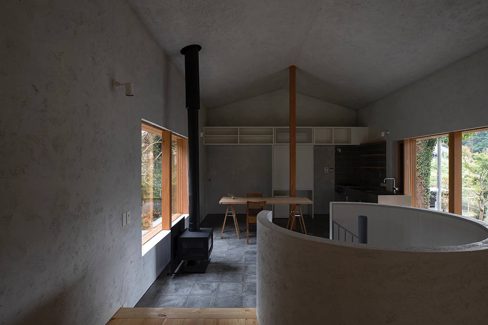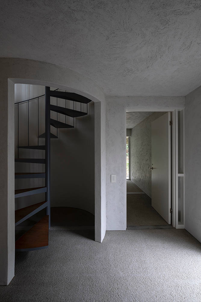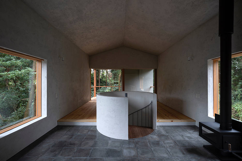 まず、螺旋階段を中心にシンメトリーの柱架構と、各面で統一した開口部をもつ単純な矩形を敷地中央付近に配置し、自然の中に建築の領域を設定した。高さ方向は周囲の樹木に呼応するよう最高高さを7mとし、1階天井高を抑えて2階の気積を確保しつつ、3方向の開口部によって森との距離を近づけた。壁は砂漆喰によって架構を覆い塗り込めることで、建築自体が敷地の中の雑多なものを視覚的に切り取る背景となる。シンメトリーで単純な柱スパンから成る骨格に対し、皮膚のような表層をかたちづくる壁のシークエンスと光の陰影が、自然の秩序を踏襲し、奥行きのある空間となることを考えた。
