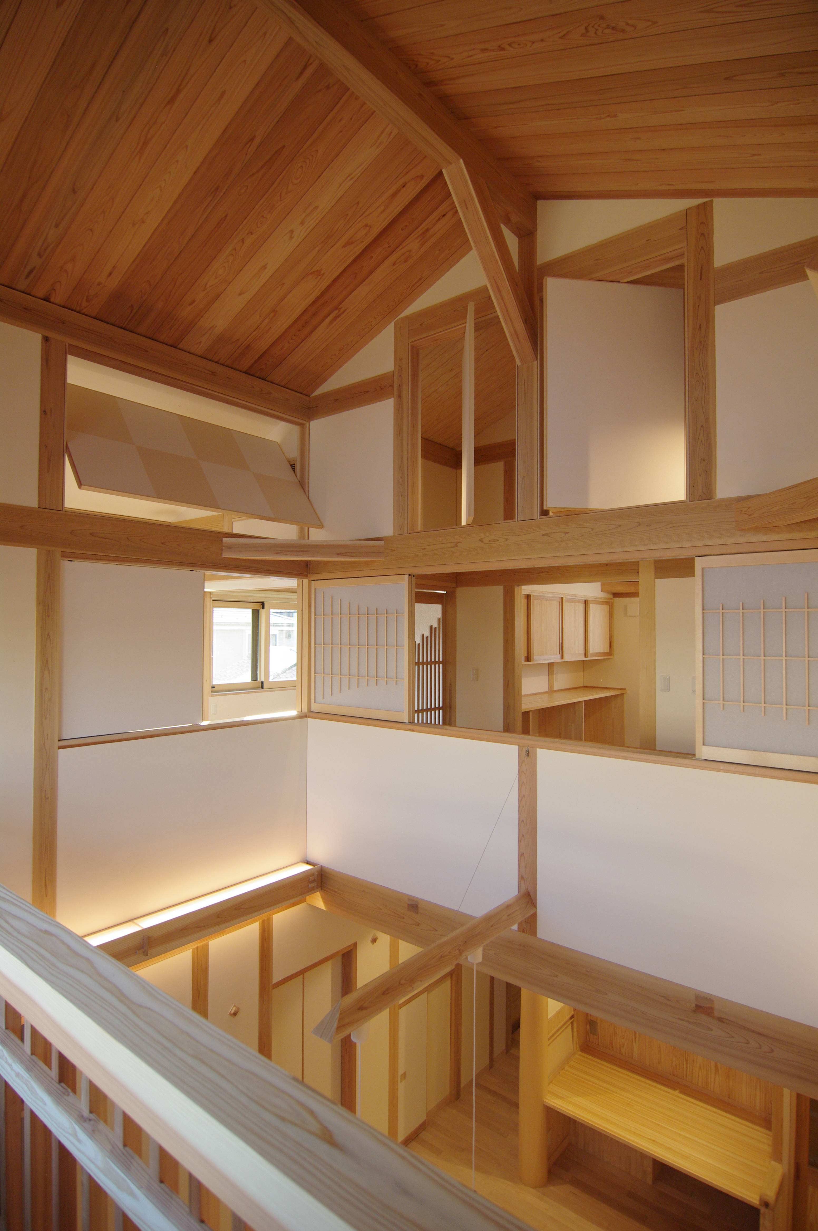 リビングの吹き抜けは、回転欄間で家全体の換気空間にも機能。