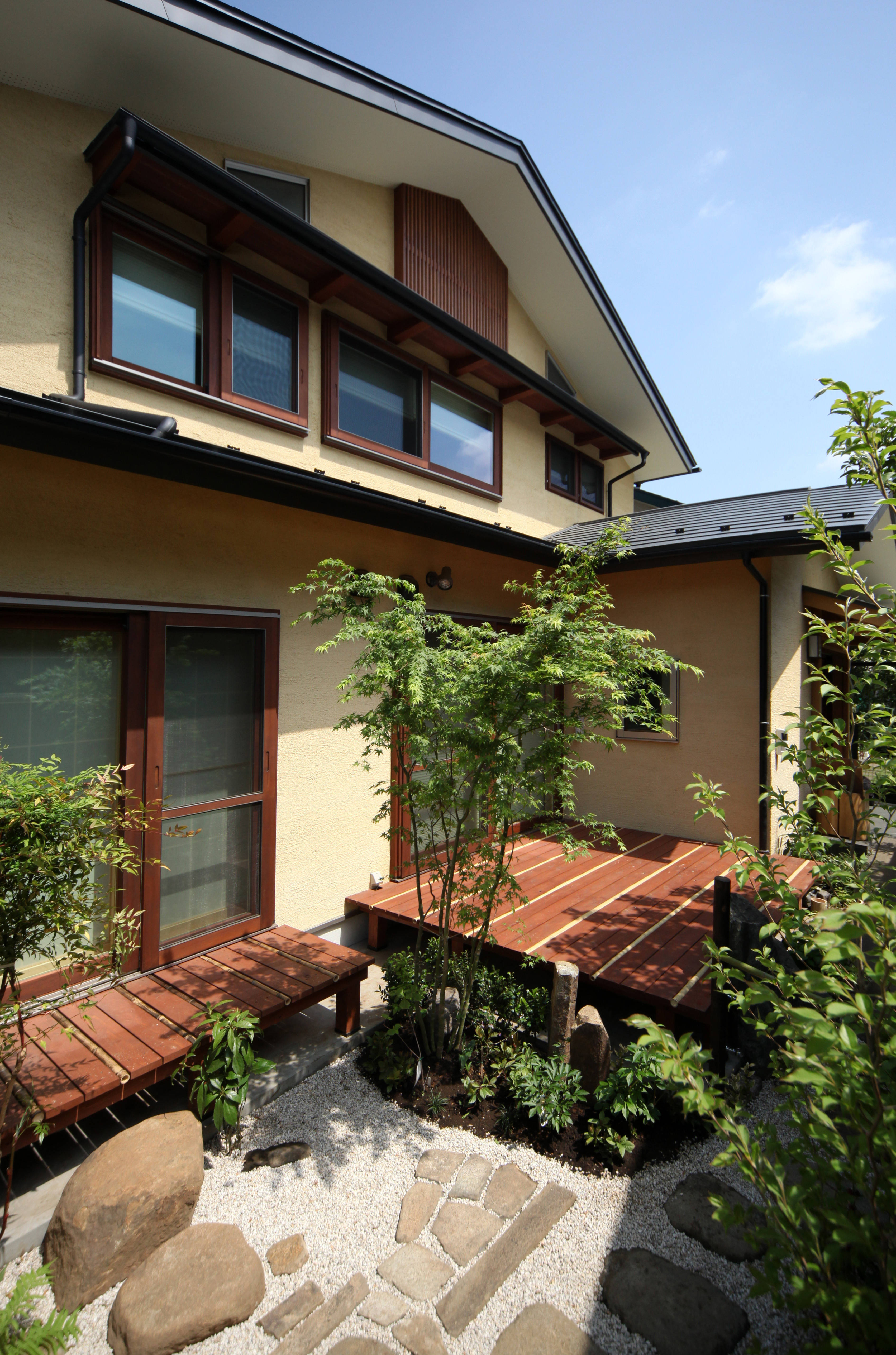 茶庭とウッドデッキに面したモダン和風のデザイン