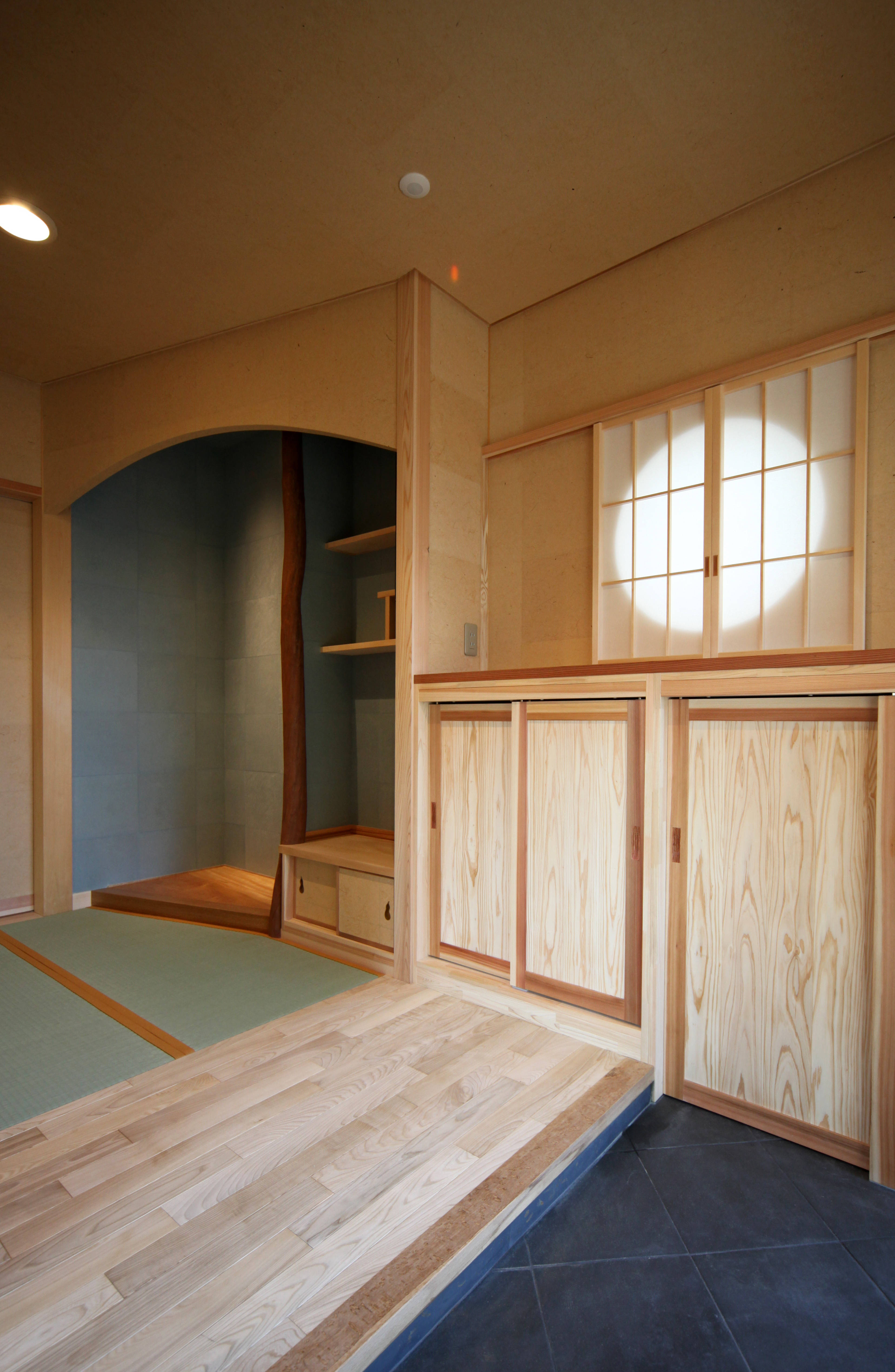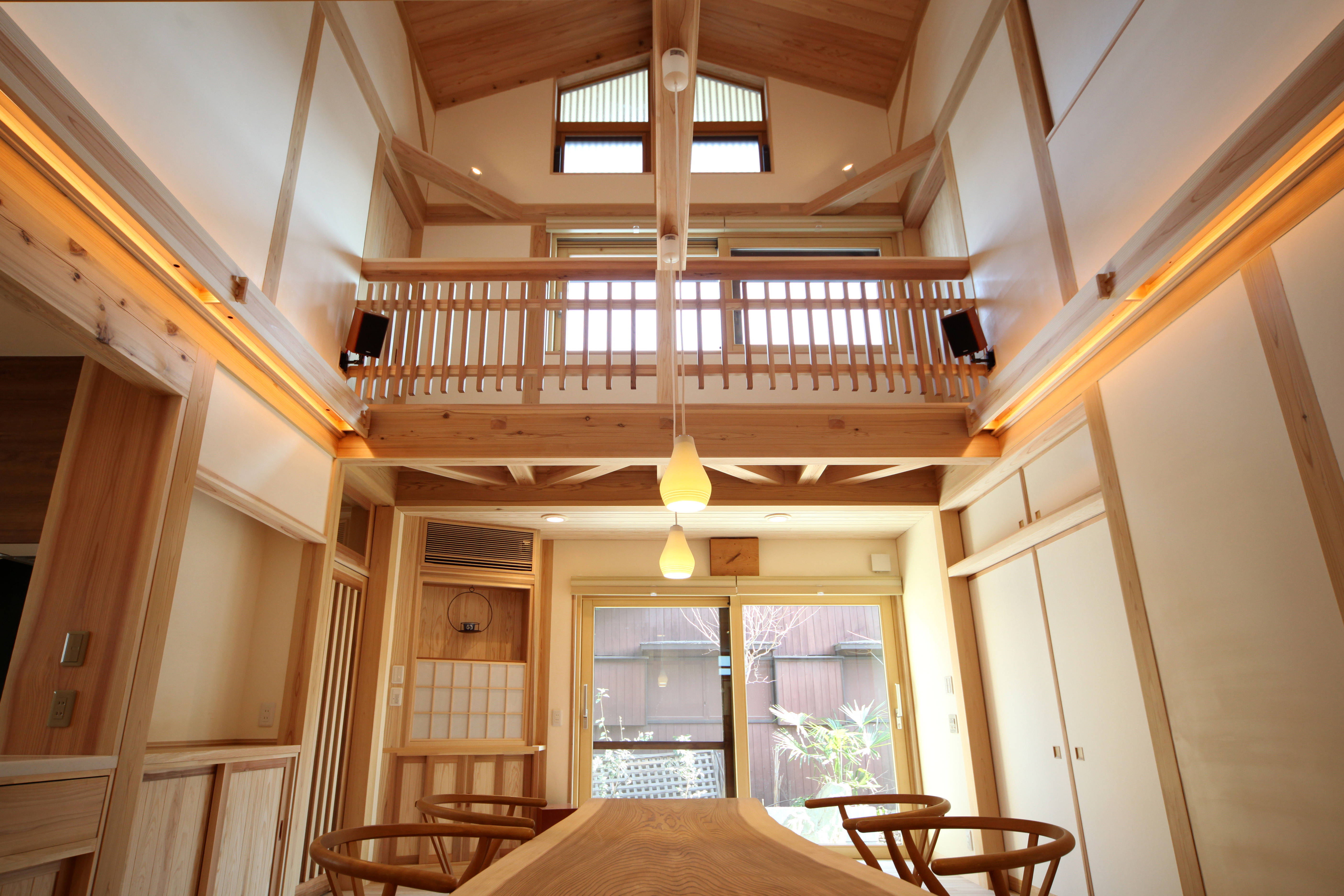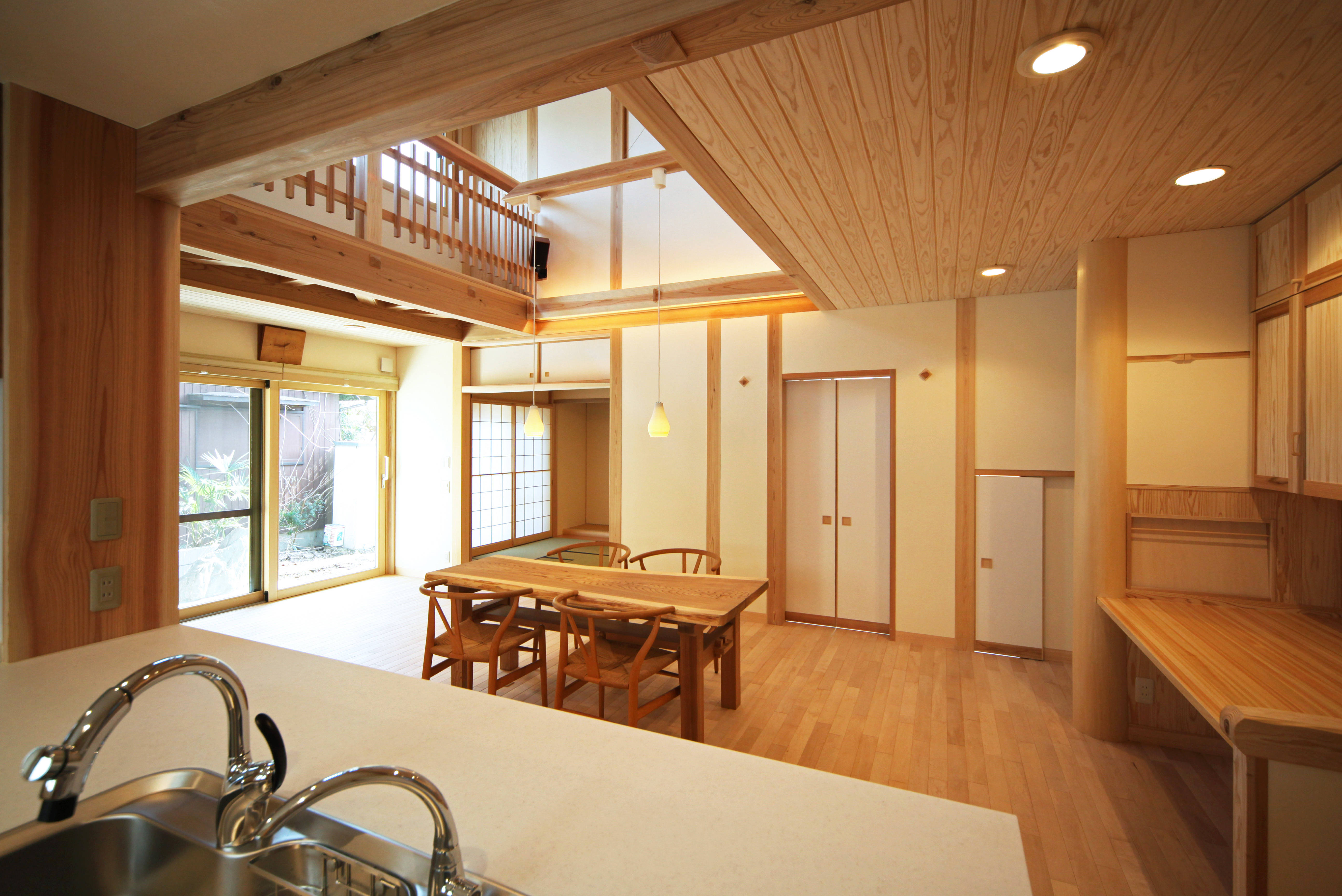 奈良・吉野の杉、桧を産直し、漆喰、手すき和紙など自然素材の木の家。吹き抜けのあるひろまを中心に、1階で生活機能を満足させたひろま型プランニング。温水床暖房と家全体を木の繊維の断熱材で覆った省エネ設計。