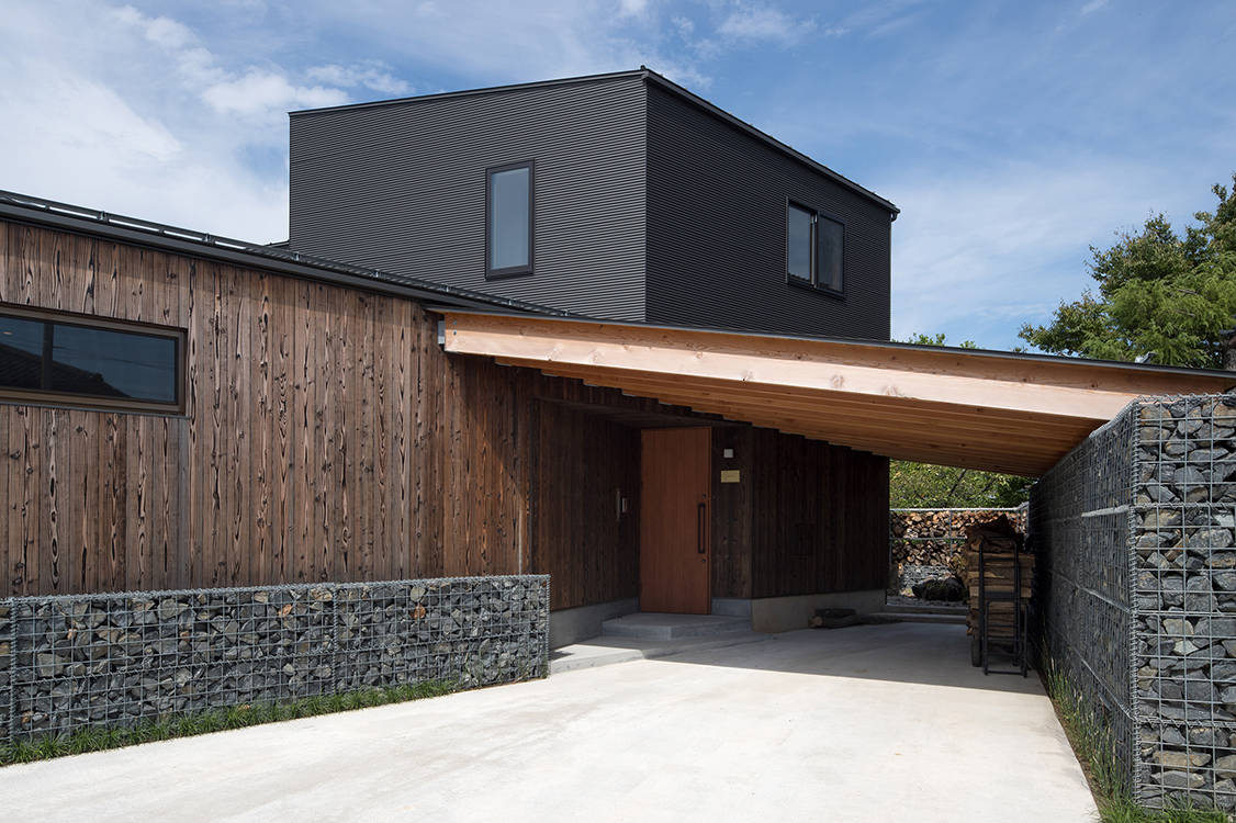 外壁は自然と共鳴する素材の焼杉板と割肌を残す石積みの石籠(蛇籠)を用いりました。