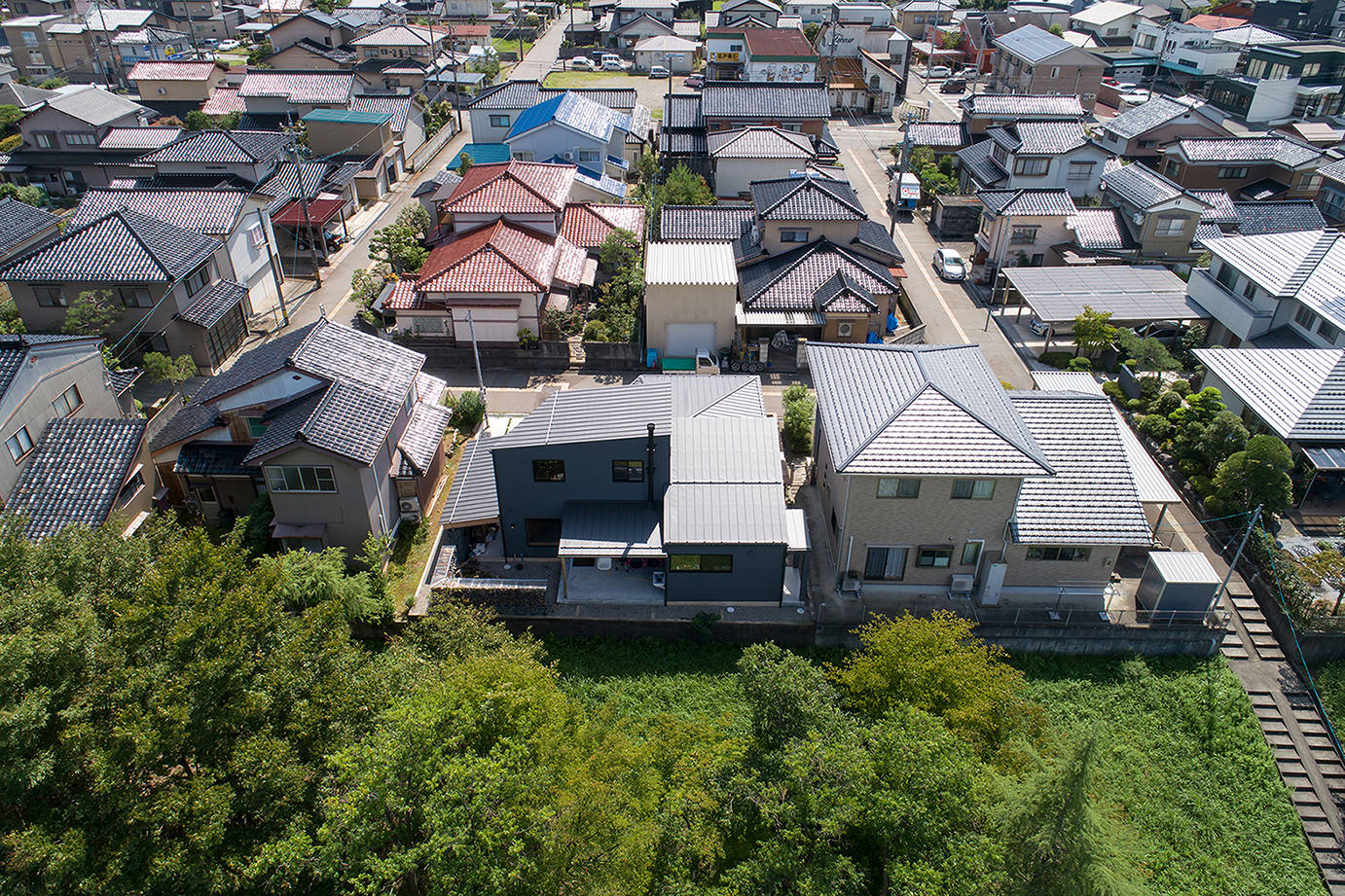 敷地は富山県射水市中太閤山の住宅団地にあり、敷地の北側に高低差3mほどの大きな公共の緑地帯が広がっており、これを設計の手掛かりとしました。