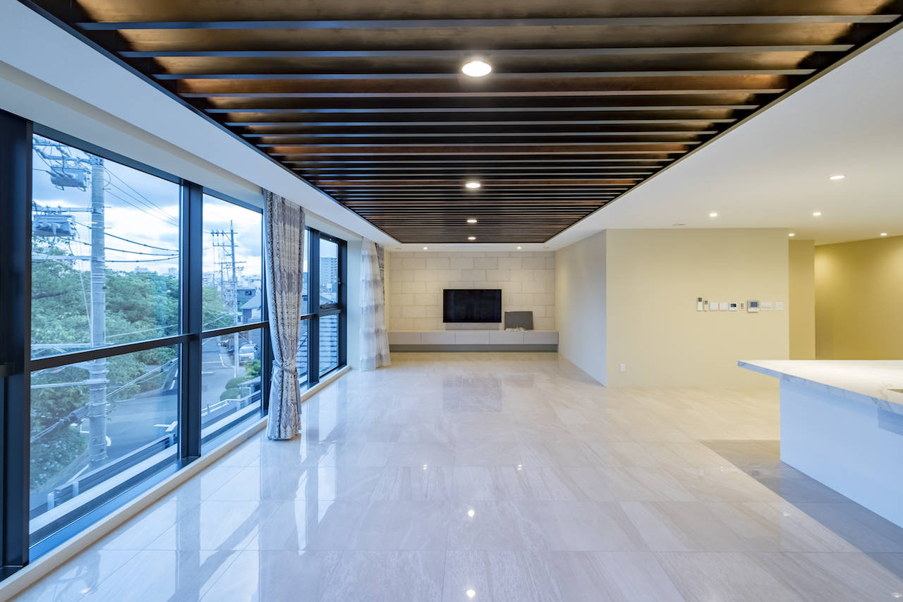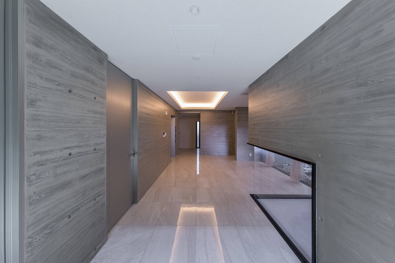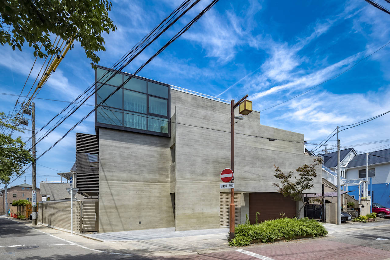 RC打放しのマッシブな躯体にカーテウォールサッシ、木板のオーバースライダー、せっ器質の有孔ブロック、木調の市松スクリーンをまとうことで街との調停を図っている。