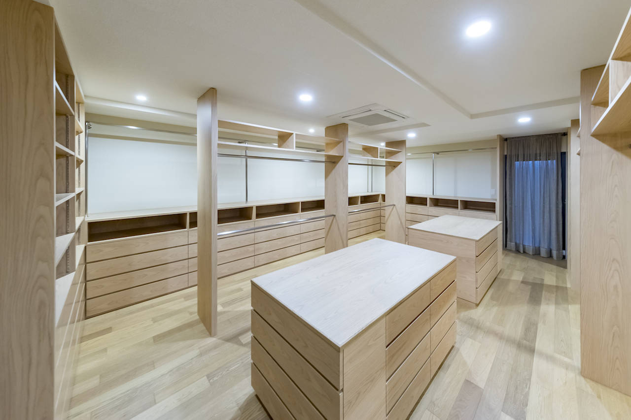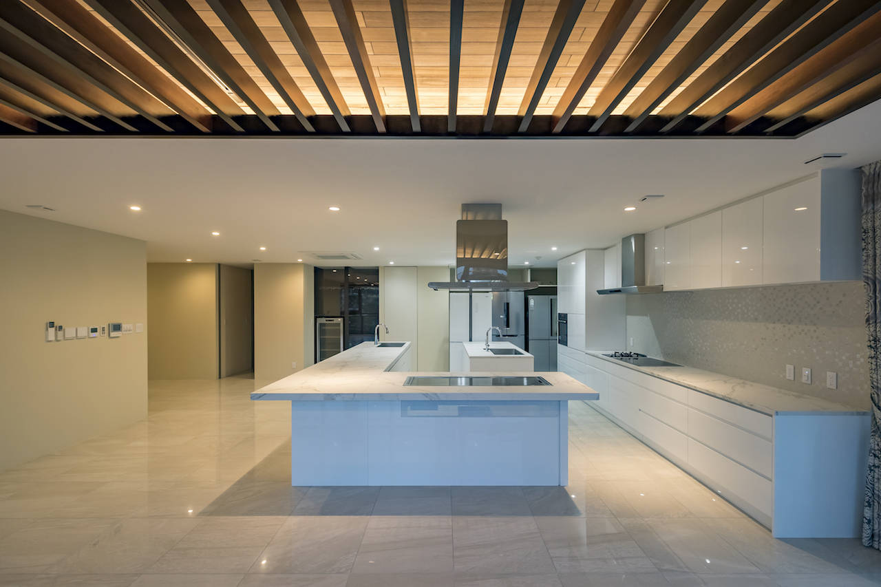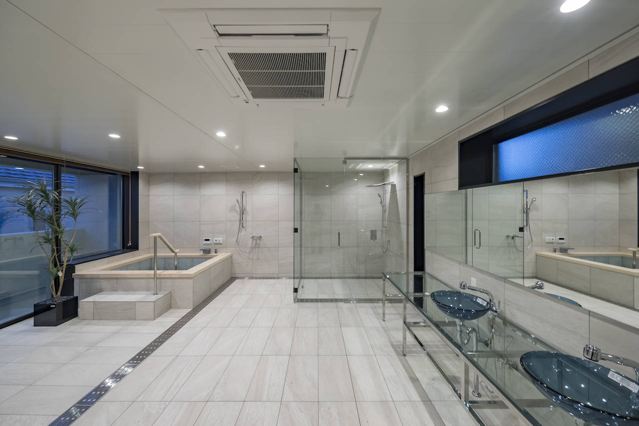 RC打放しのマッシブな躯体にカーテウォールサッシ、木板のオーバースライダー、せっ器質の有孔ブロック、木調の市松スクリーンをまとうことで街との調停を図っている。