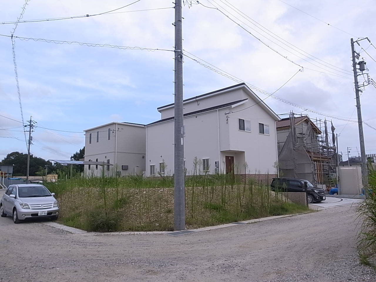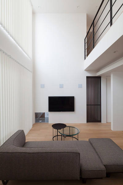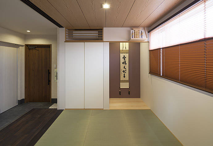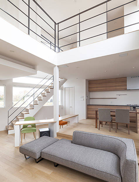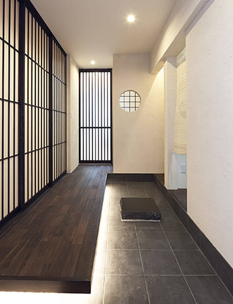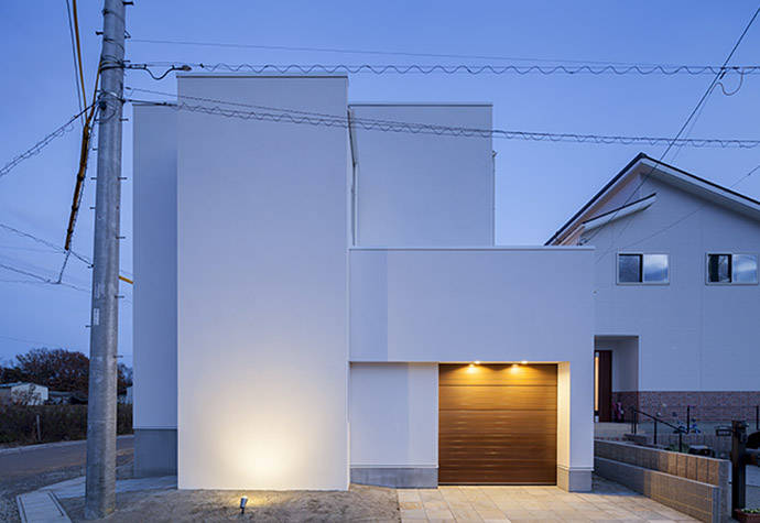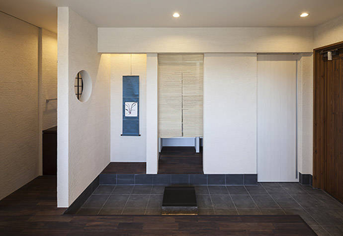 区画整理された土地を余すところなく、地形に沿った平面計画、高低差に合わせたスキップフロア、中庭やビルトインガレージも確保した住宅である。玄関は通り土間風とし和室と一体的な空間となる。