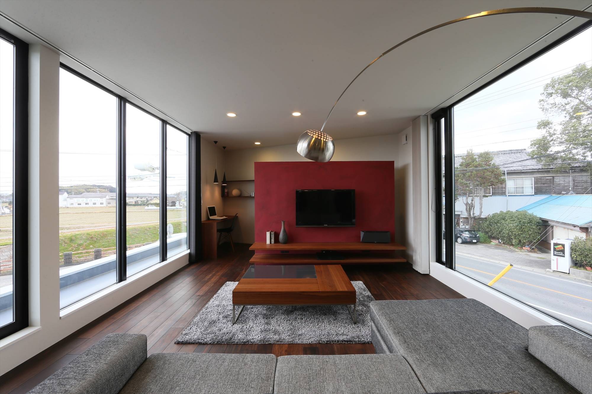 愛知県西尾市の田園のどかなロケーション建つ家。変形敷地に添うようくの字の配置計画とすることで中庭を確保。居住空間のメインであるLDKは2階とし、開口を南北に大胆に解放している。