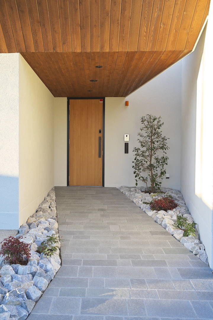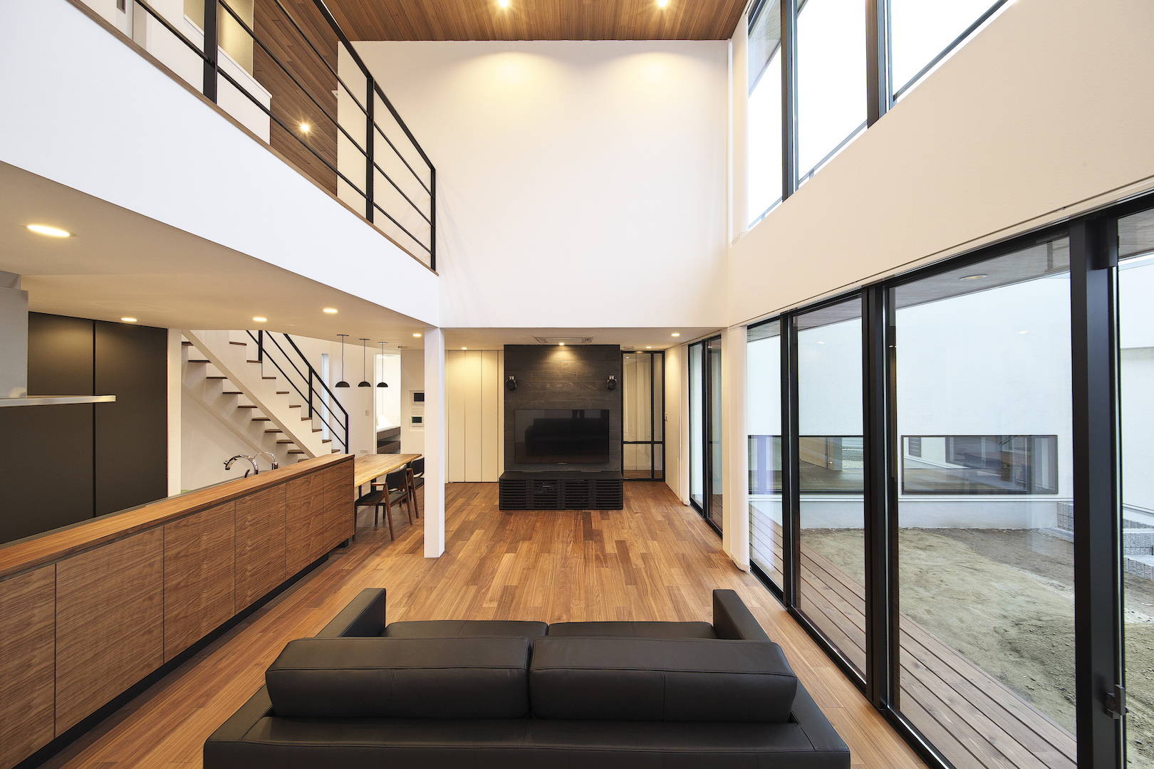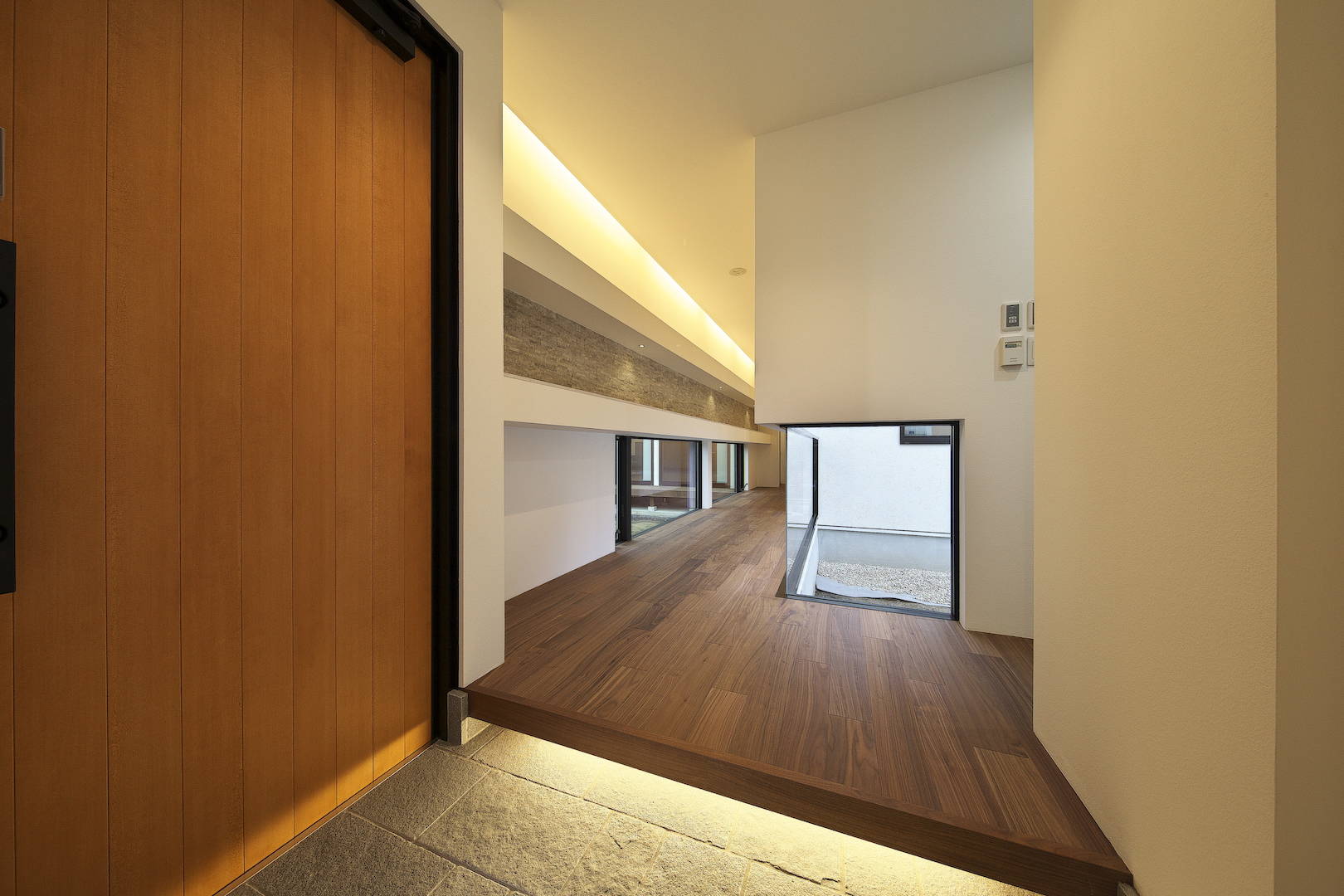 玄関アプローチとガレージシャッターを水平基調な1つのゲートに。シャッター向こうは実は中庭。玄関から続く渡り廊下で地窓に中庭を感じ、リビング空間に達しその全景を知ることになる。