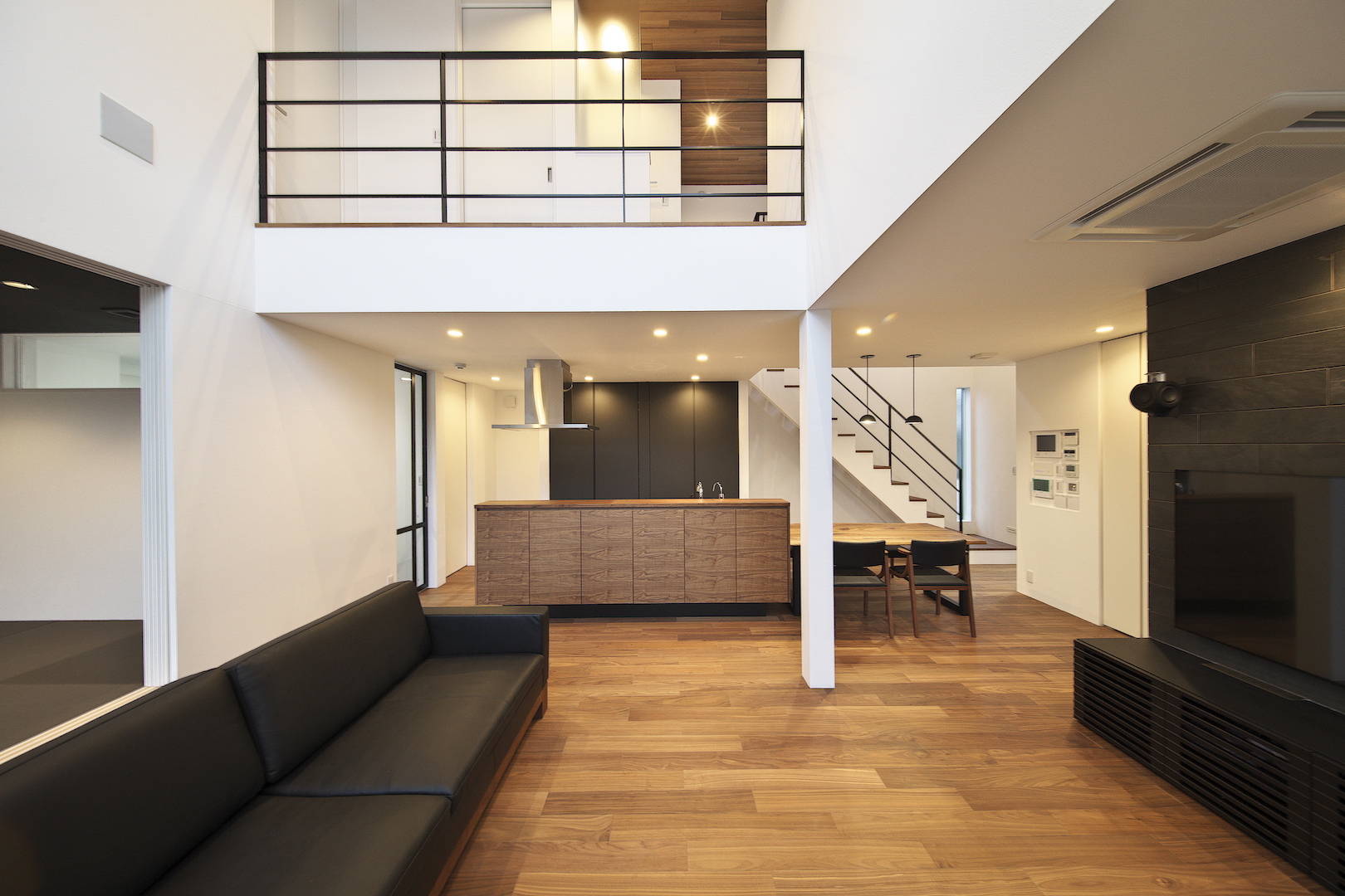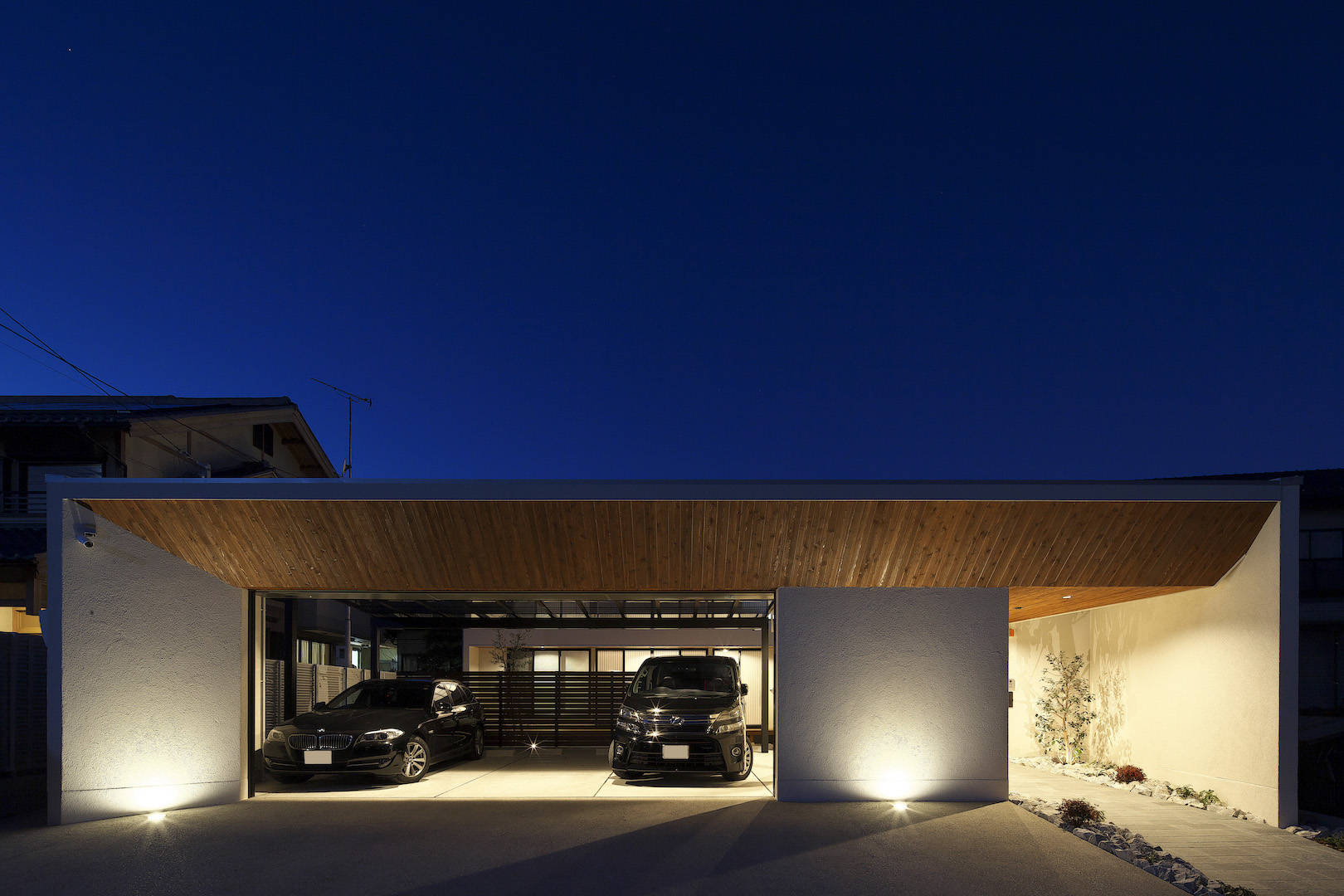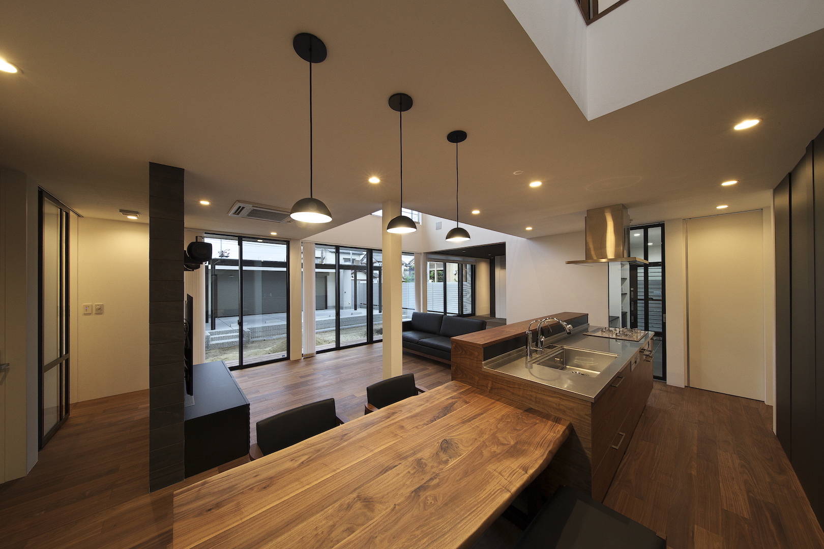 玄関アプローチとガレージシャッターを水平基調な1つのゲートに。シャッター向こうは実は中庭。玄関から続く渡り廊下で地窓に中庭を感じ、リビング空間に達しその全景を知ることになる。