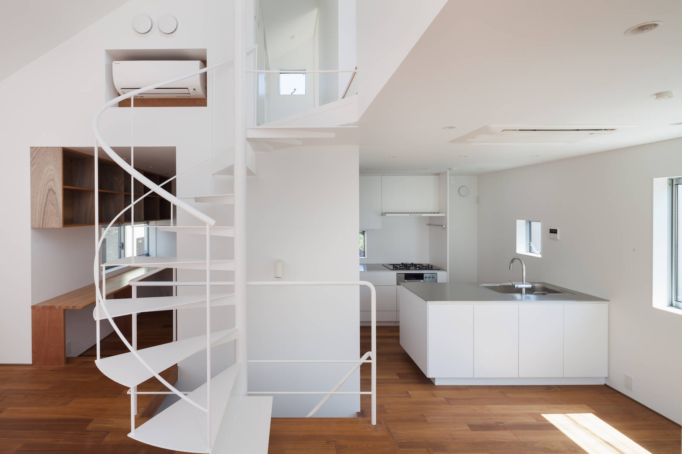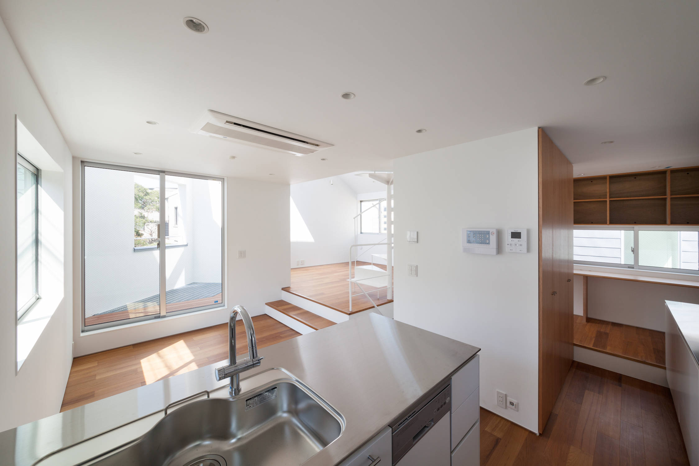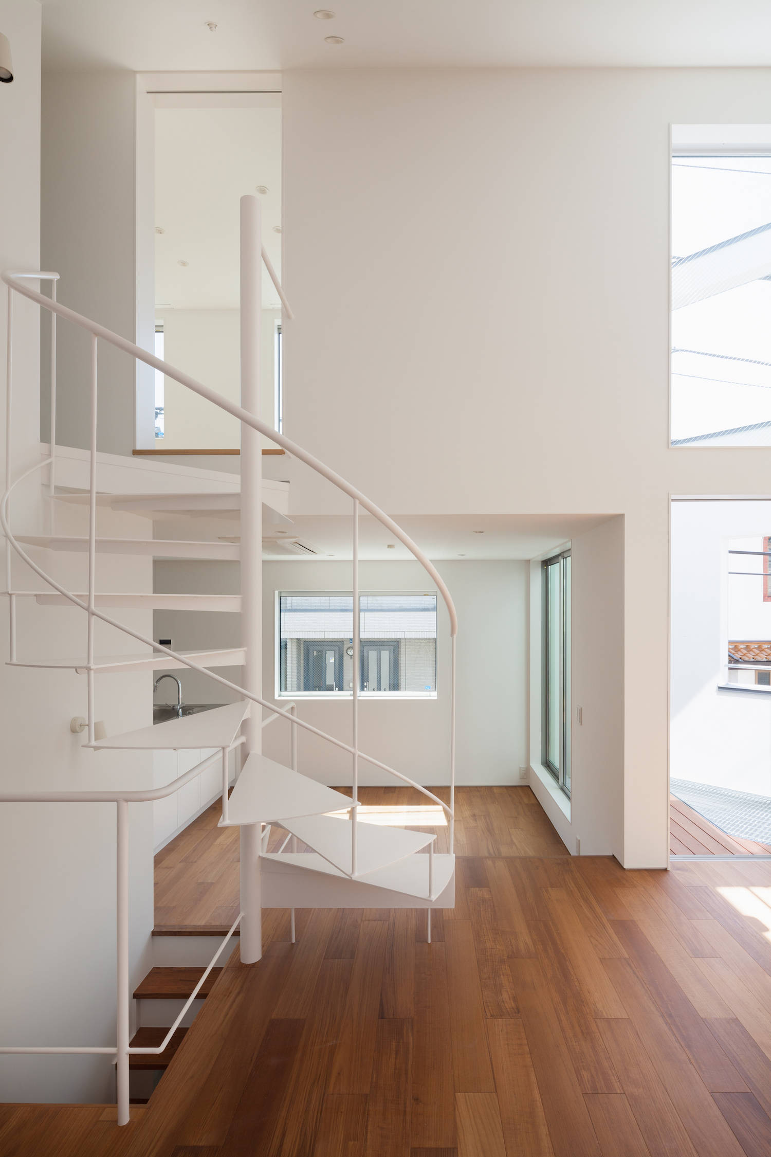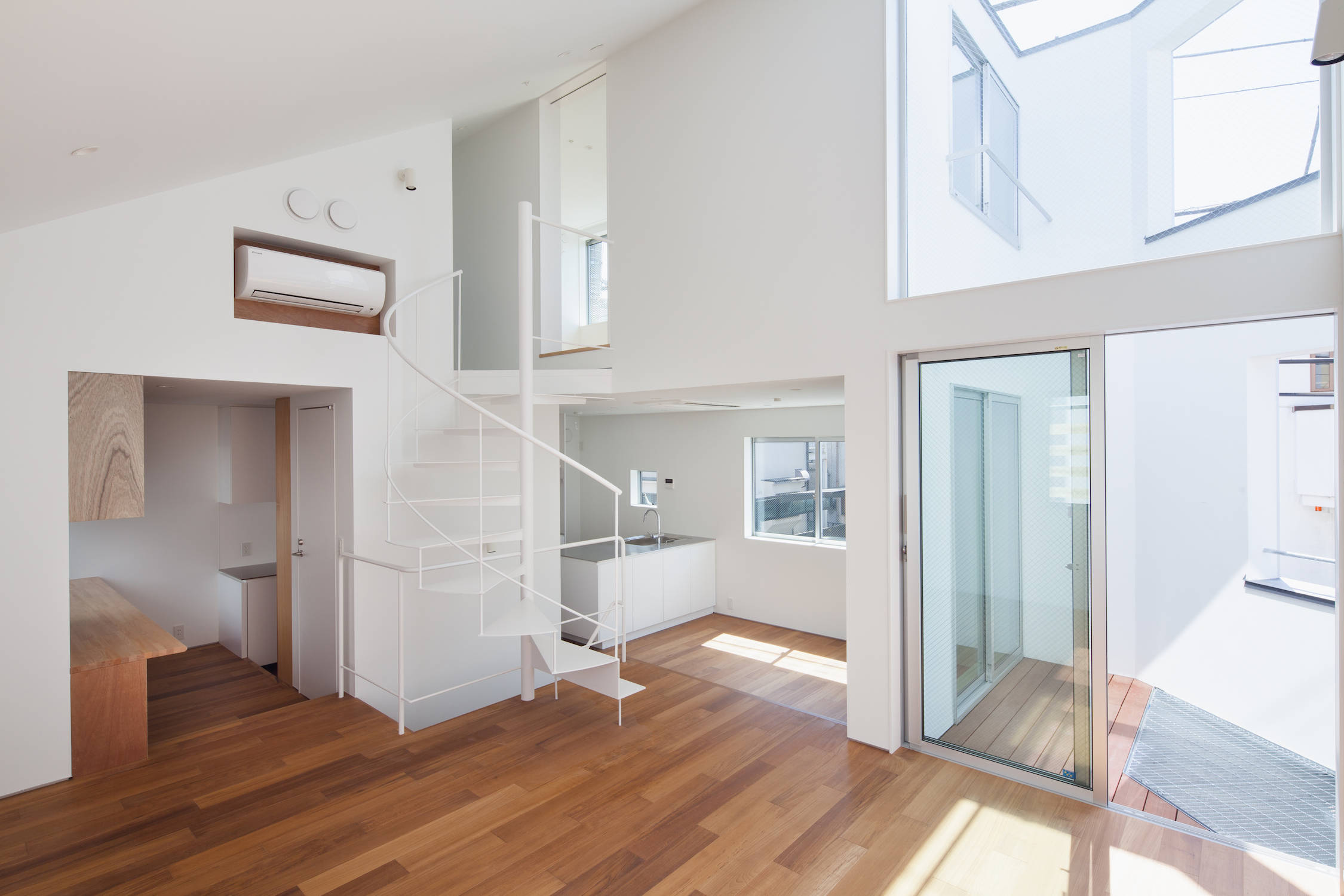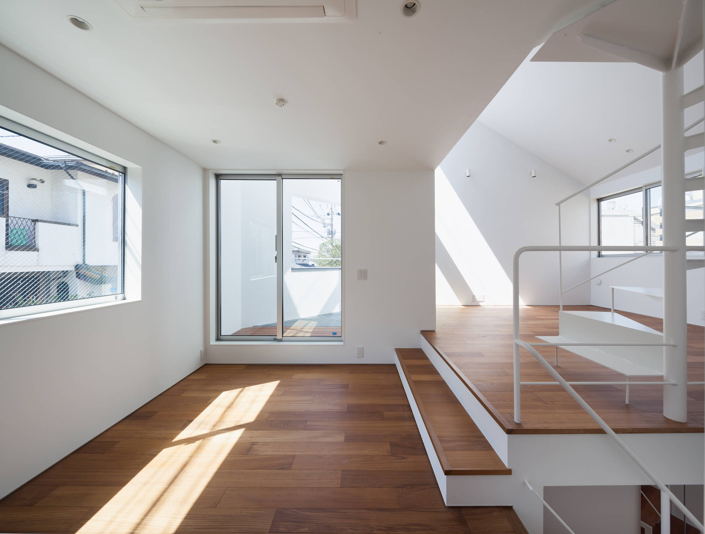 交差点に対して、壁で覆われた坪庭を設けています。各階の主立った部屋の開口部を積極的に坪庭に対して設けることで、建物のプライバシーを高めています。1階が水回りと寝室で作られた静かな空間であるのに対して、2階と3階は中央の水回りを軸にぐるぐる廻れる、スキップフロアを伴った回遊性が動きがある空間となっています。