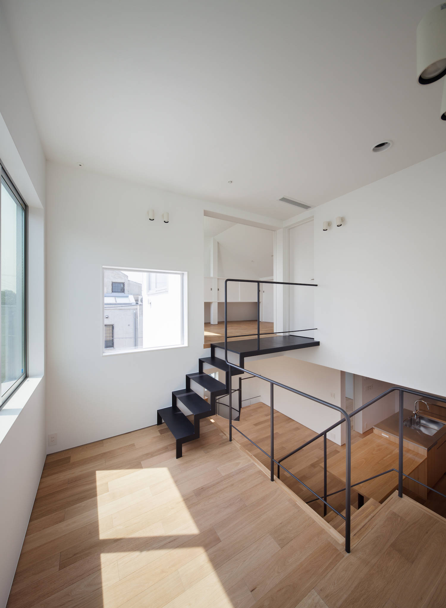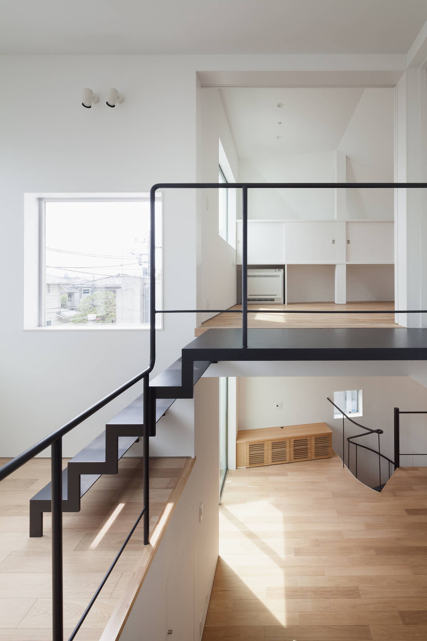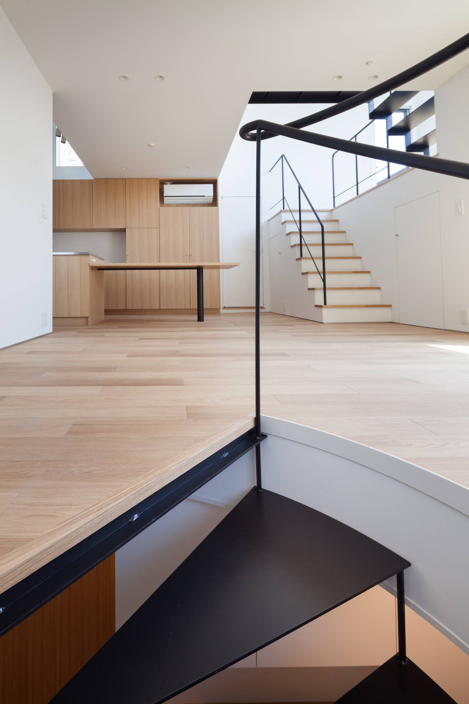玄関共用、1階が親世帯、2・3階が子世帯の二世帯住宅です。2階と3階の間に中間階を設けています。2階〜中間階〜3階となだらかに繋がることで、子世帯は、立体的なワンルーム空間となっています。中間階下の一部は、親世帯の明かりとりのための吹き抜けになっています。