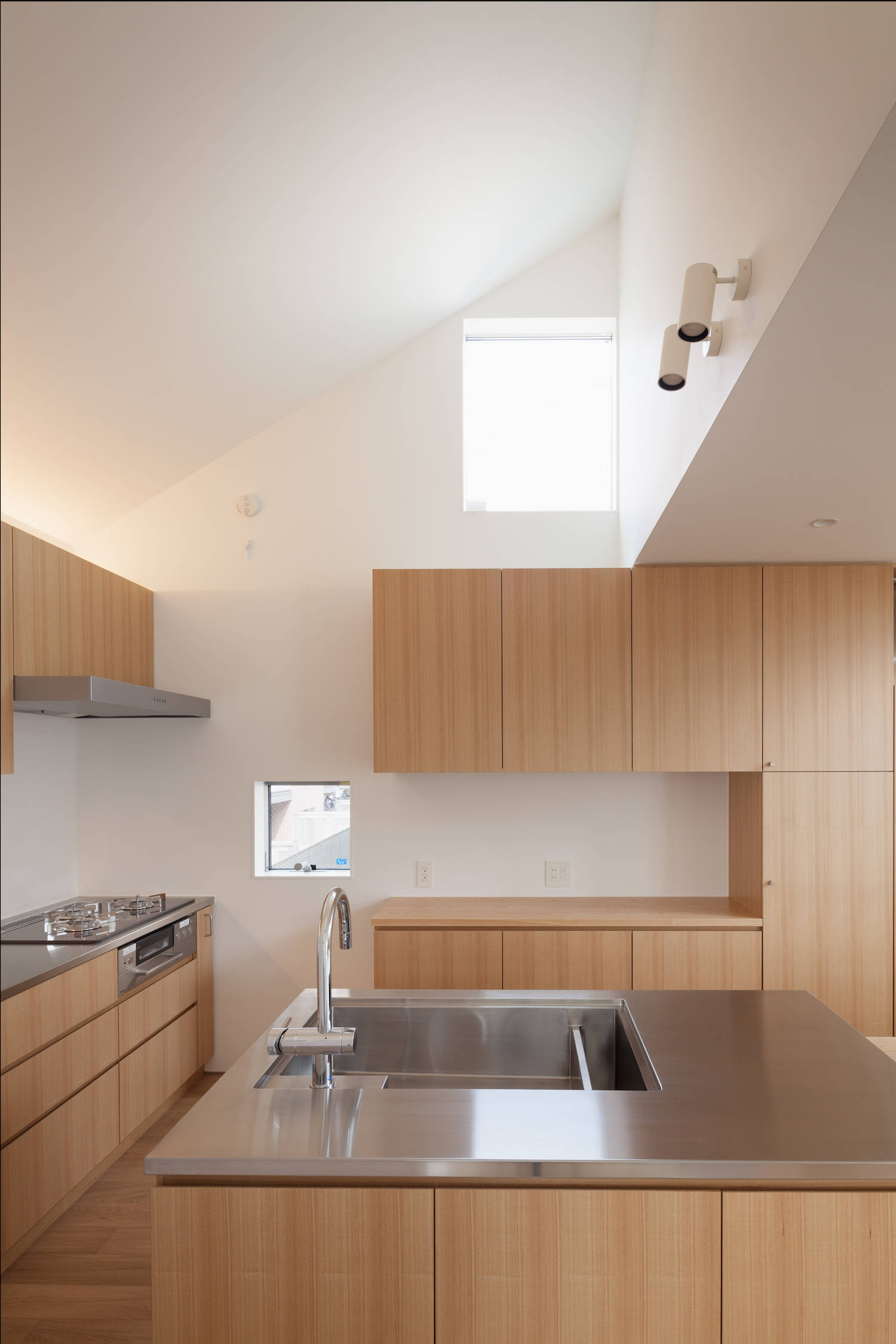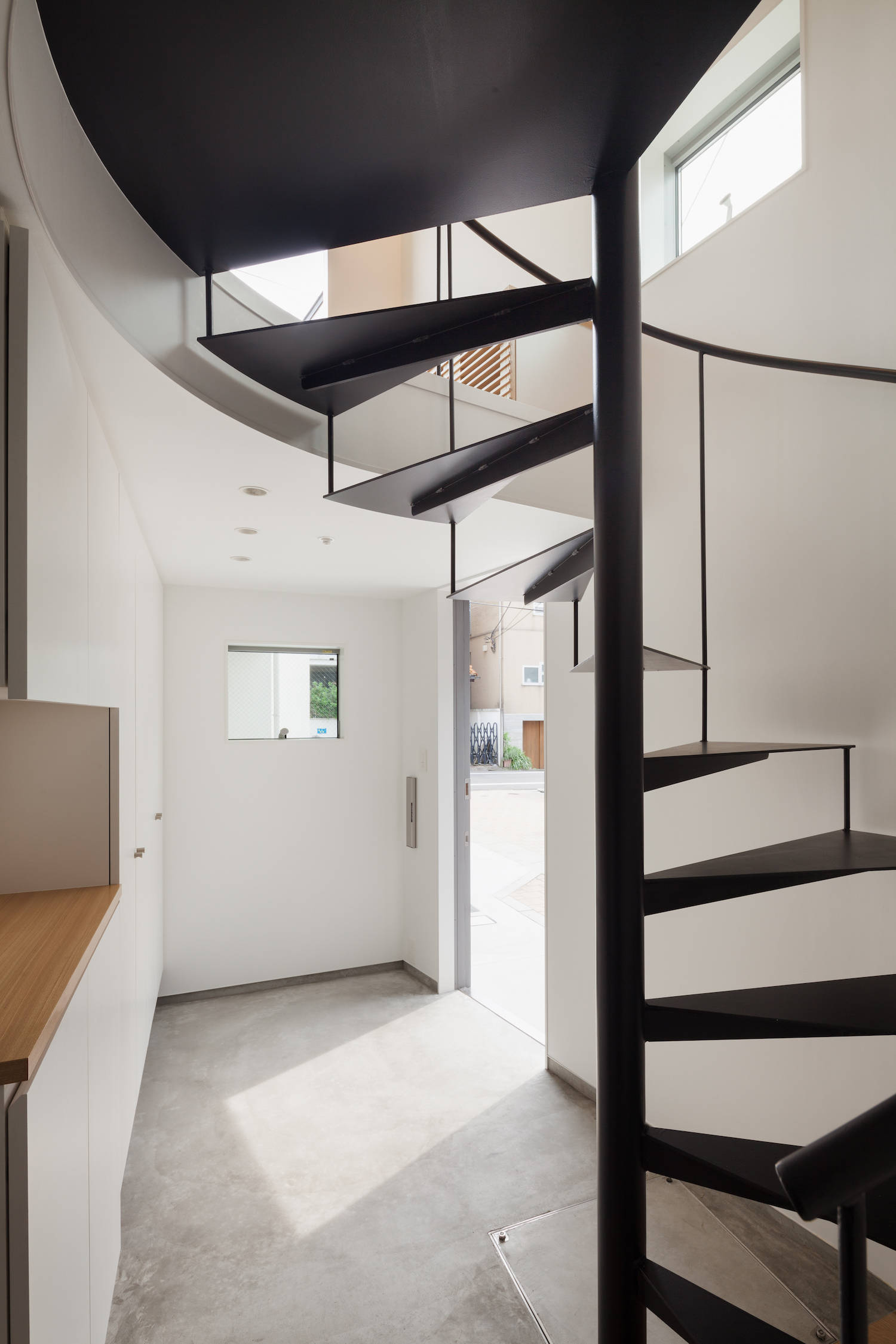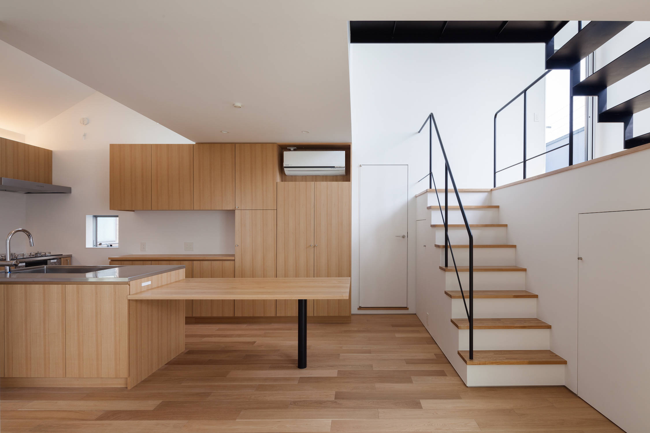 玄関共用、1階が親世帯、2・3階が子世帯の二世帯住宅です。2階と3階の間に中間階を設けています。2階〜中間階〜3階となだらかに繋がることで、子世帯は、立体的なワンルーム空間となっています。中間階下の一部は、親世帯の明かりとりのための吹き抜けになっています。