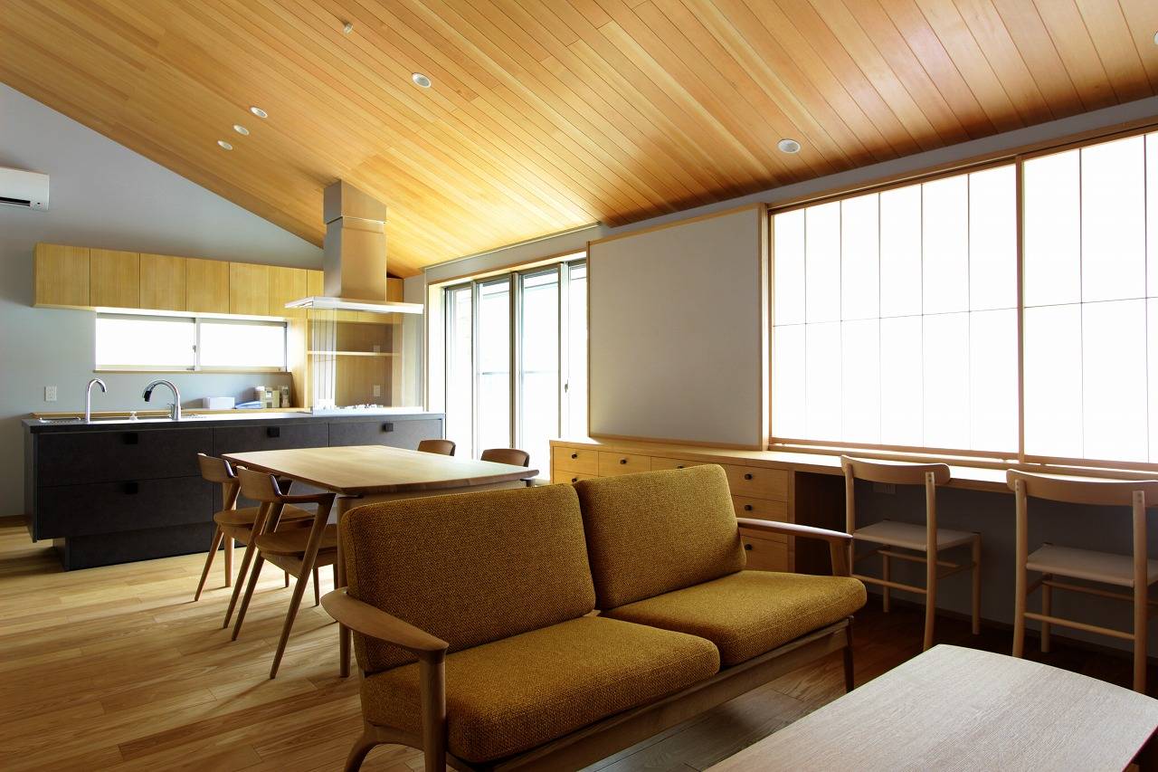 2階のリビングには開放的な吹き抜け計画。周辺の緑豊かな環境を住空間に巧みに取り込んでいます。