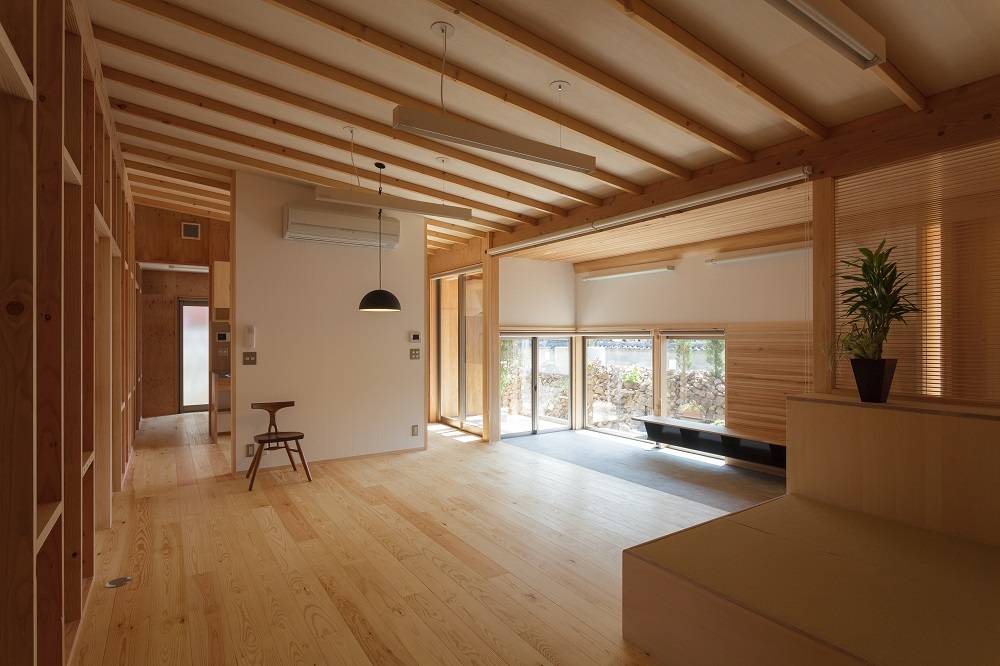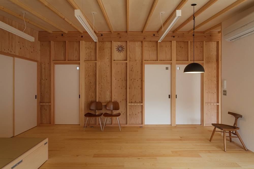 室内は4室の小さな個室以外は玄関も含めてワンルームとした。各室の間仕切りは、厚さ12mmの合板1枚で造り、最小限のプライバシーを確保している。仲の良い家族の現在の生活スタイルを活かし、次男さんの車椅子の生活を考慮した計画である。